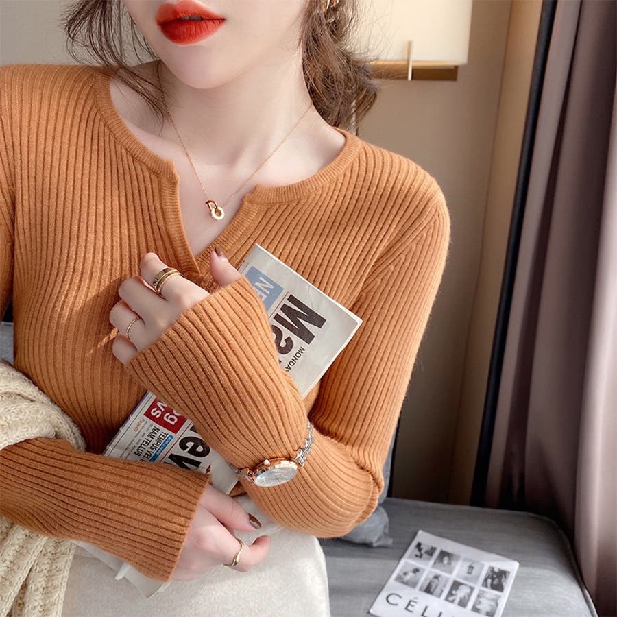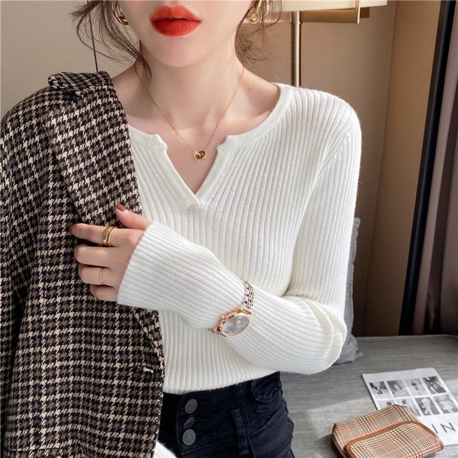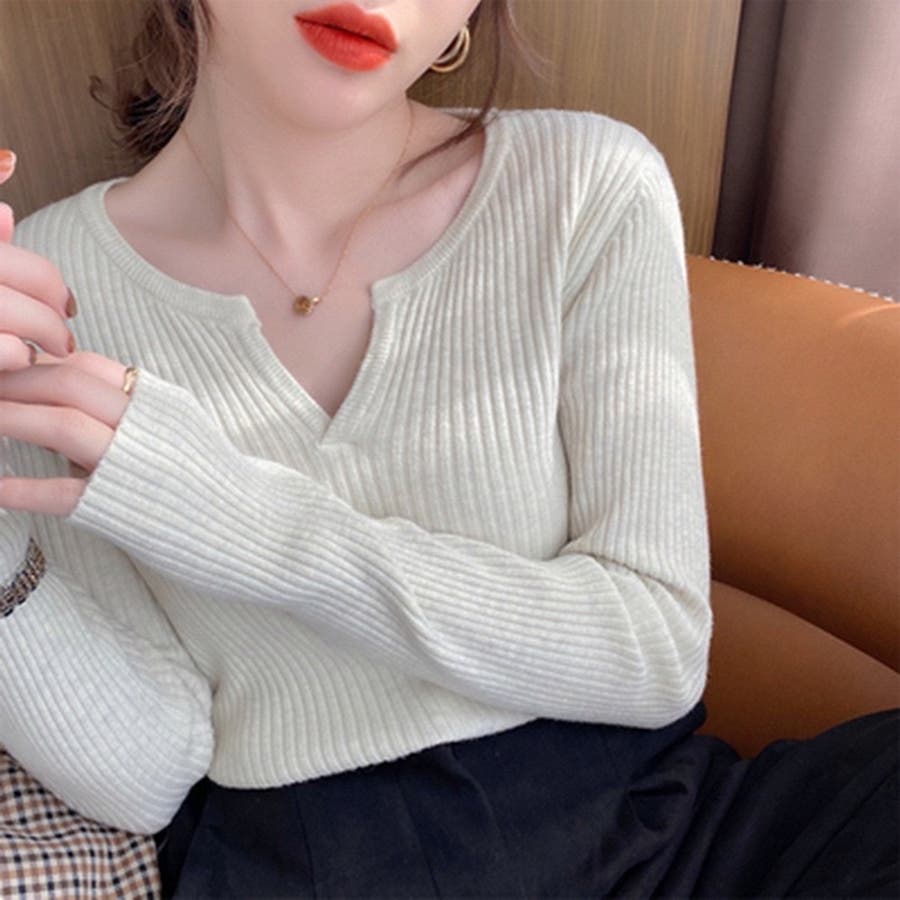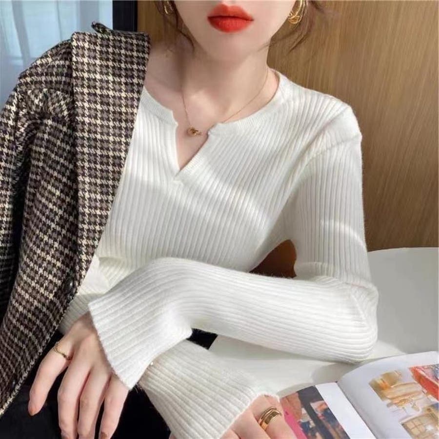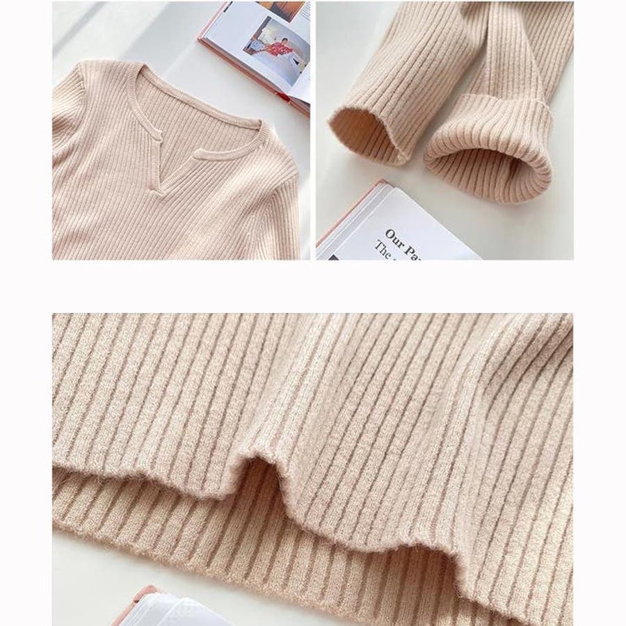 フロントに開いたVネックが女性らしいシルエットにしてくれるシンプルな長袖ニットトップス