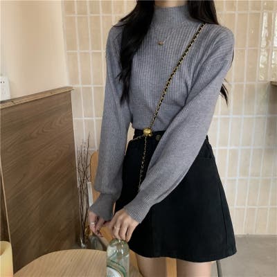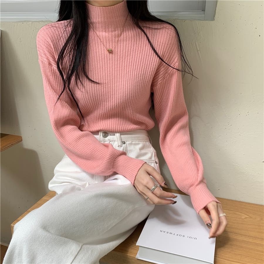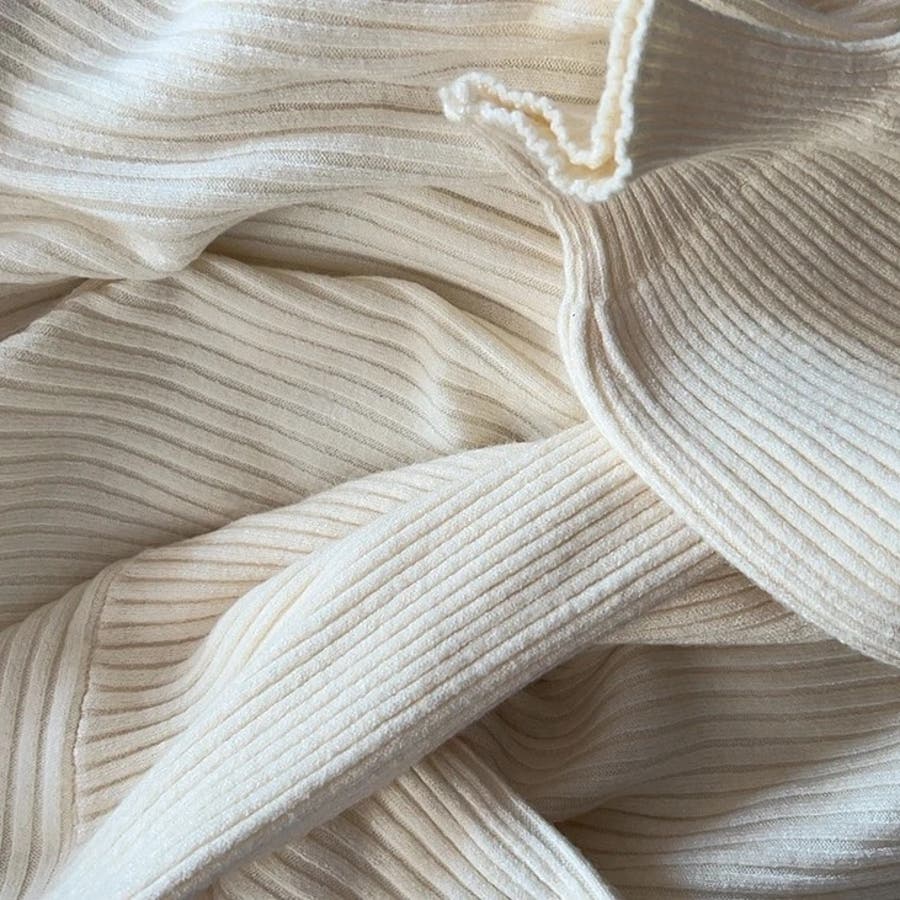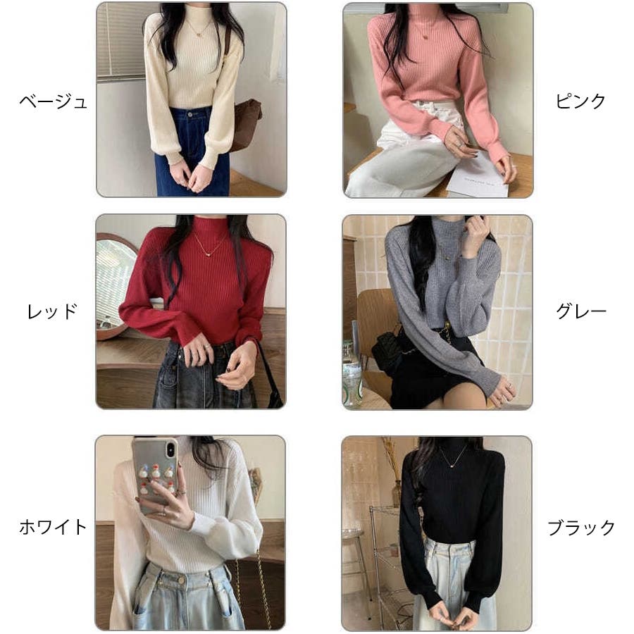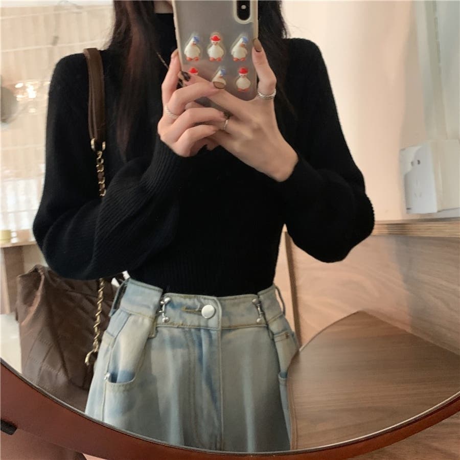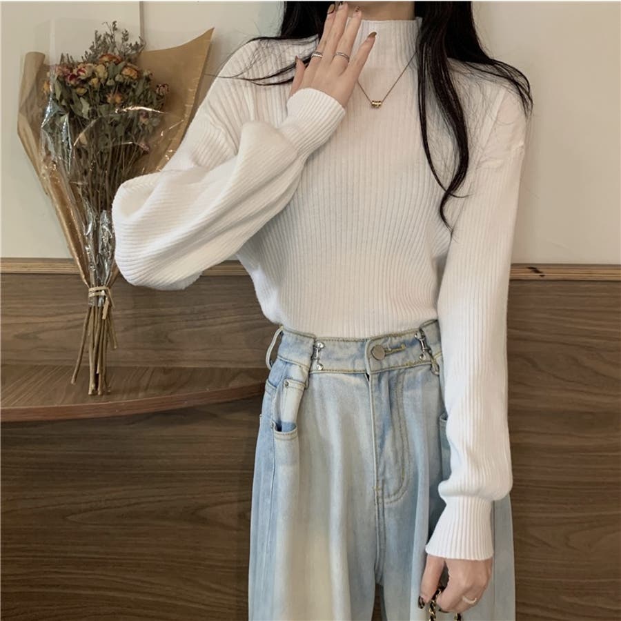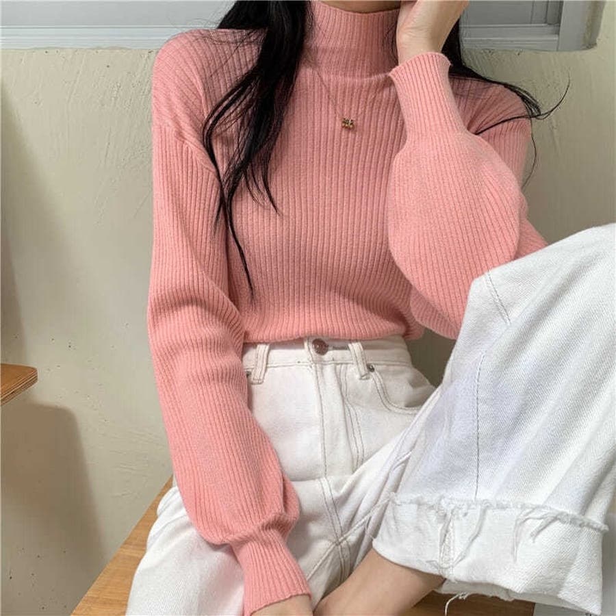 リブニット パフスリーブ ハイネック