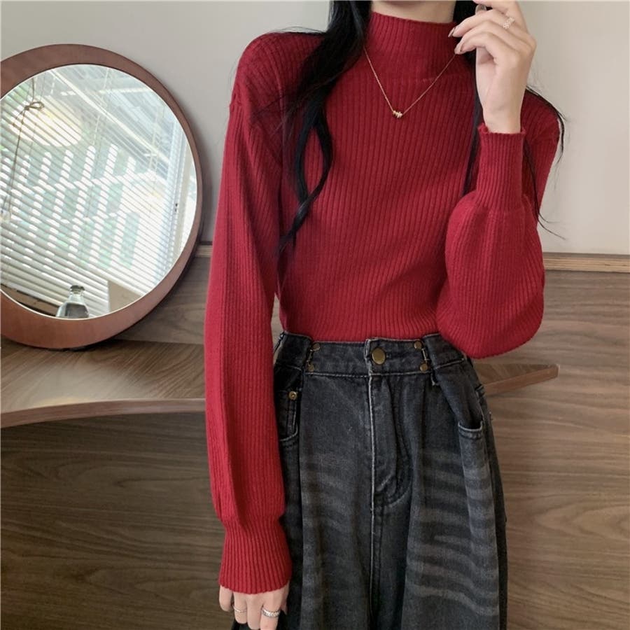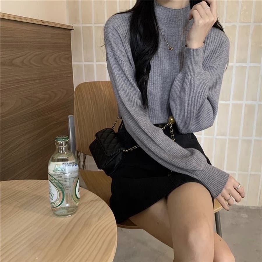 ゆとりのあるシルエットのハイネックボリューム袖ニット トップス。