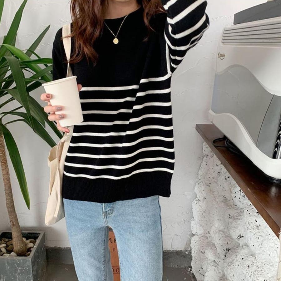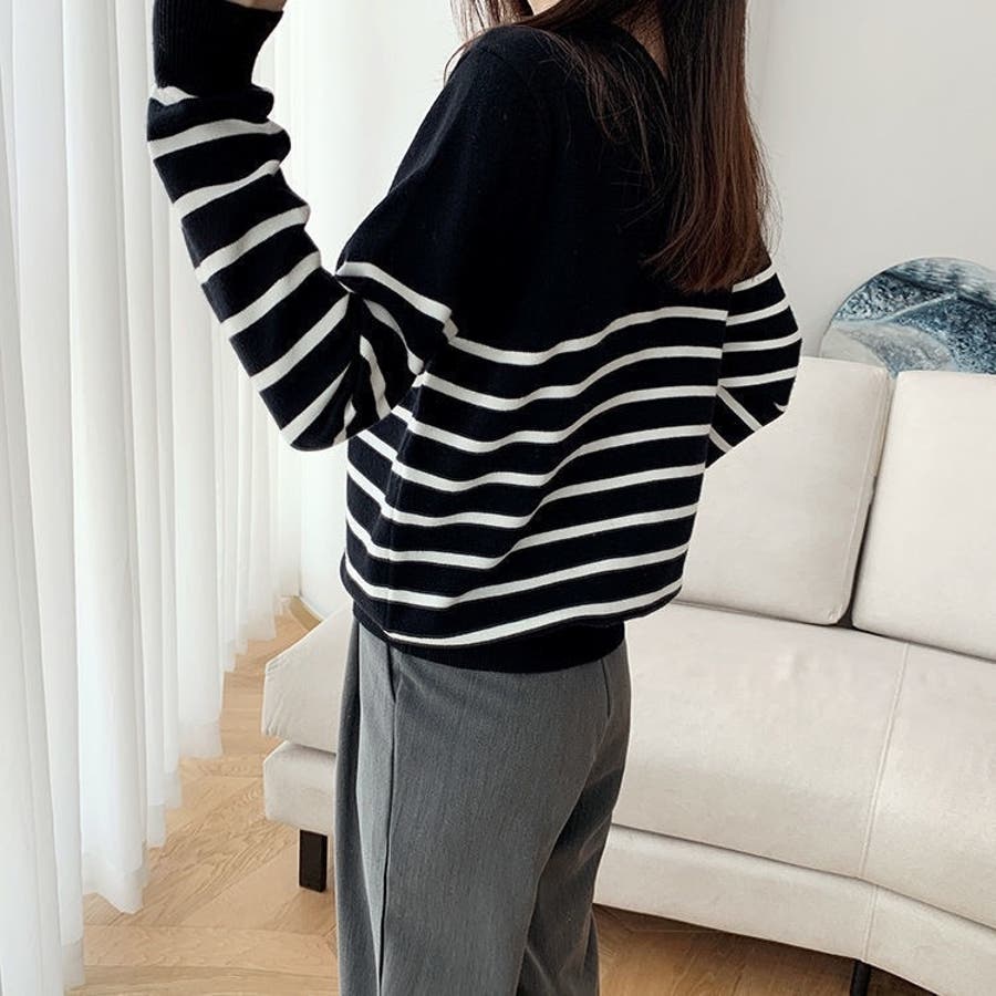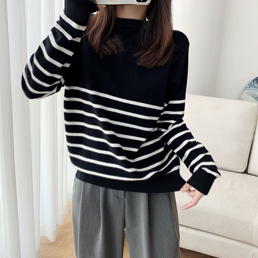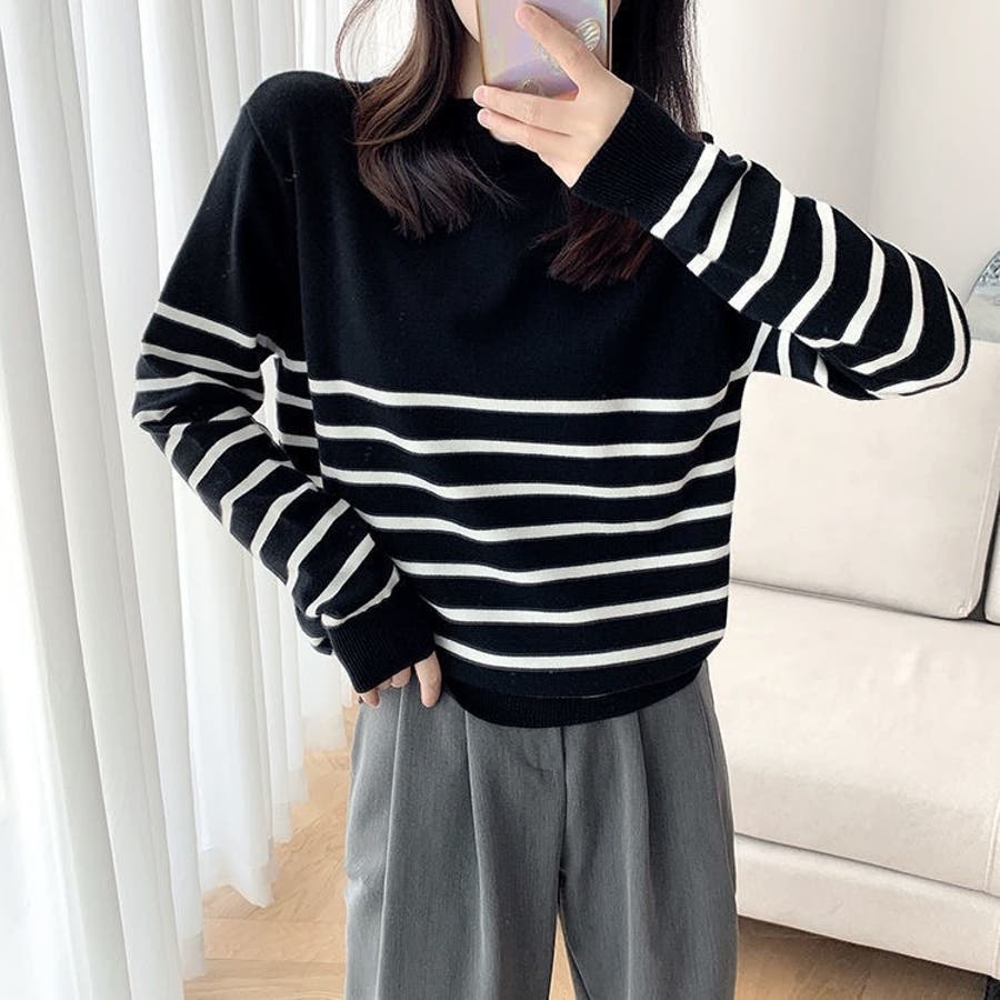ニット 編みトップス ストライプ 長袖ボーダーニットソー シンプル 長袖 カットソー セーター ボーダー長袖 スト春秋冬 薄手ニット ブラウス スリーブ大人可愛いレイヤード