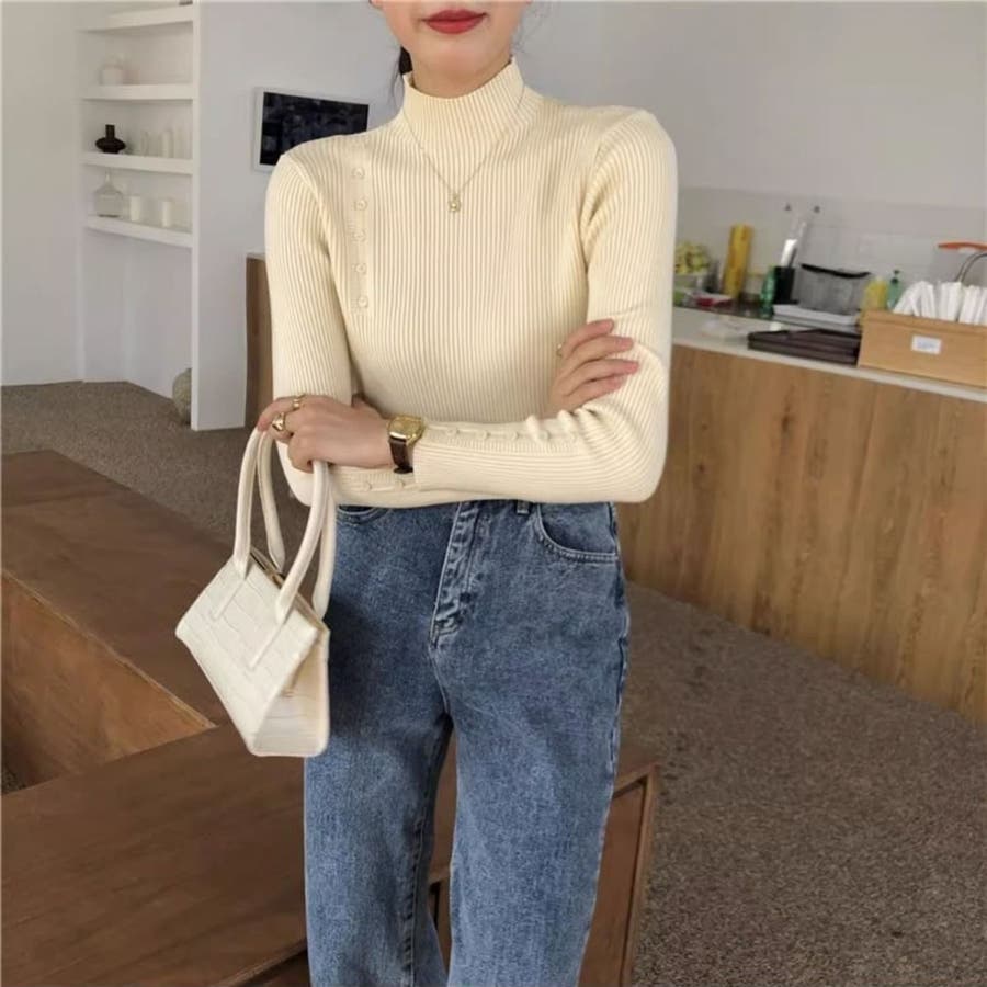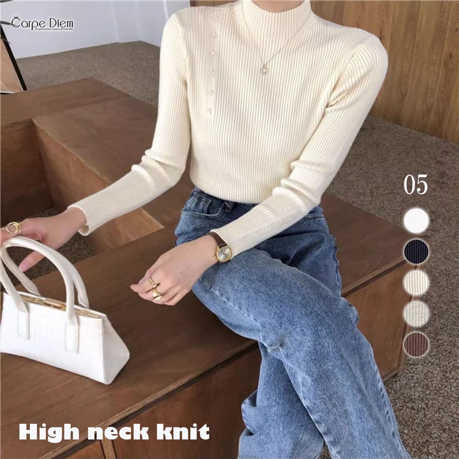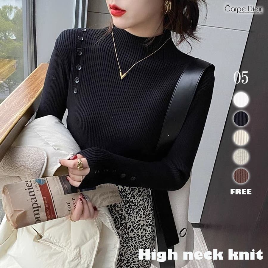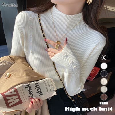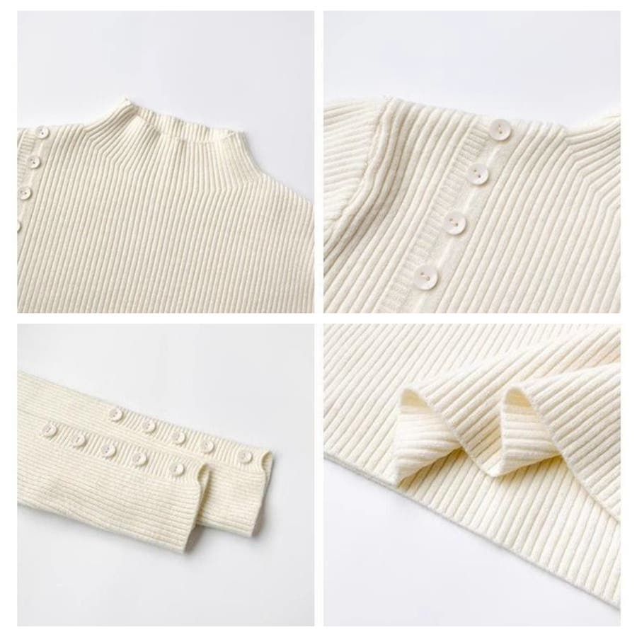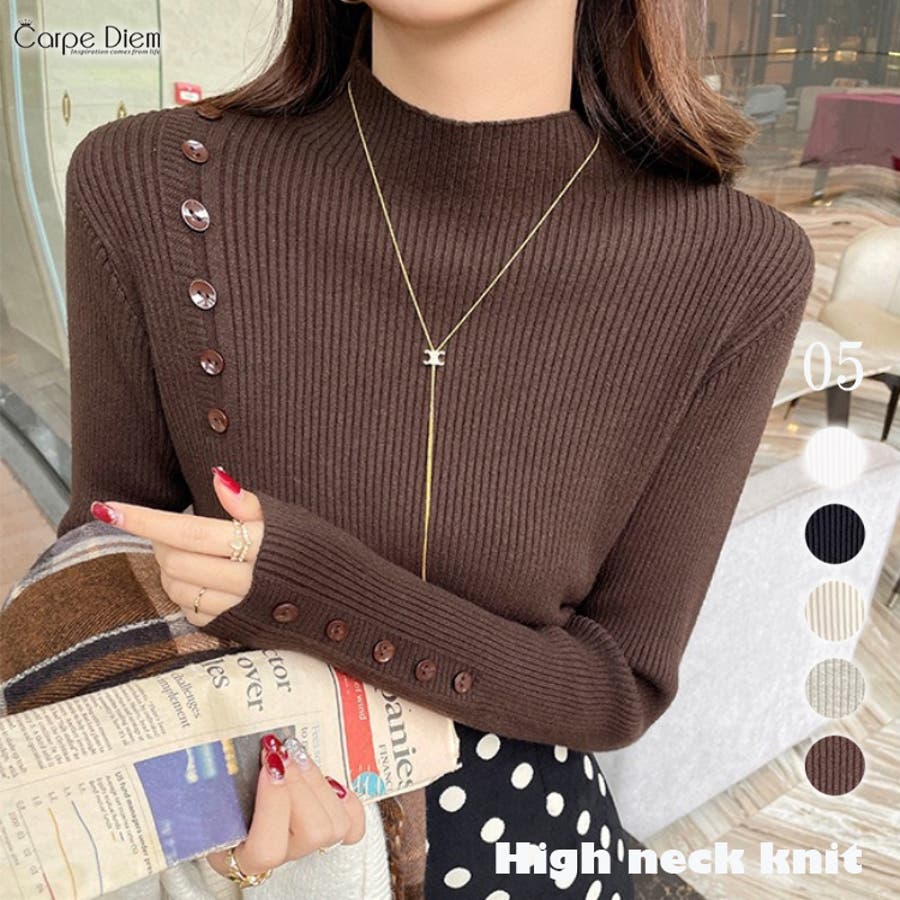 上品な印象を与えるハイネックデザインに、サイドのボタンがアクセントになったリブニットトップス。