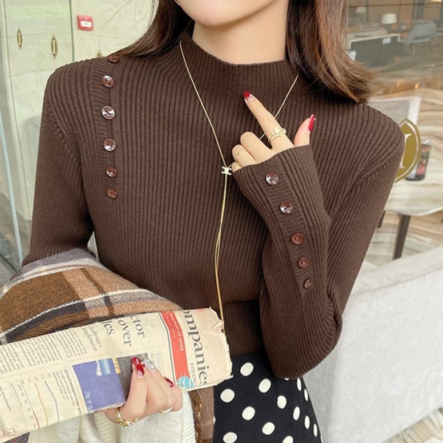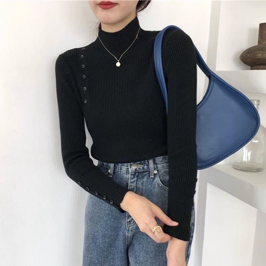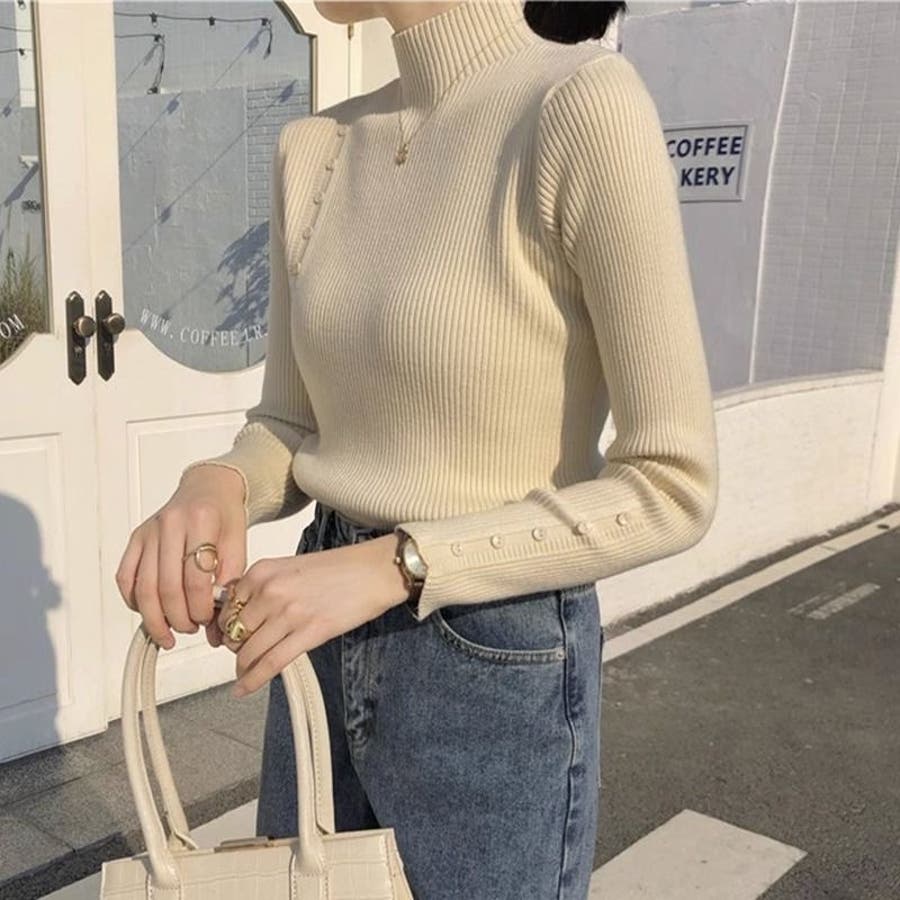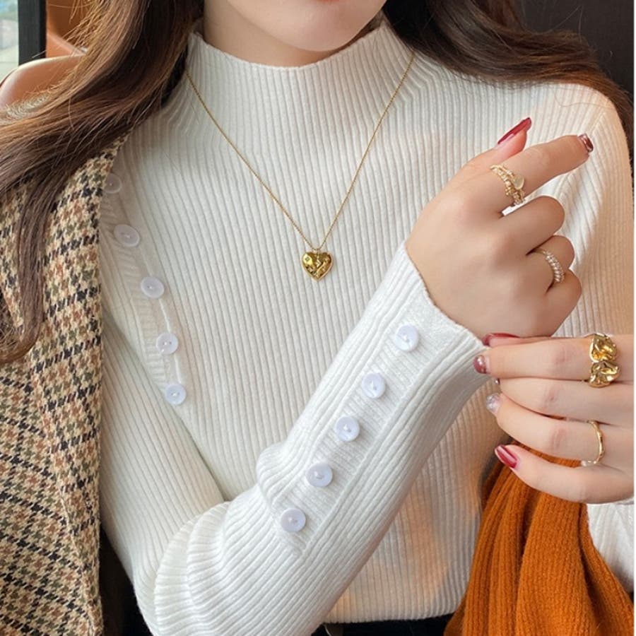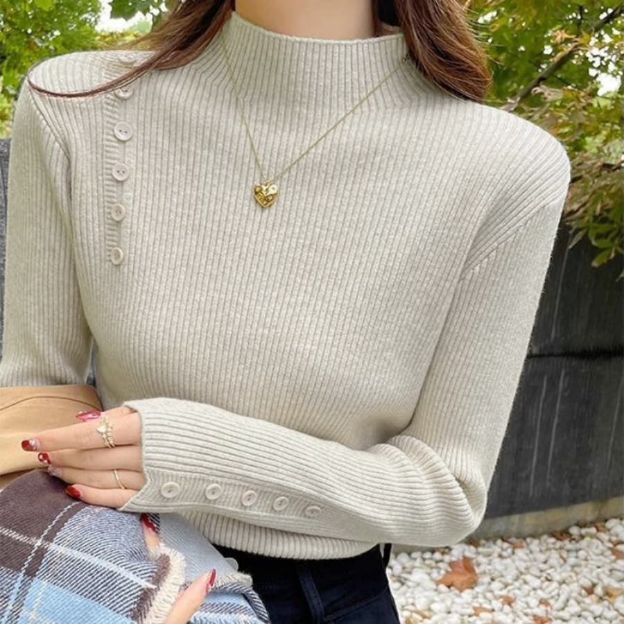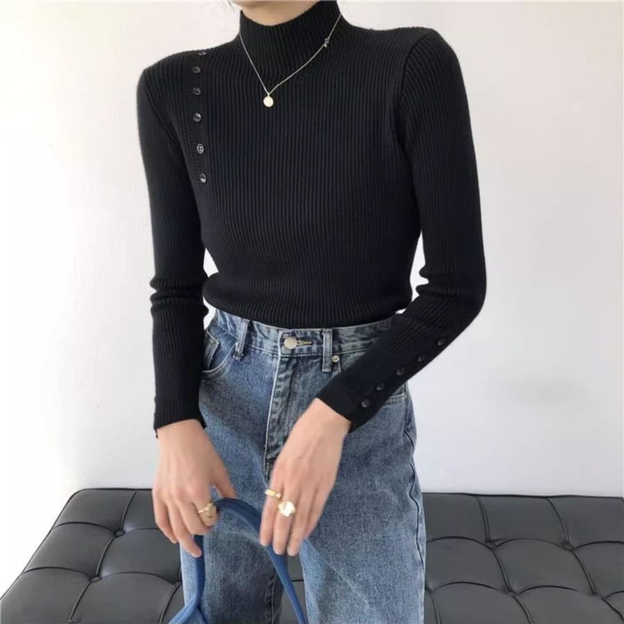上品な印象を与えるハイネックデザインに、サイドのボタンがアクセントになったリブニットトップス。