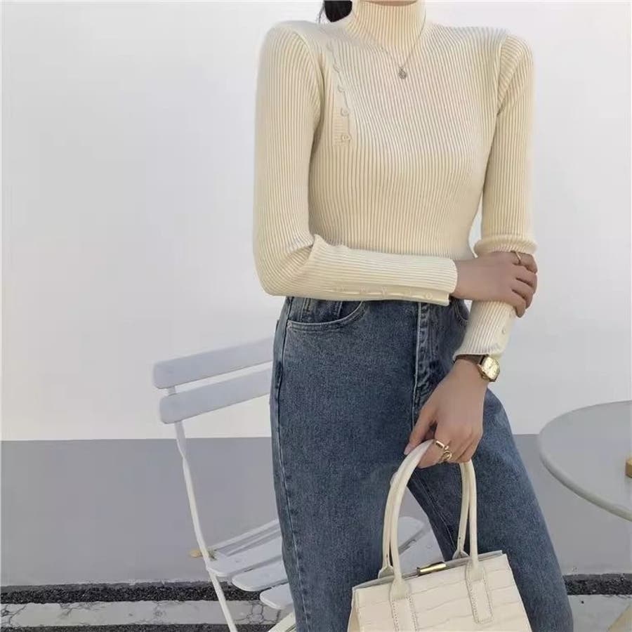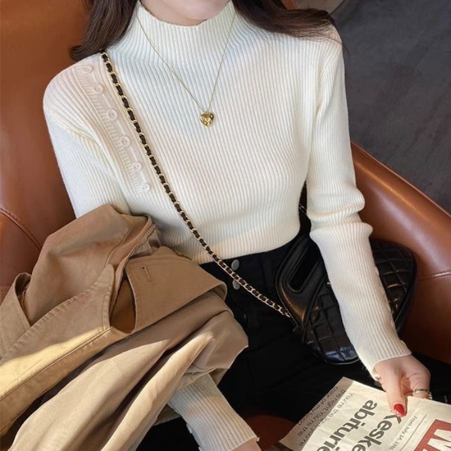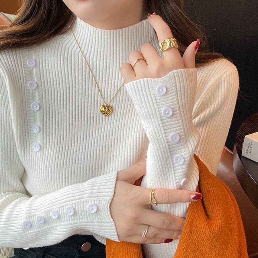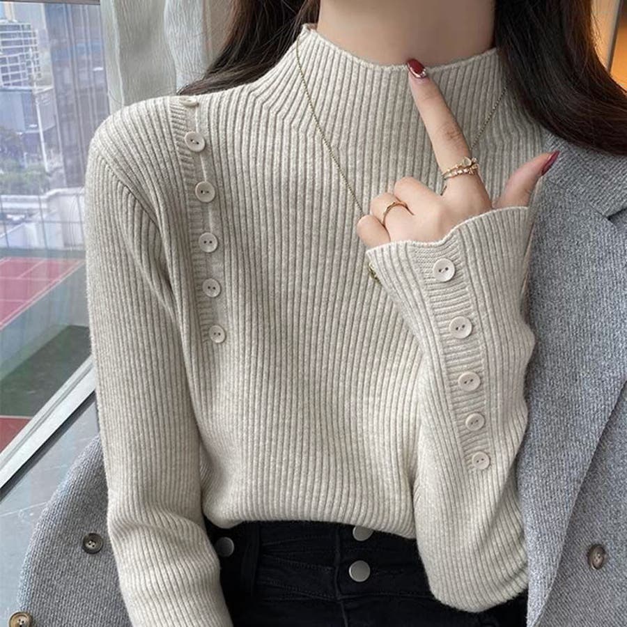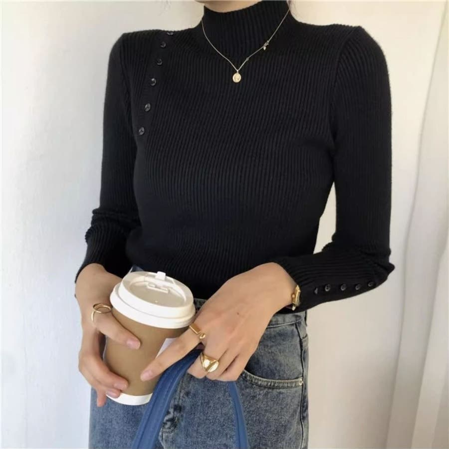 上品な印象を与えるハイネックデザインに、サイドのボタンがアクセントになったリブニットトップス。