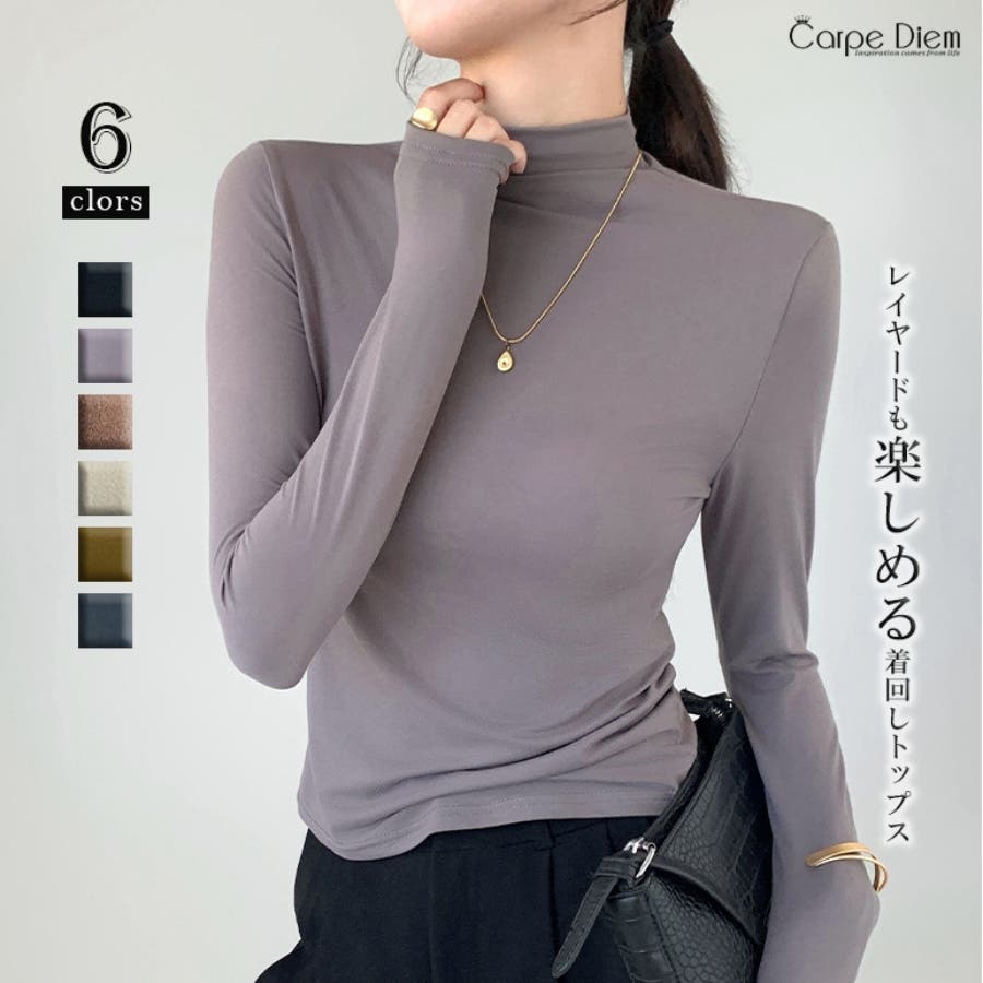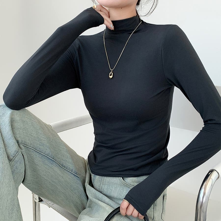 シンプルな無地デザインなので、1枚ではもちろん、ニットやシャツ、ジャケットのインナーとしても大活躍します。