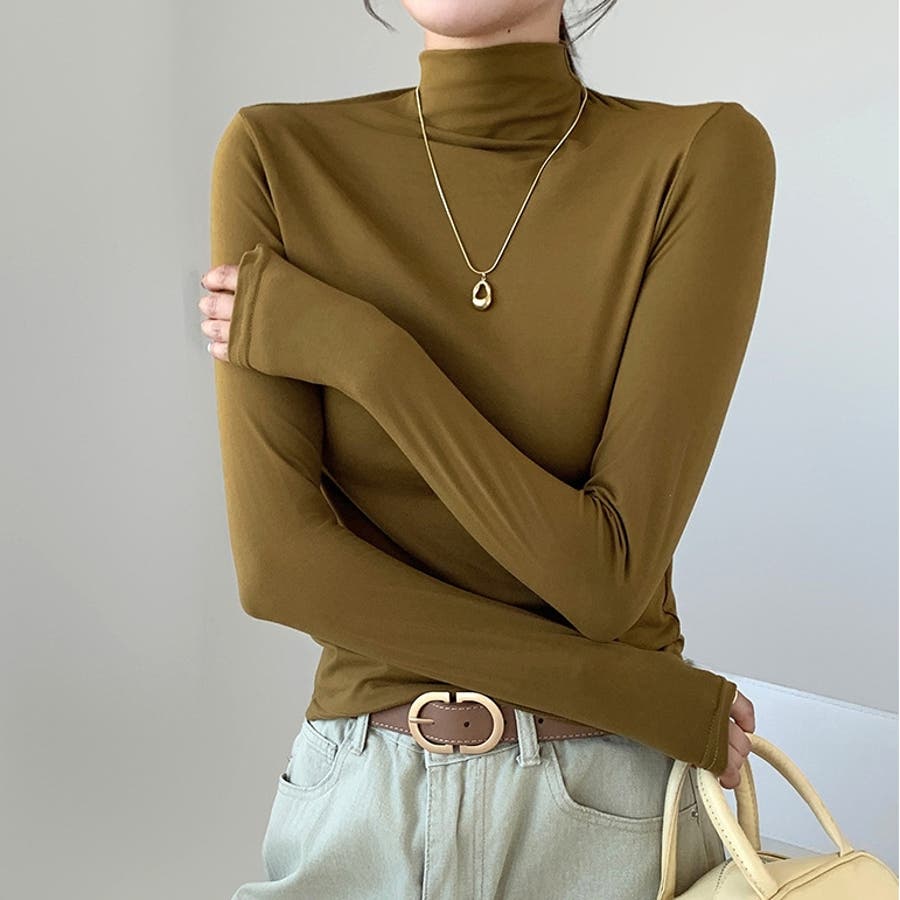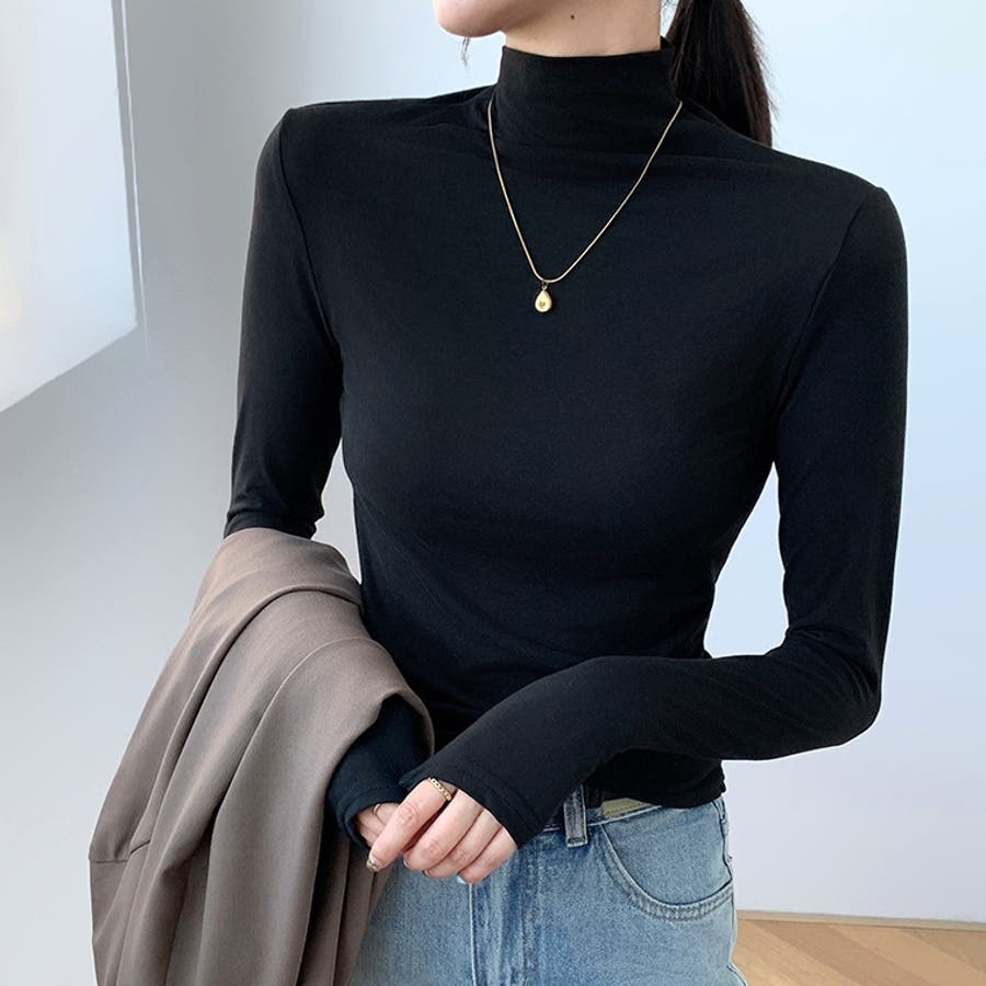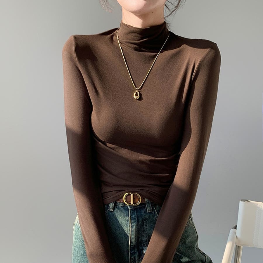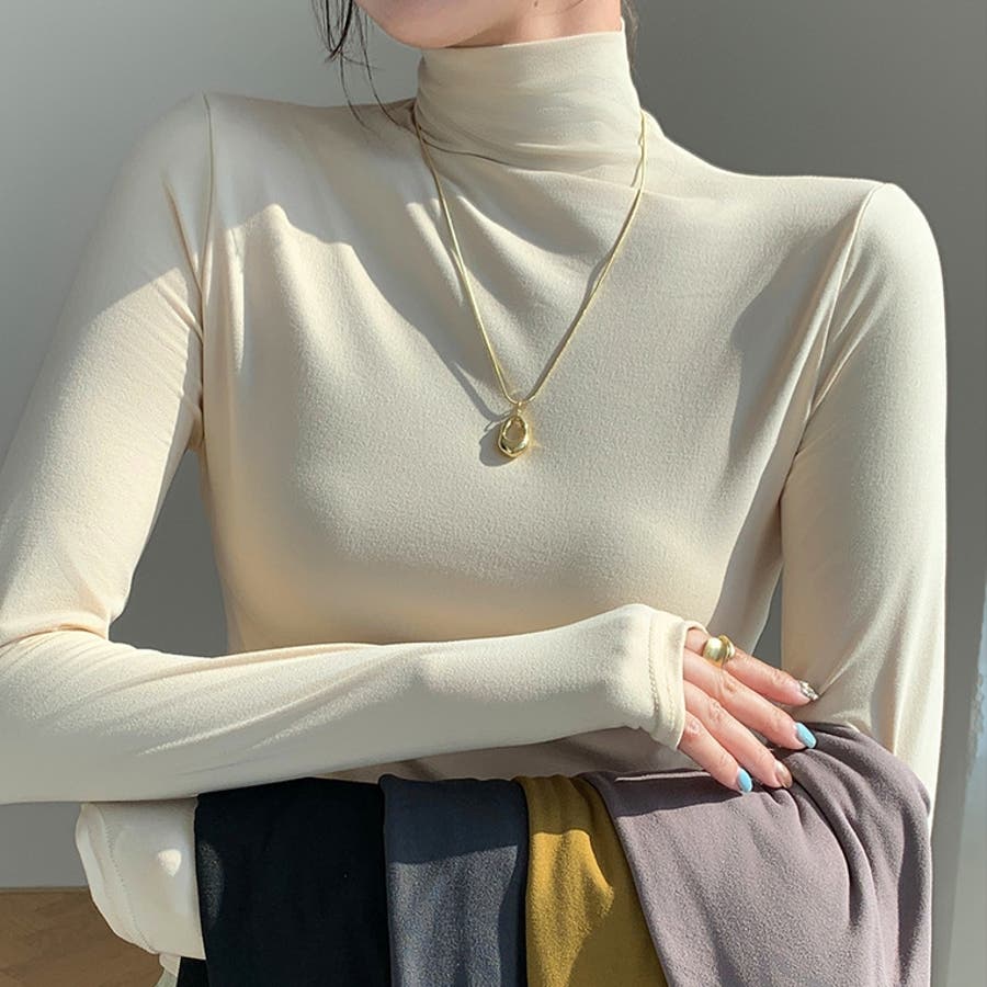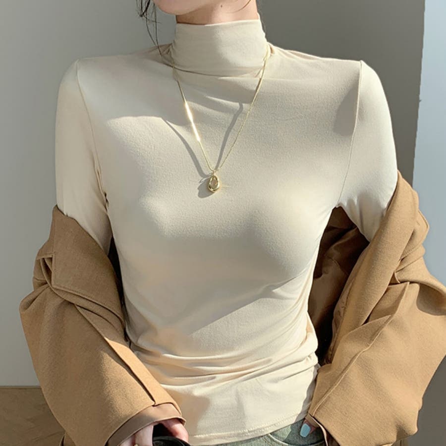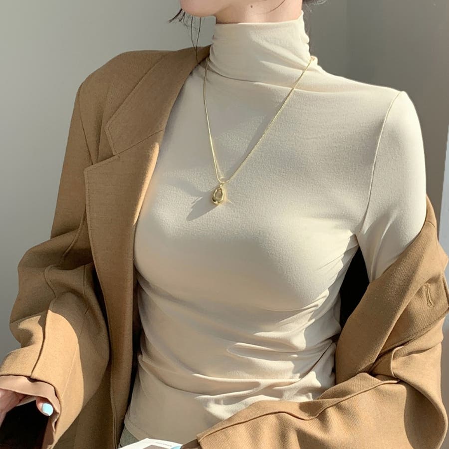 ニットやカーディガンのインナーに → 首元まで暖かく上品な印象に