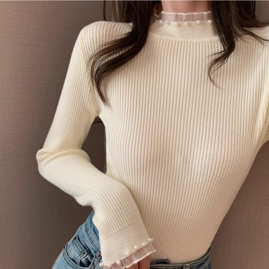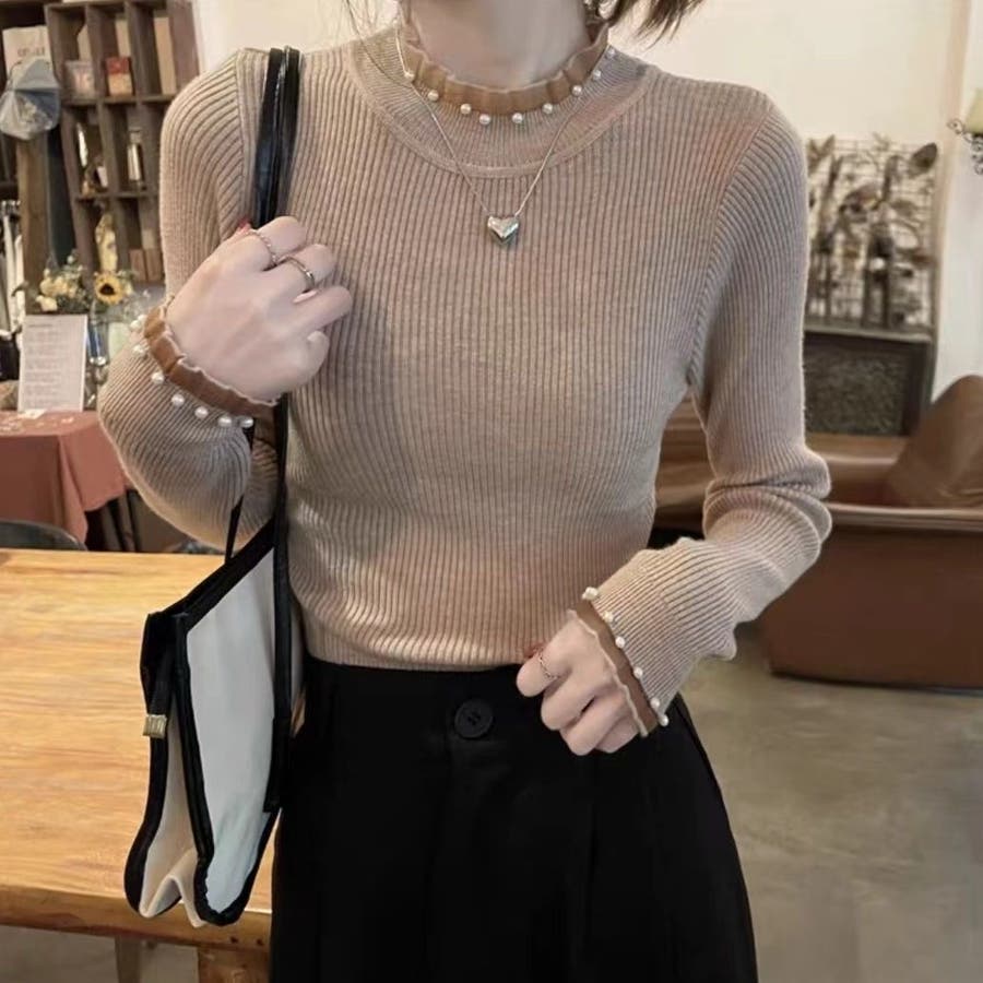 襟元と袖口に施されたパールディテールが上品に輝く、フェミニンなリブニットトップス。