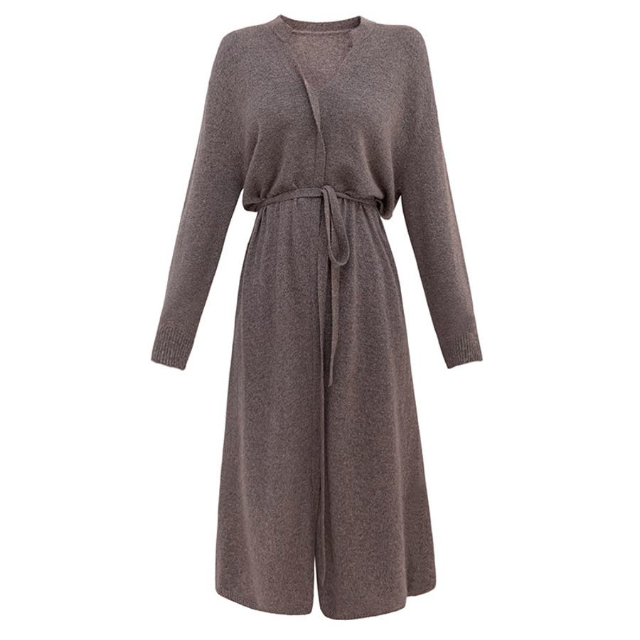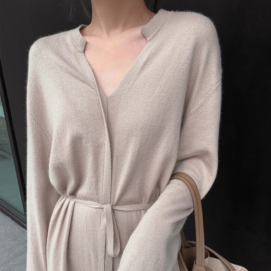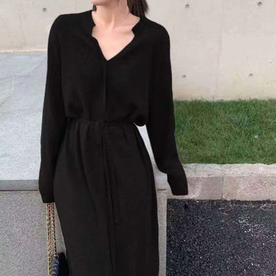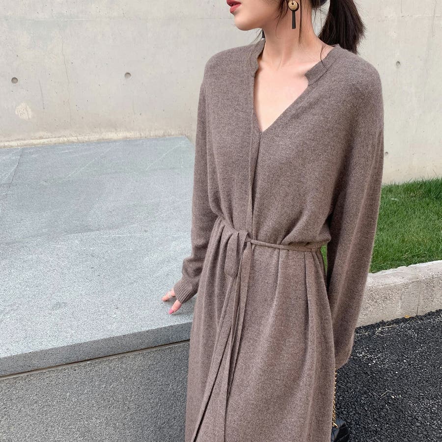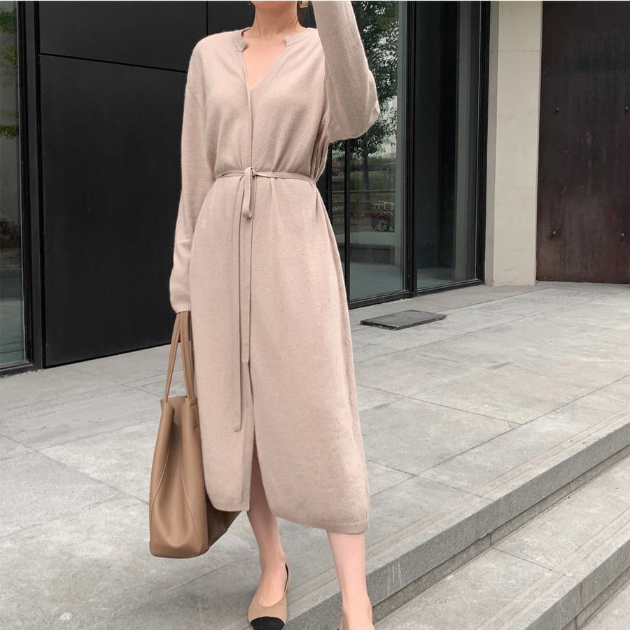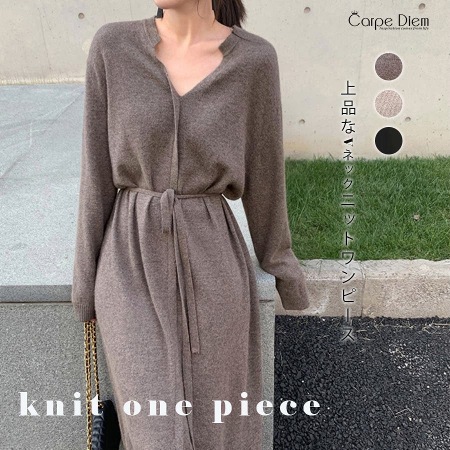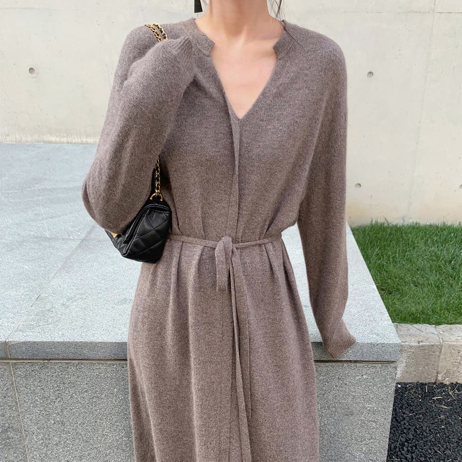 Vネックニットワンピース ウエストリボン付き ロング丈ワンピ