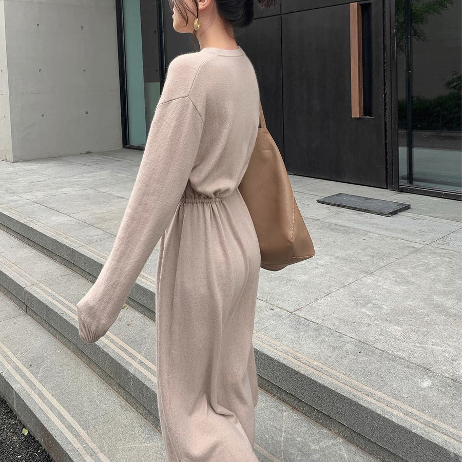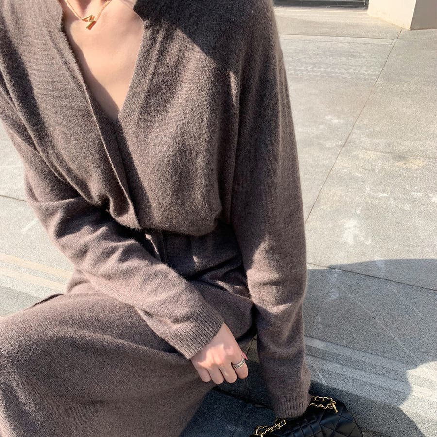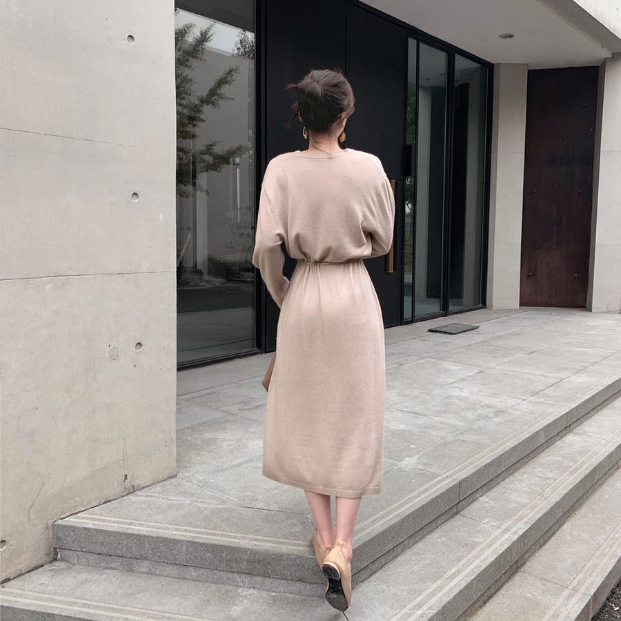 しなやかな落ち感のあるニット素材を使用したVネックワンピース。