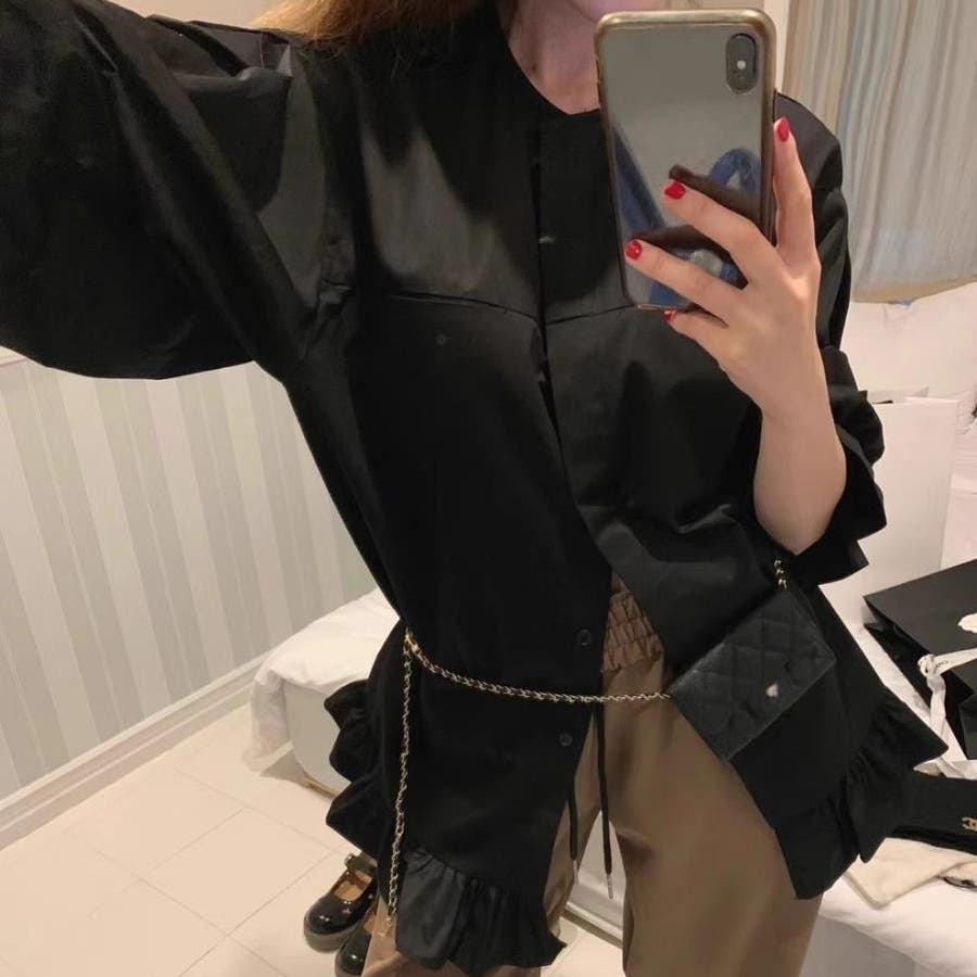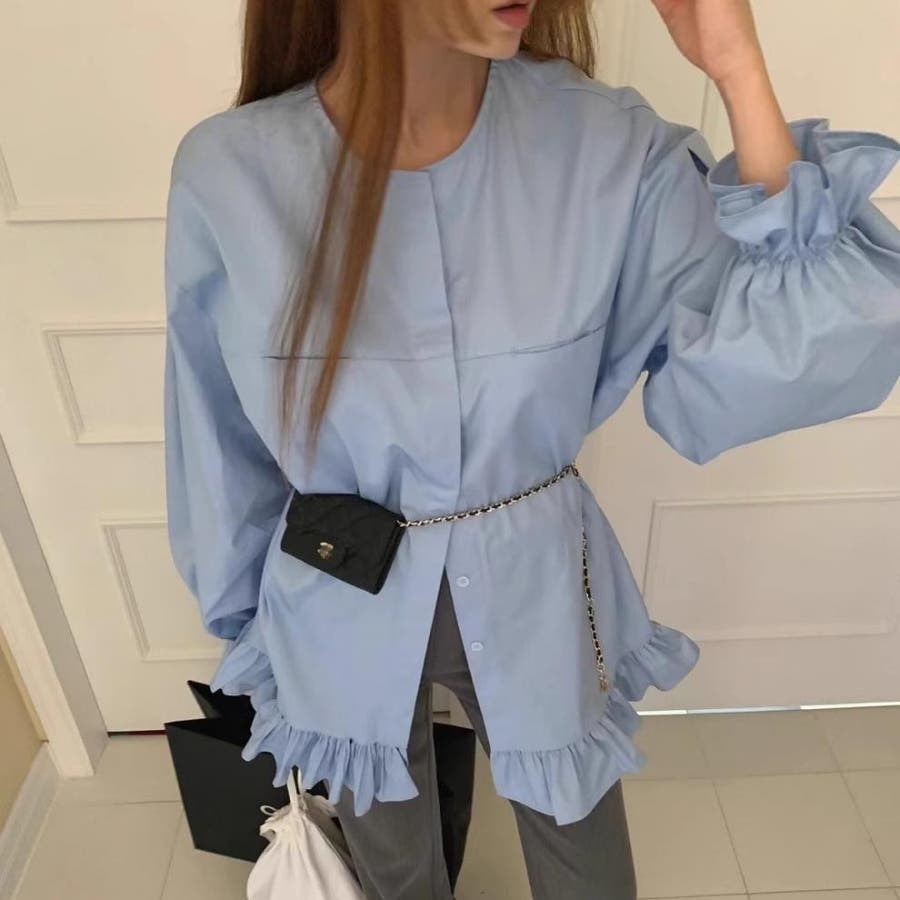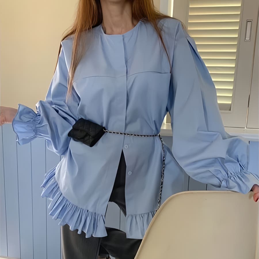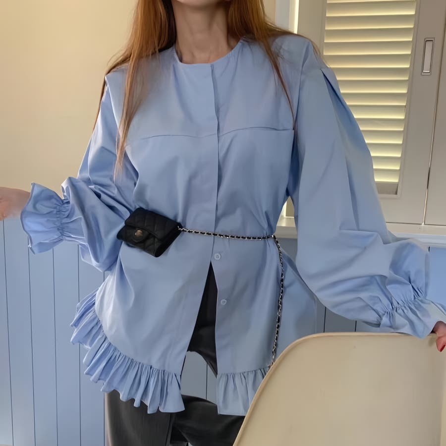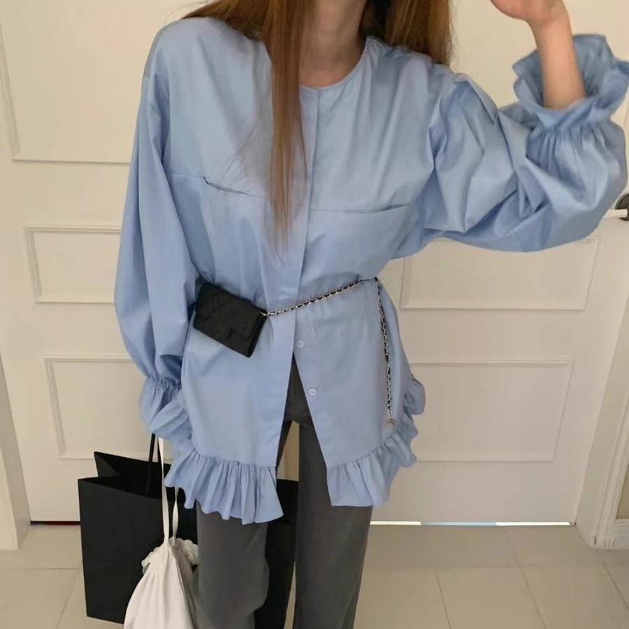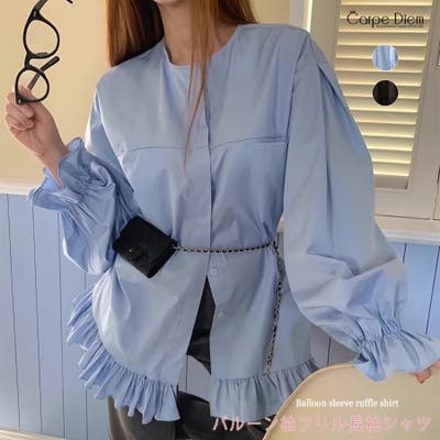 華やかなディテールが目を引く【フリル裾ギャザースリーブシャツブラウス】。