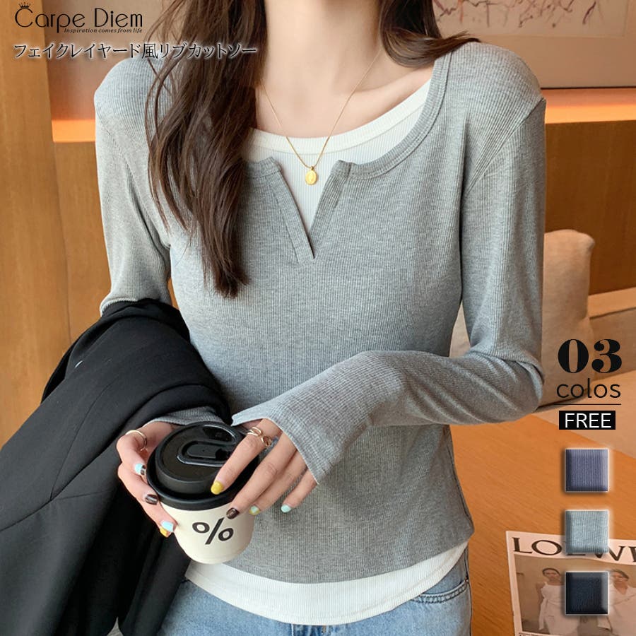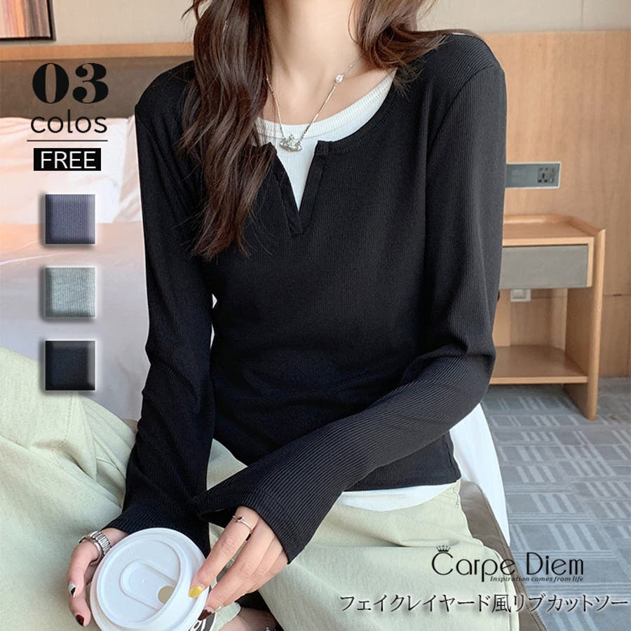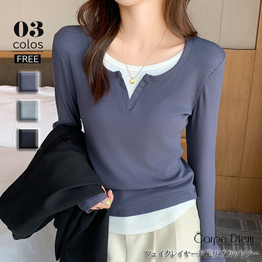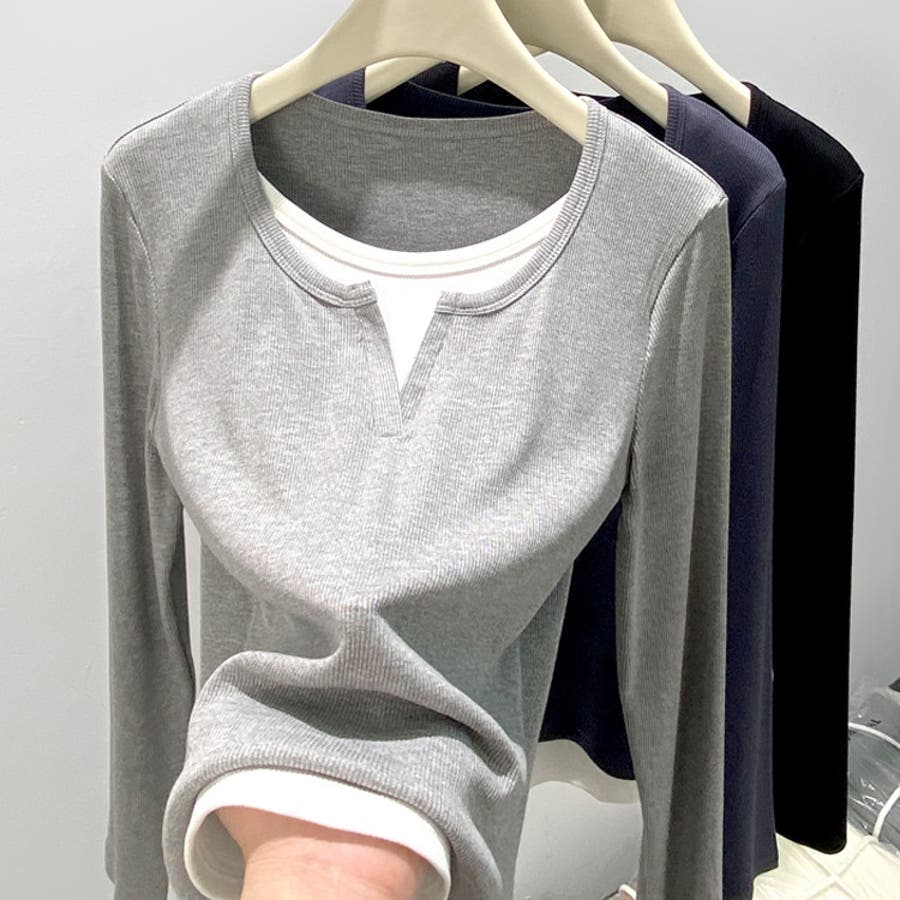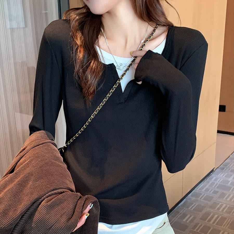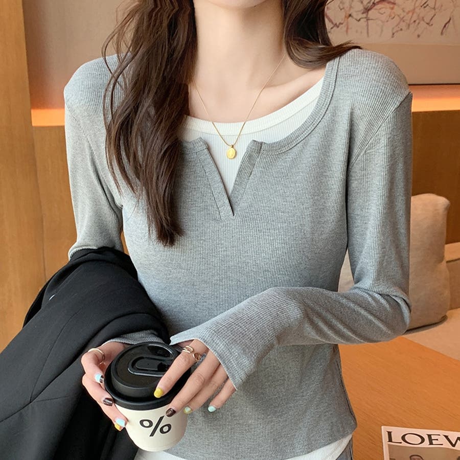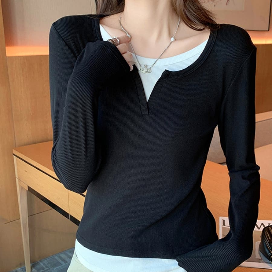 | 素材 | レイヤード風トップス フェイクレイヤード きれいめカジュアル カットソー 重ね着風 長袖 ロンT Tシャツ 無地 クルーネック 切り替えデザイン 秋新作 韓国 コカ オフィス |