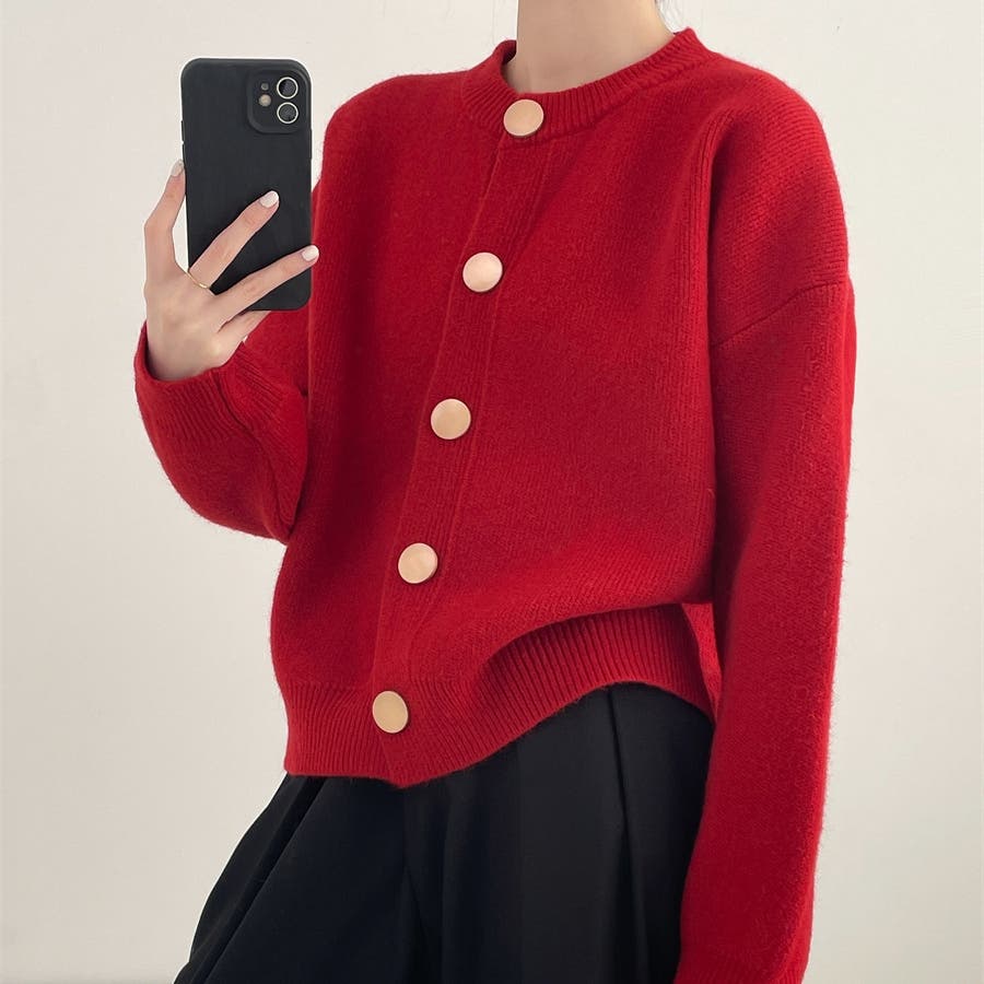 大きめのボタンがポイントになり、コーディネートにほどよいアクセントをプラス。