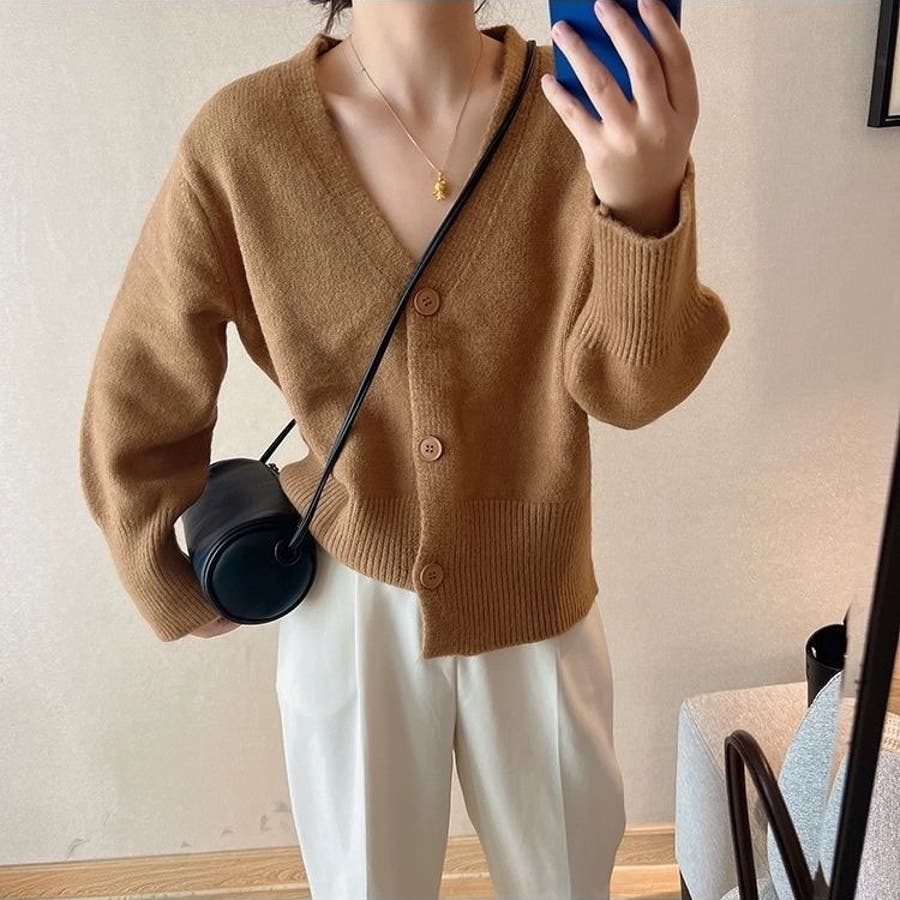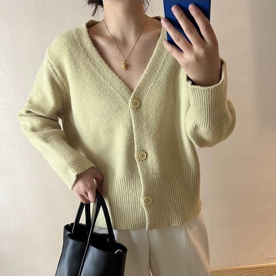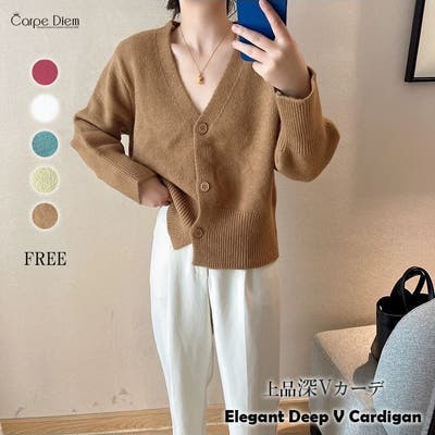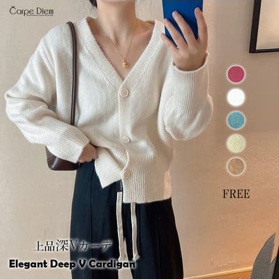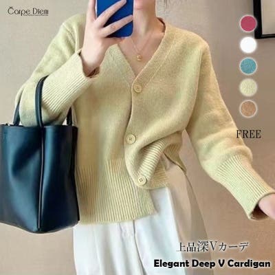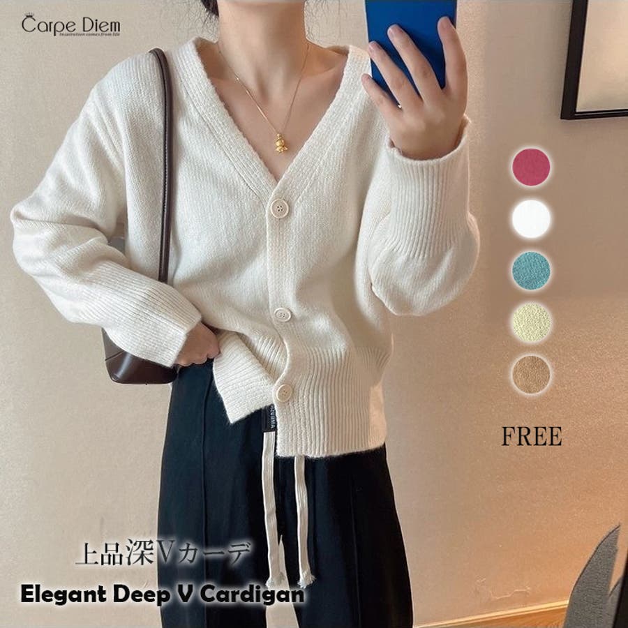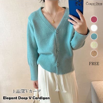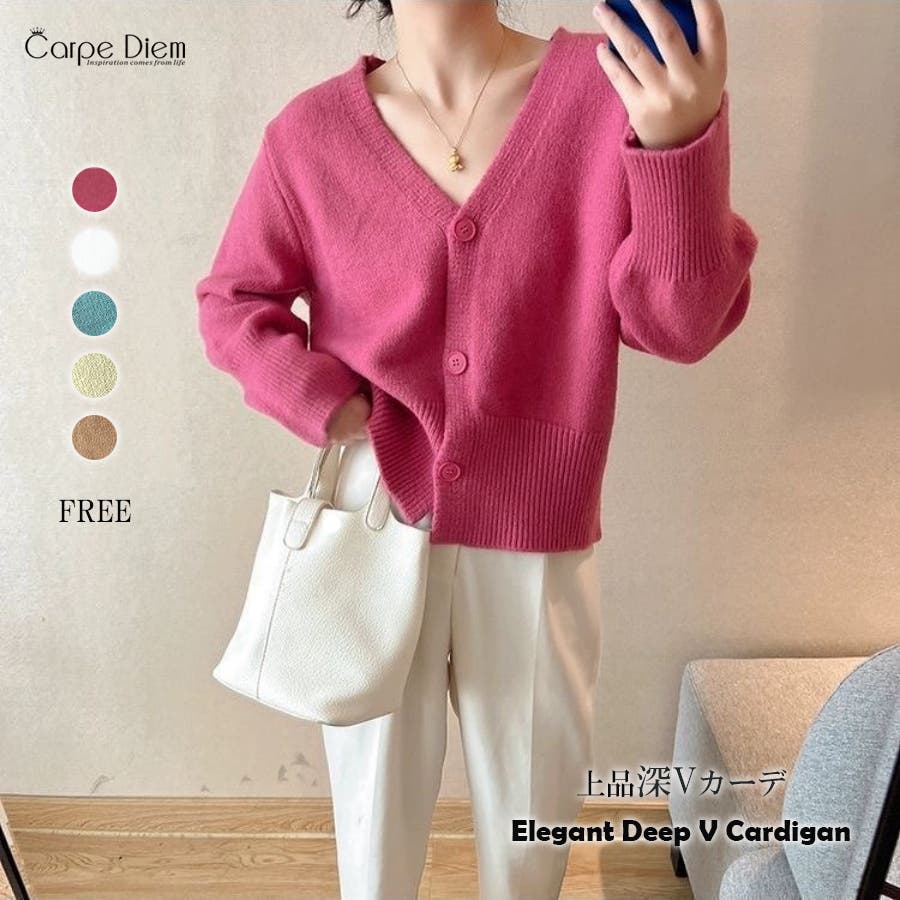 上品な深Vネックが女性らしさを引き立てる、大人可愛いニットカーディガン。
