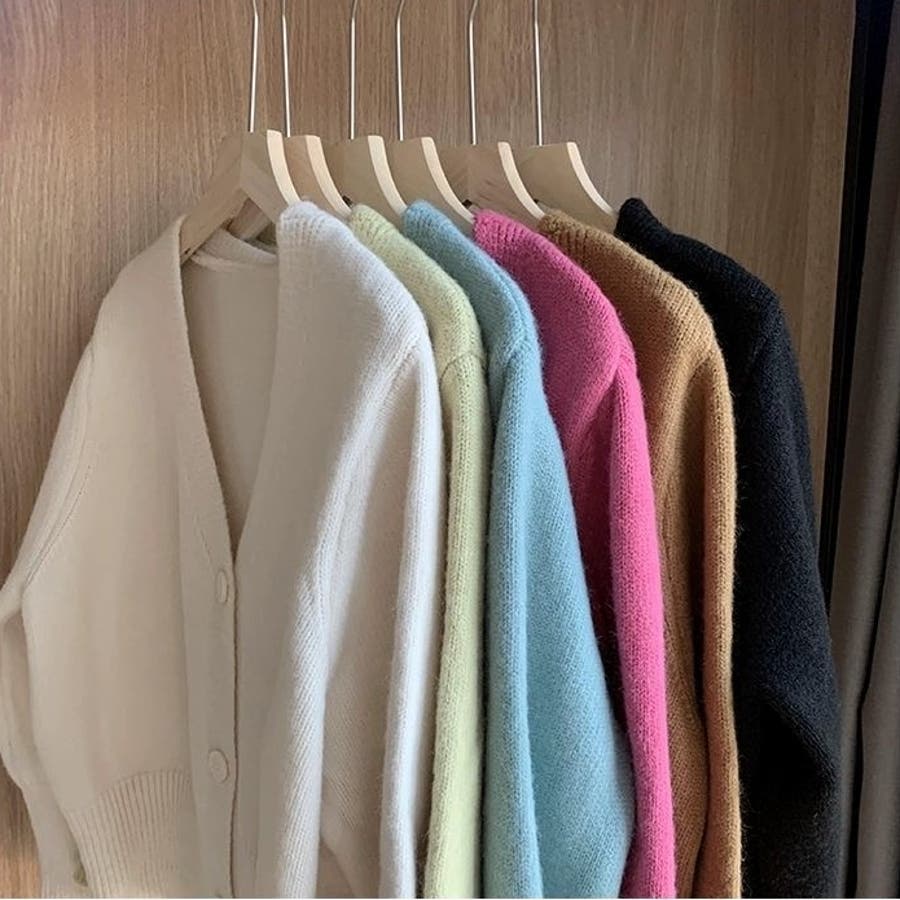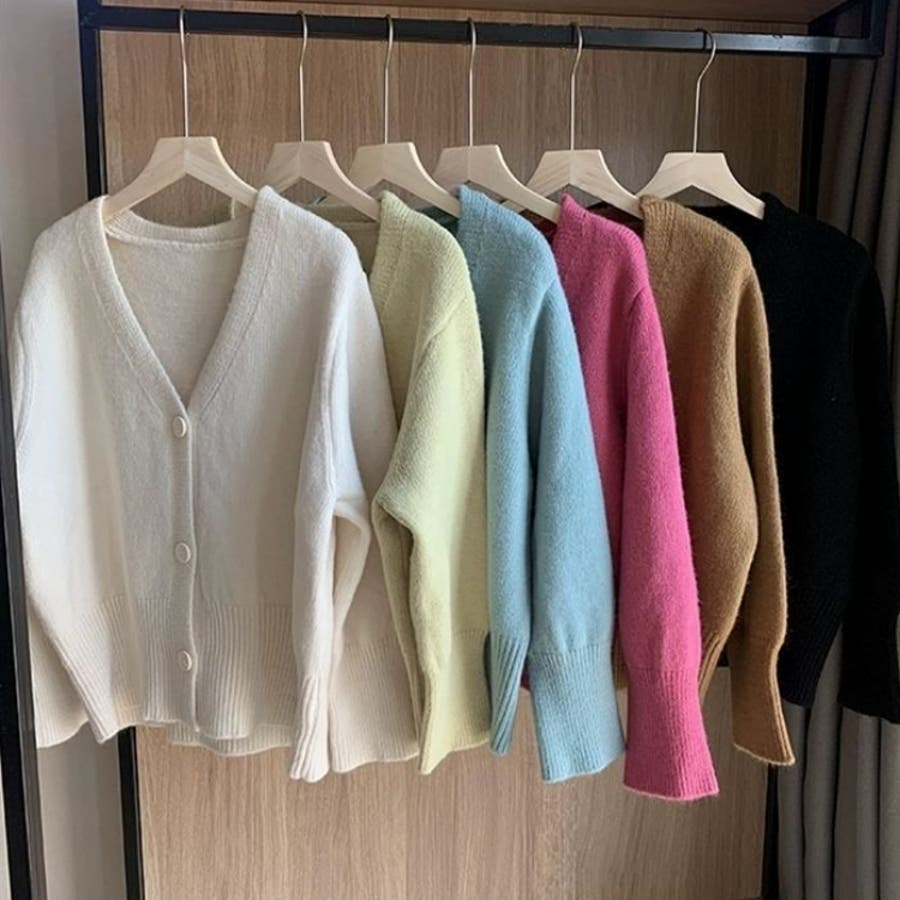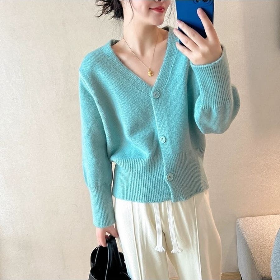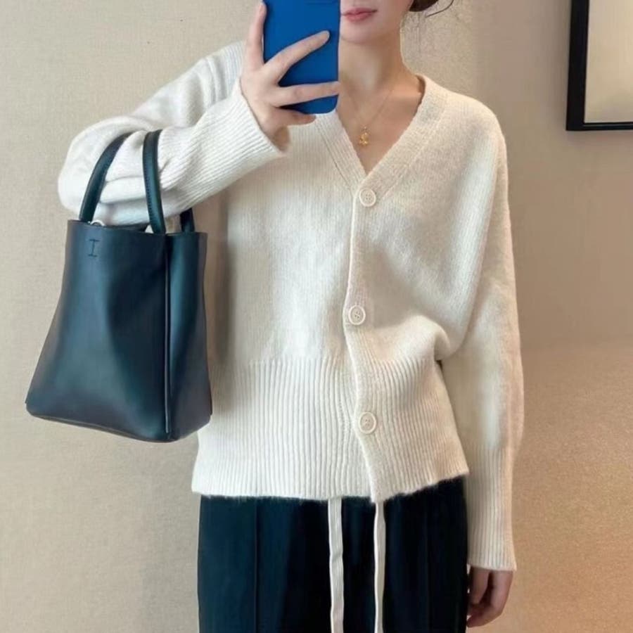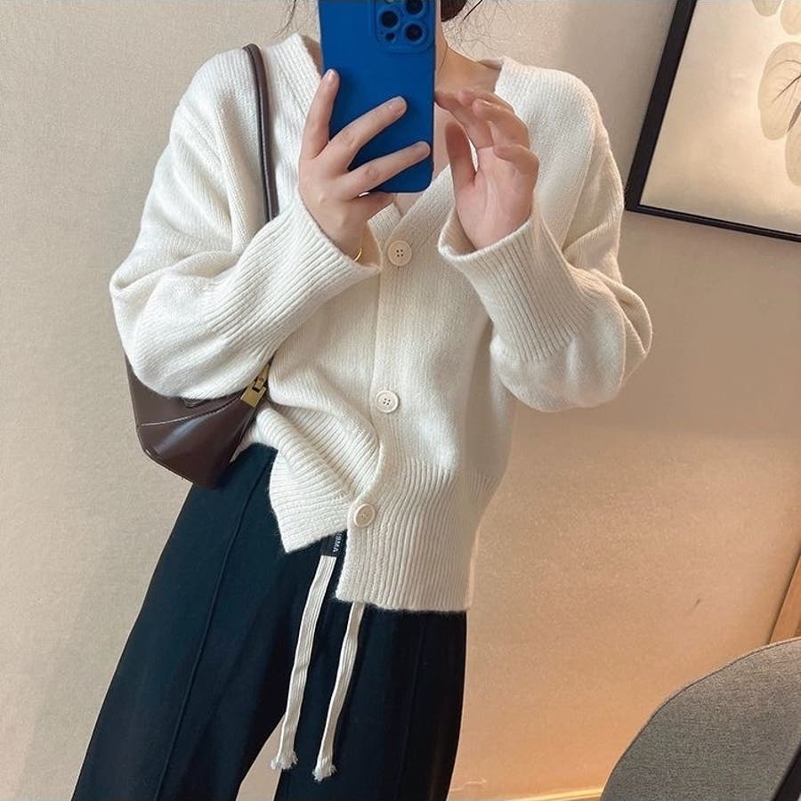 上品な深Vネックが女性らしさを引き立てる、大人可愛いニットカーディガン。