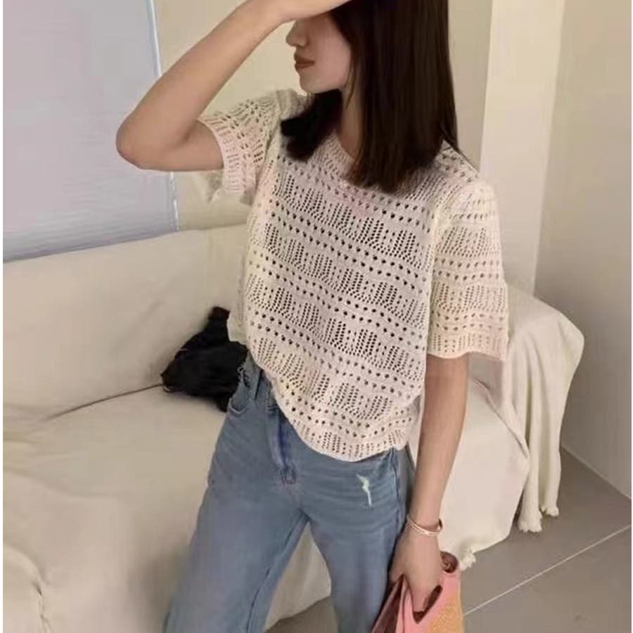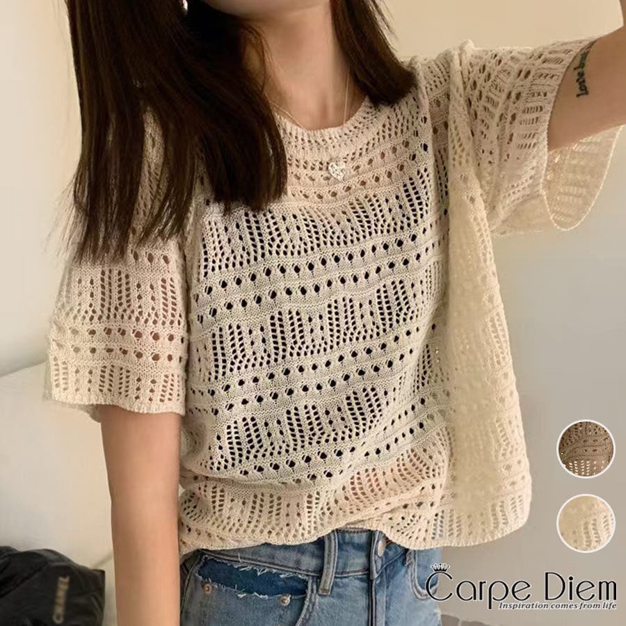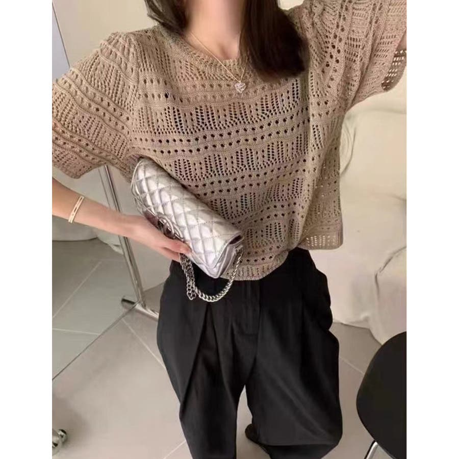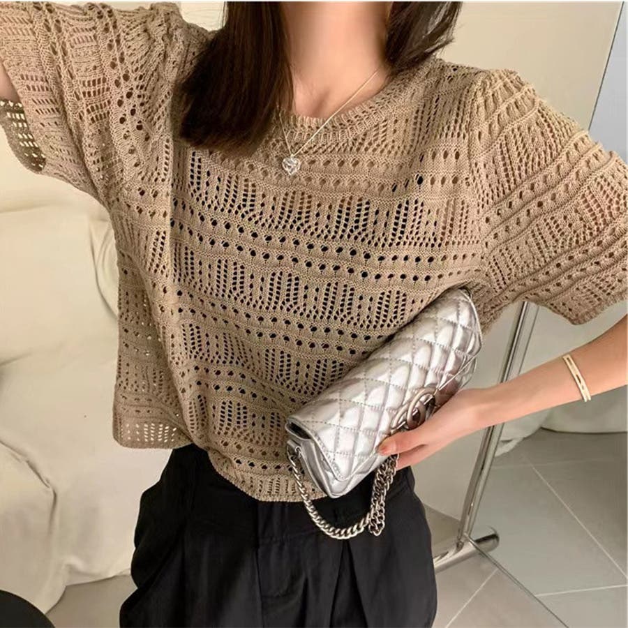 程よい肌見せがヘルシーな透かし編みニットトップス。