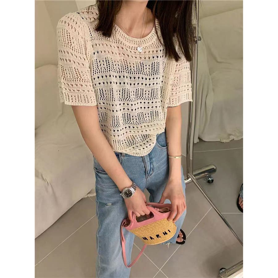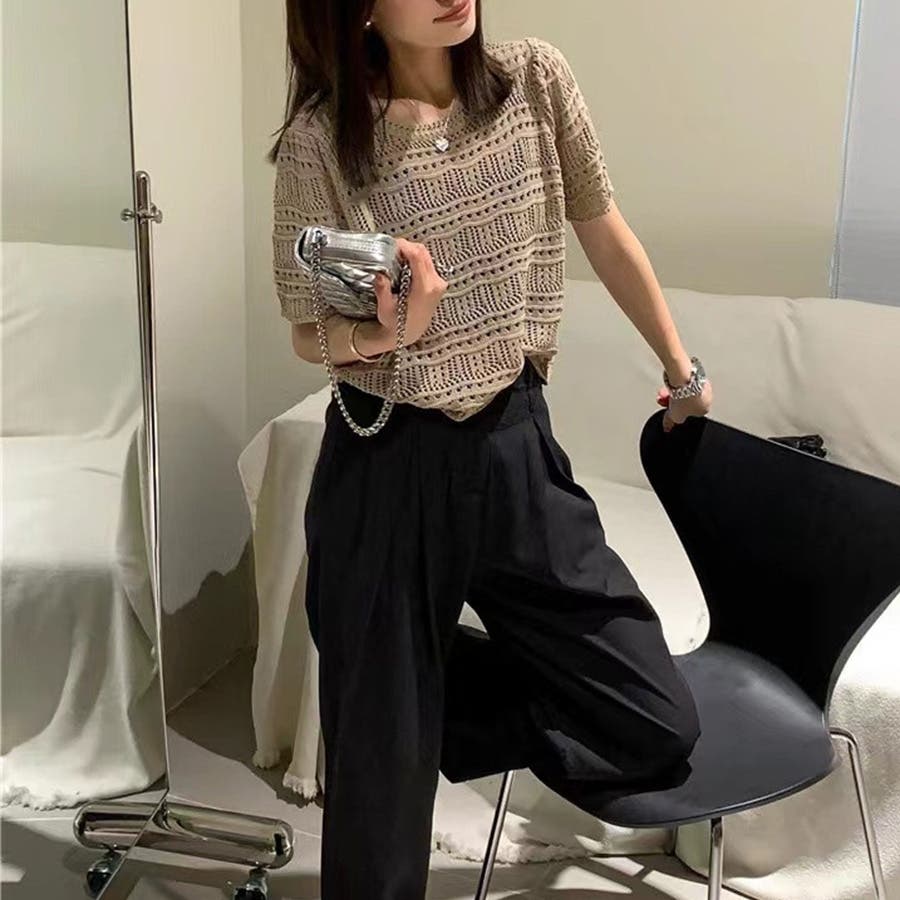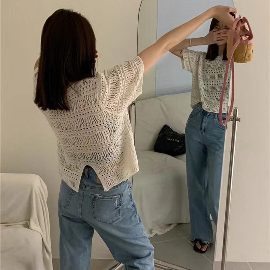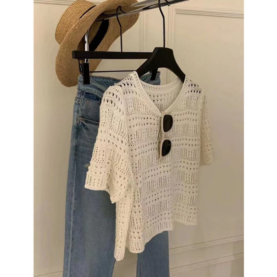 程よい肌見せがヘルシーな透かし編みニットトップス。