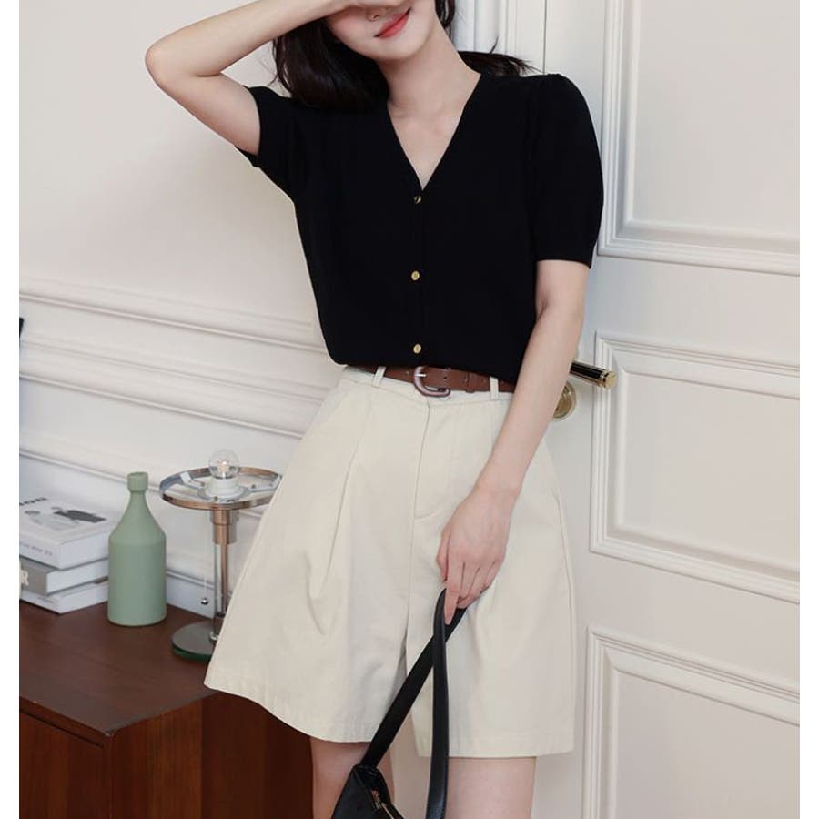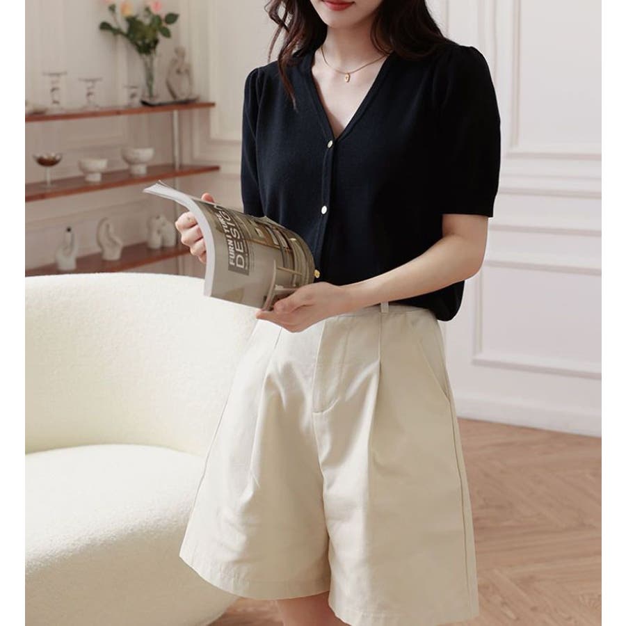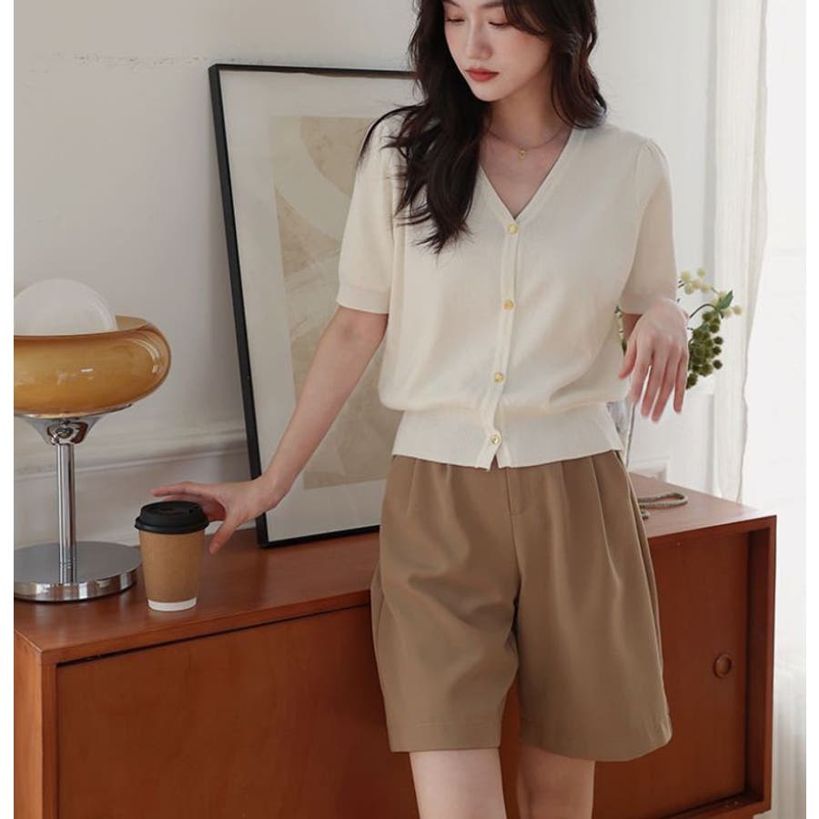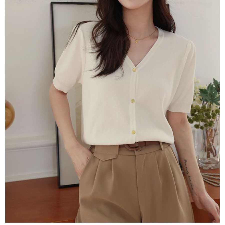 Vネックと半袖の組み合わせが、涼しげでありながらも上品な印象を与えます。