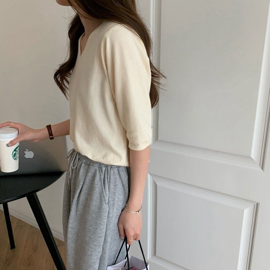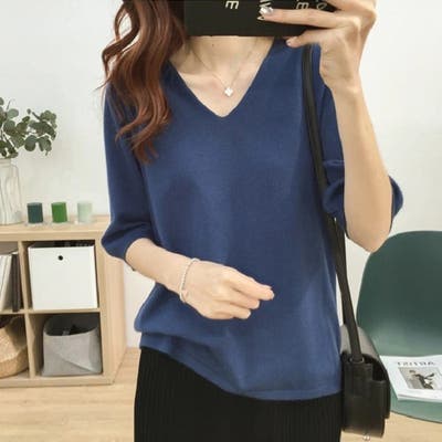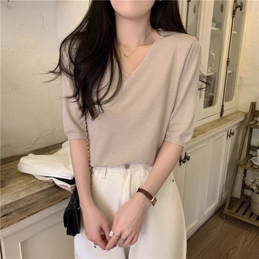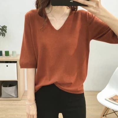 ニットトップス 半袖 サマーニット半袖 ニットソー カジュアル 五分袖 ストレッチ 夏服 伸縮性 韓国ファッション 薄手ニット 春 シンプル 無地 トップス 韓国