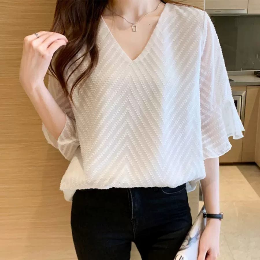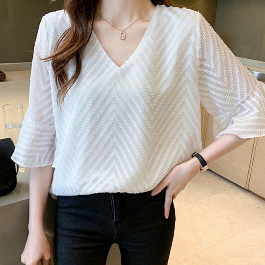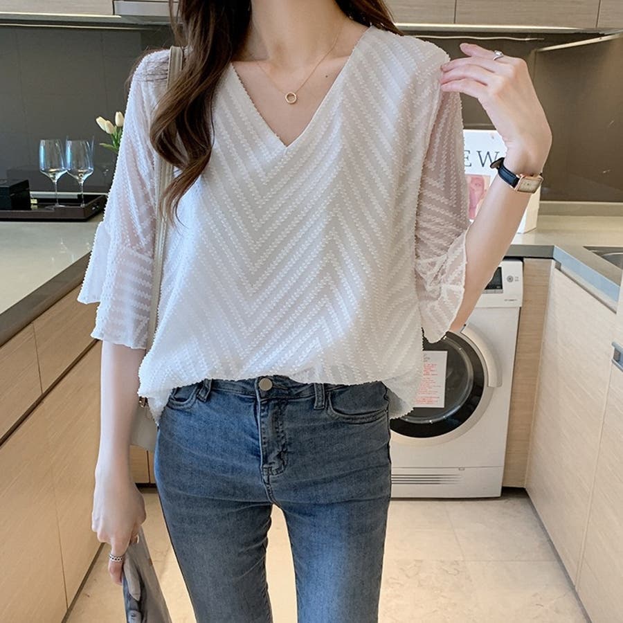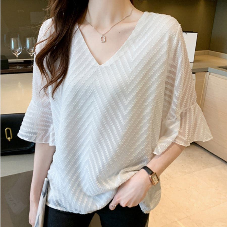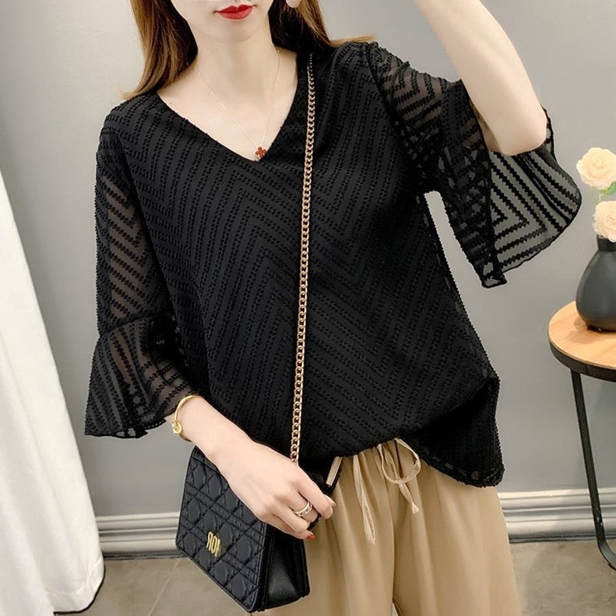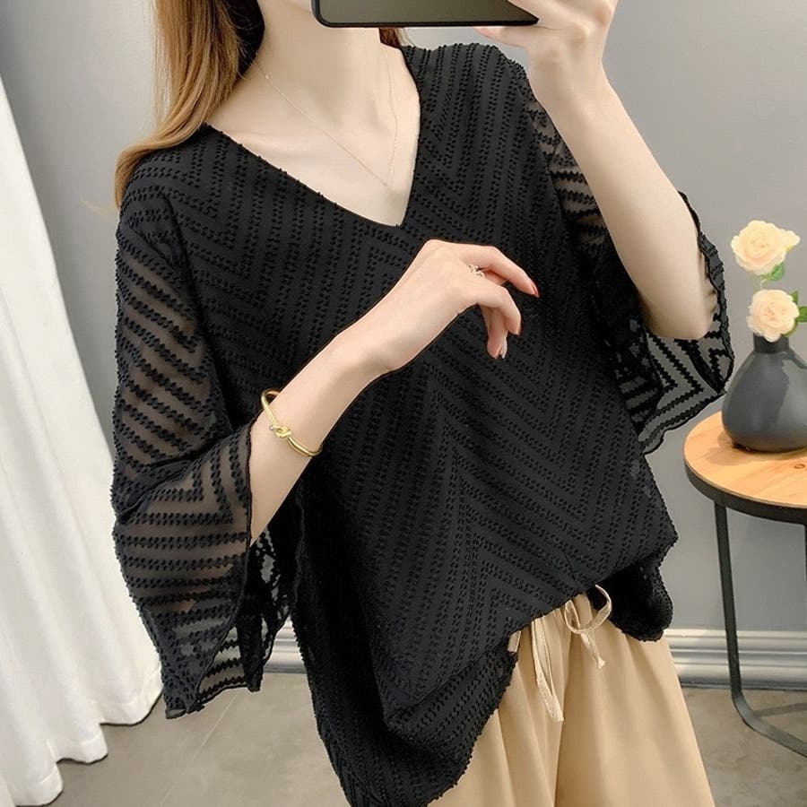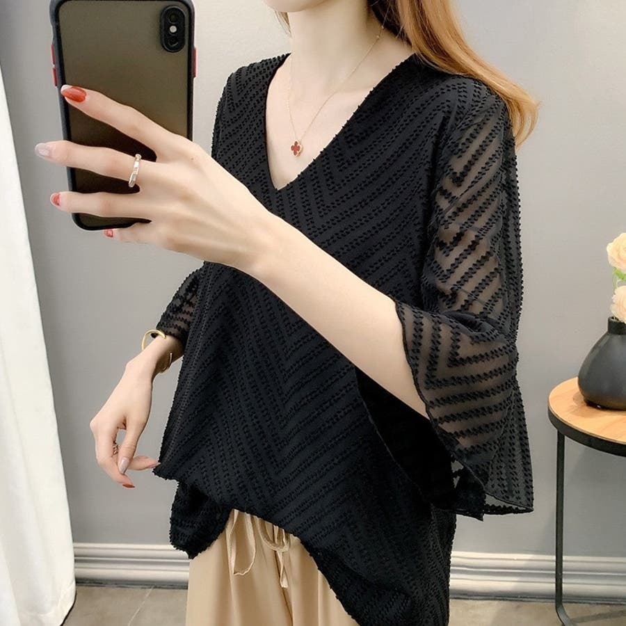 程よく透け感のある七分袖フレアスリーブで、気になる腕周りも自然にカバー。