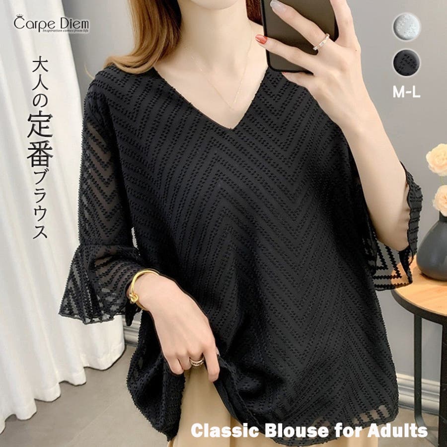 上品でフェミニンな印象を与える大人のための定番ブラウス。