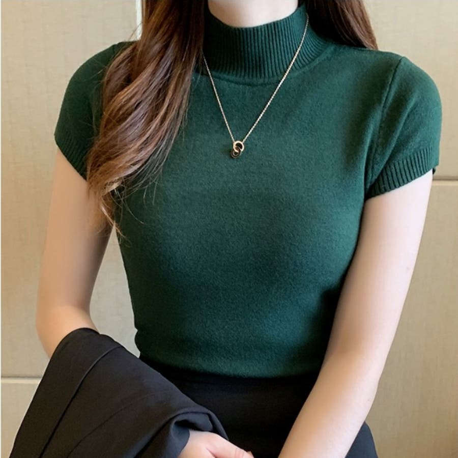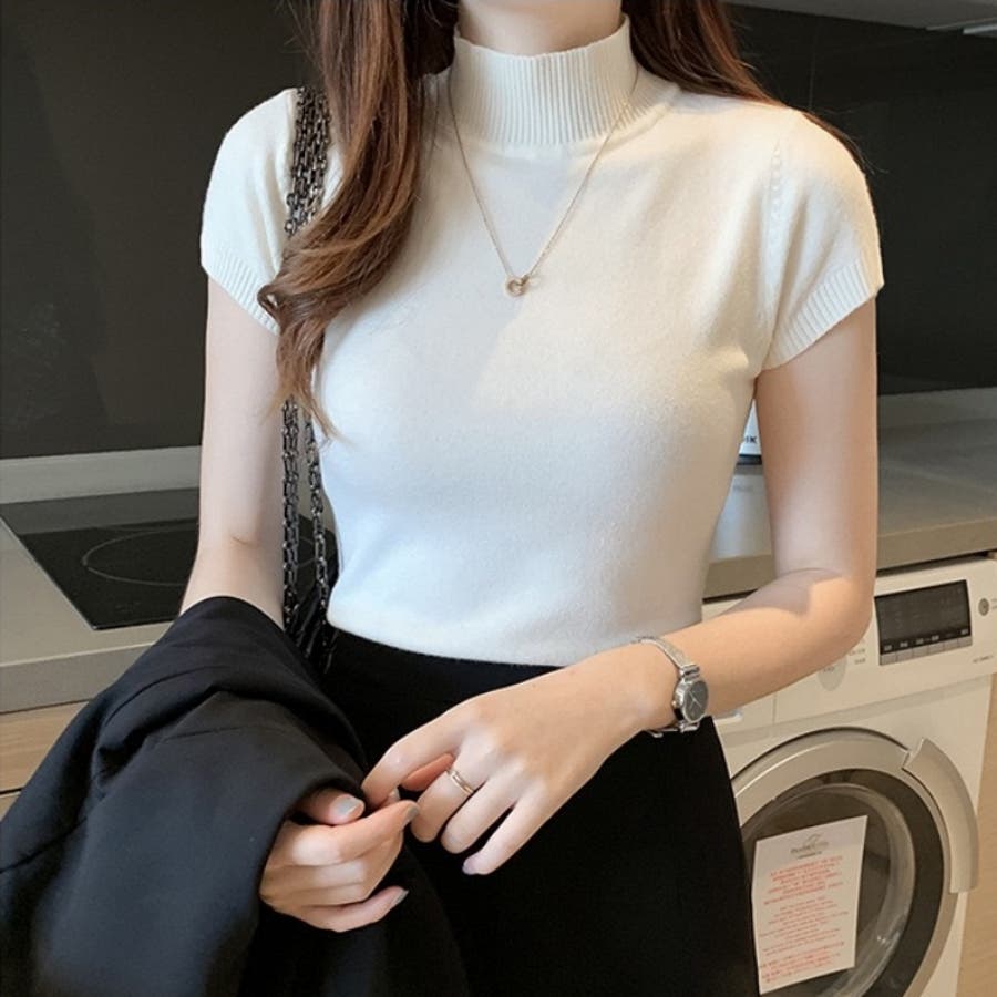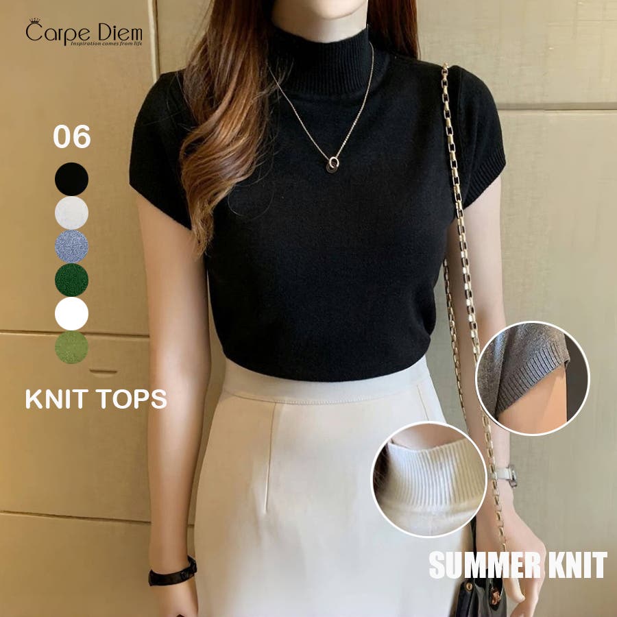 ハイネックが表情をプラスし、薄手で軽い着心地なのが嬉しいポイント◎