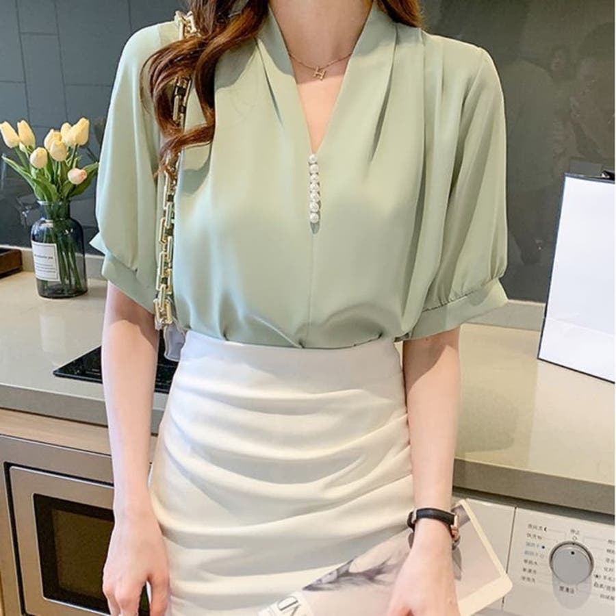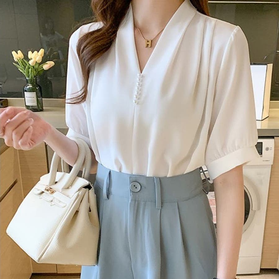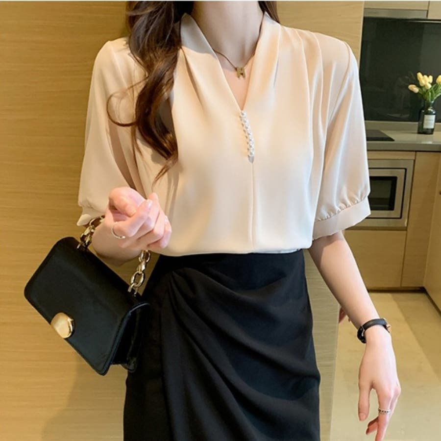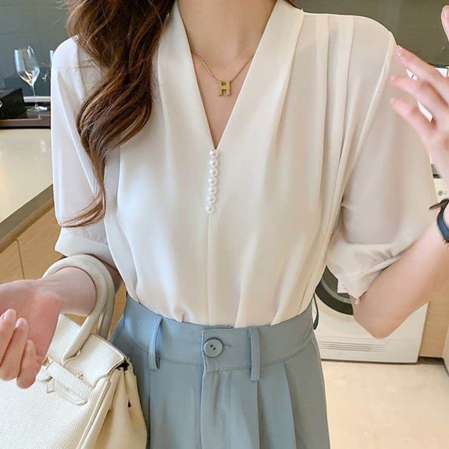 シャツ半袖 ブラウス 半袖 パール付きトップス パール付きシャツ vネックシャツ 五分丈 半袖ブラウス 半袖シャツブラウス カジュアル 夏トップス 夏服 オフィスブラウス 韓国トップス ぱる