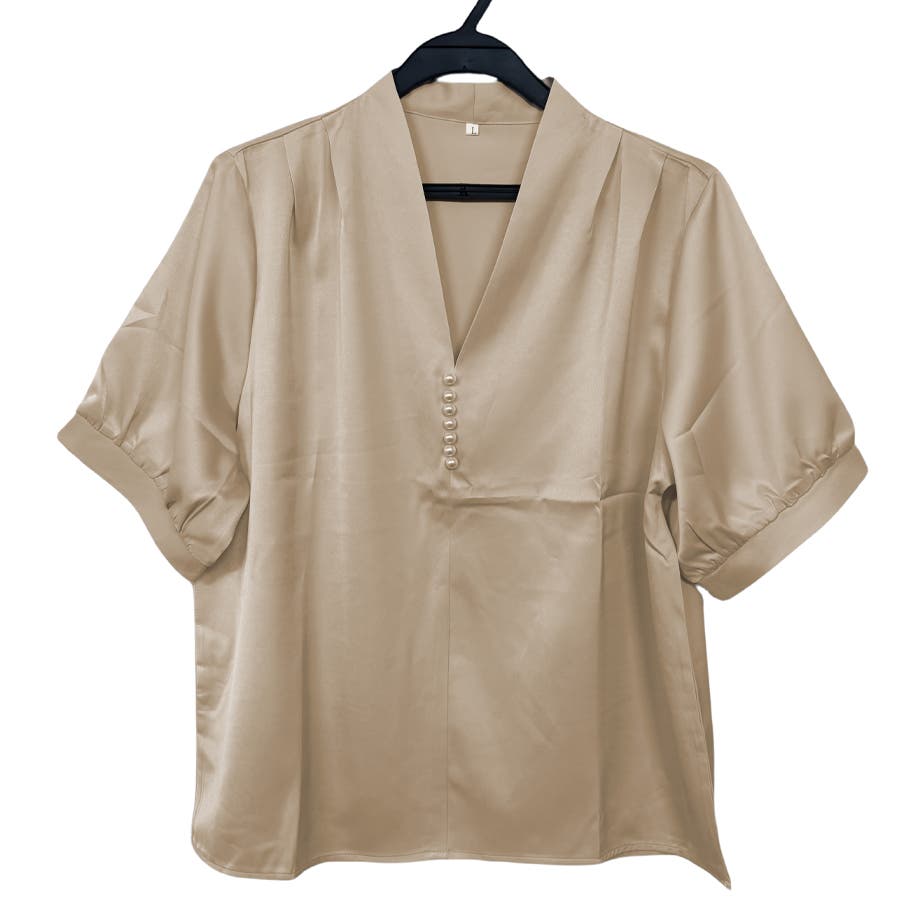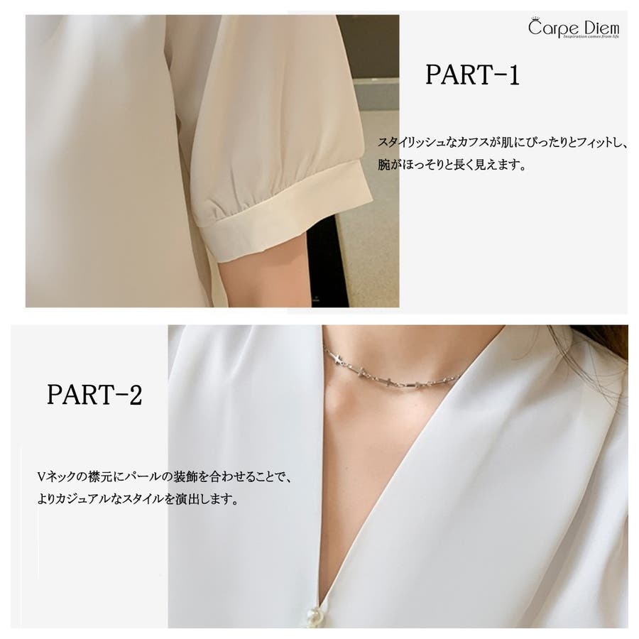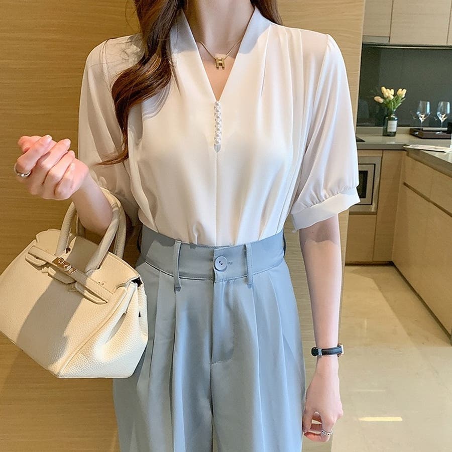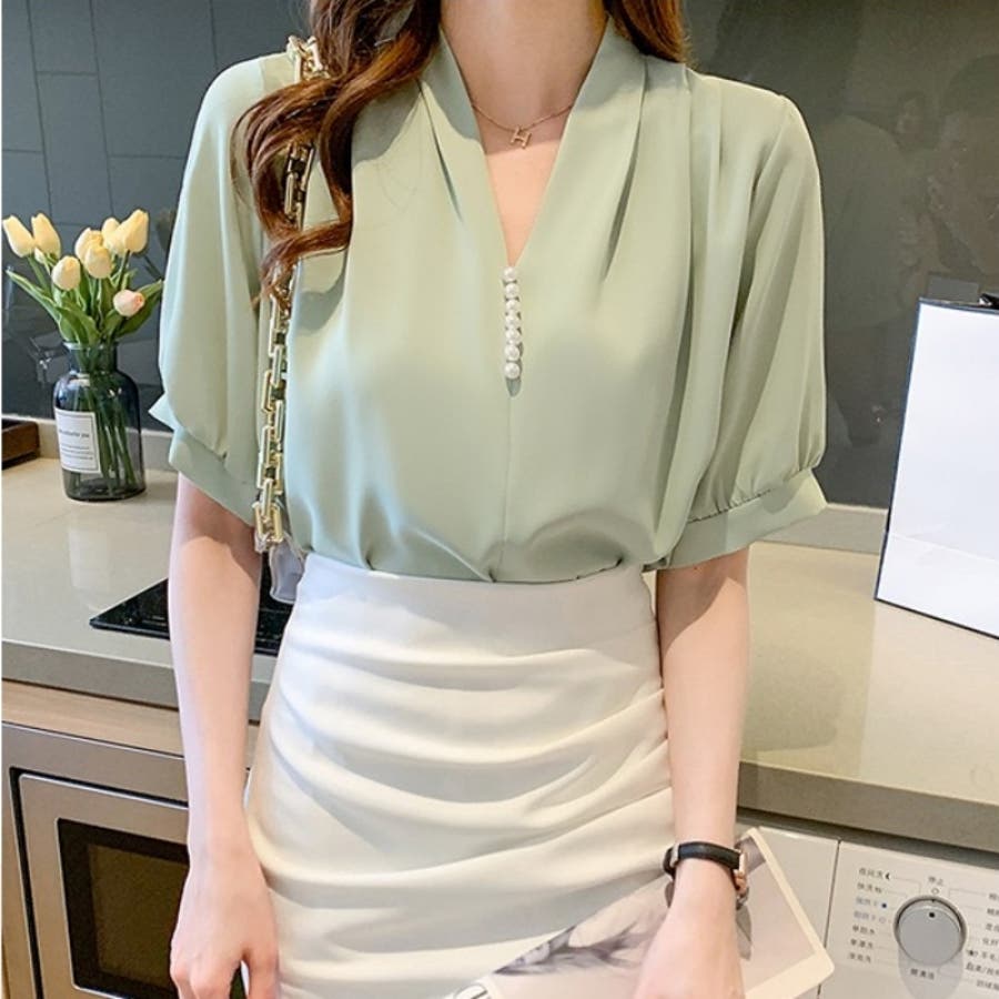 シャツ半袖 ブラウス 半袖 パール付きトップス パール付きシャツ vネックシャツ 五分丈 半袖ブラウス 半袖シャツブラウス カジュアル 夏トップス 夏服 オフィスブラウス 韓国トップス ぱる