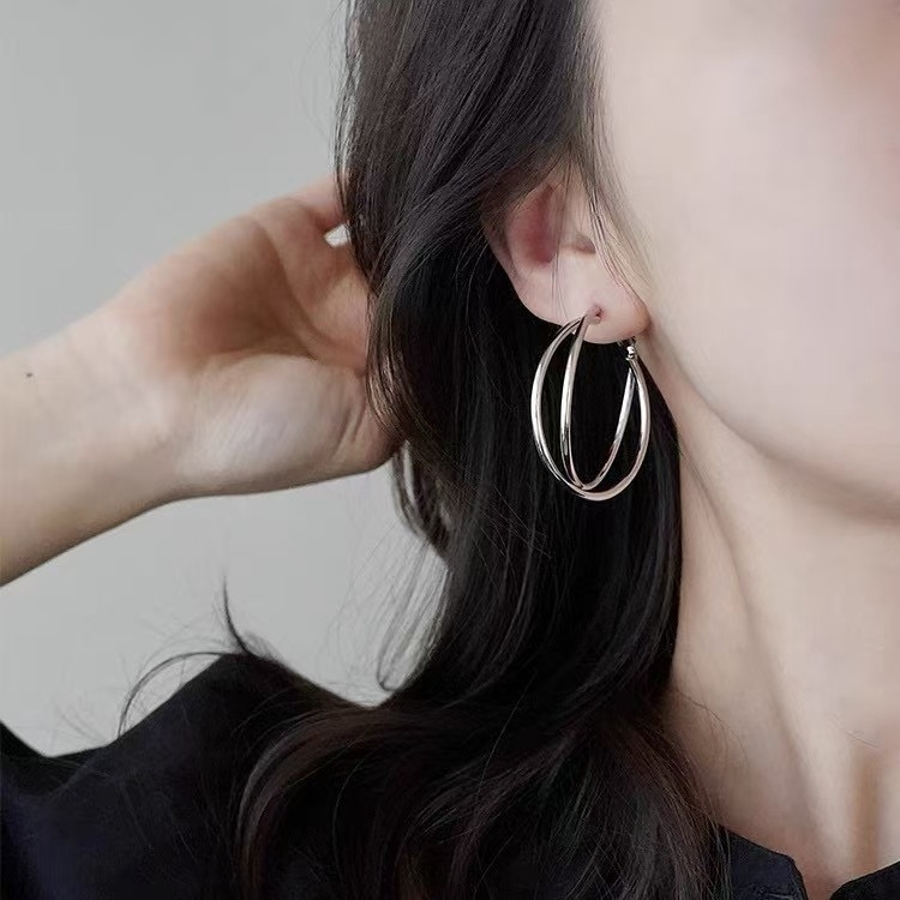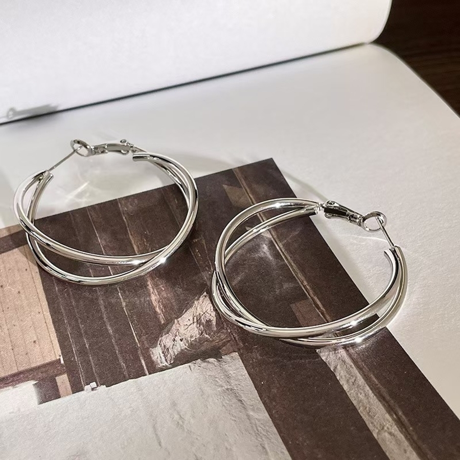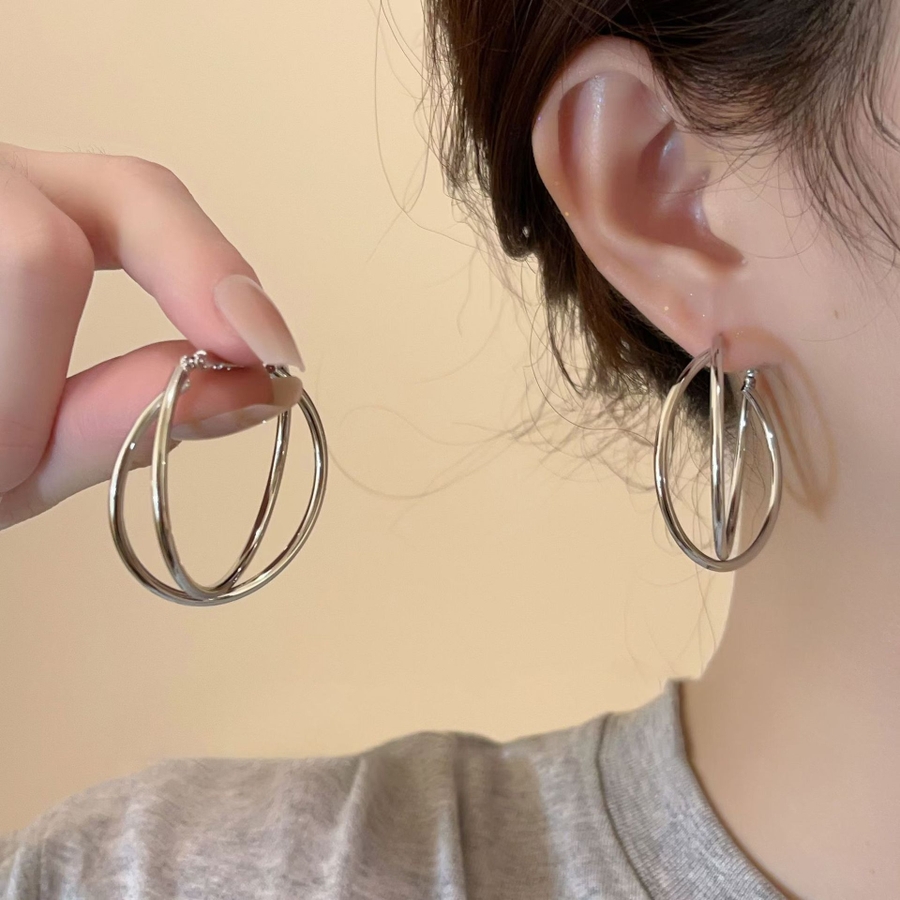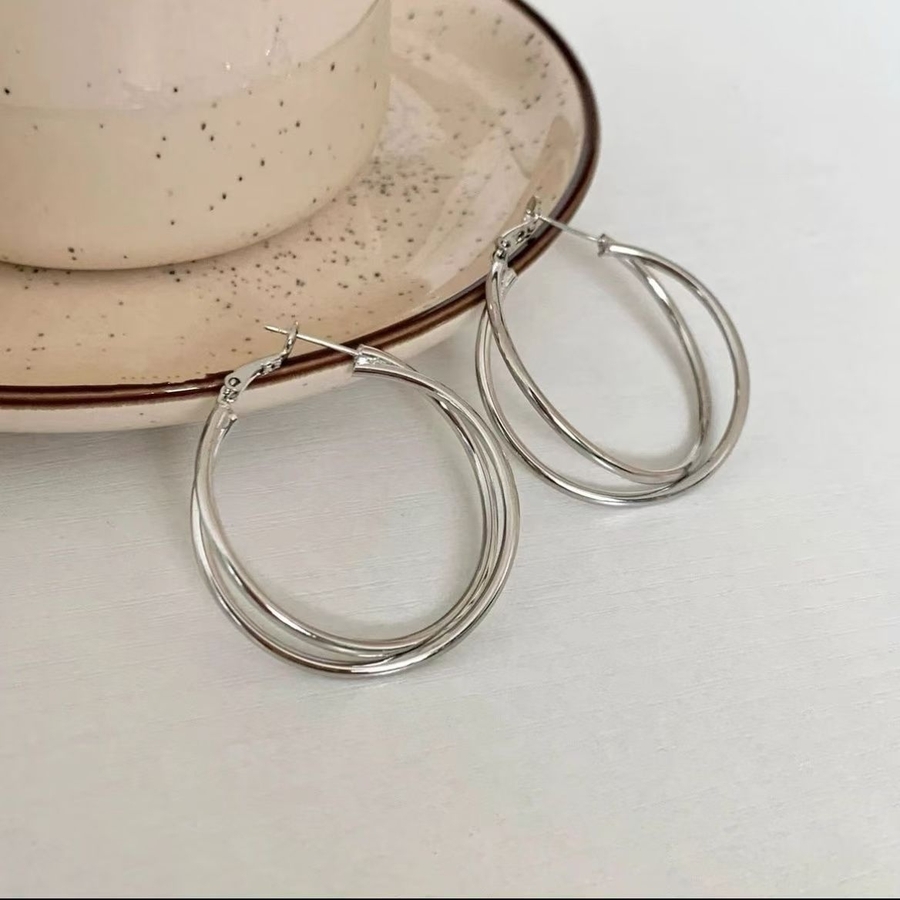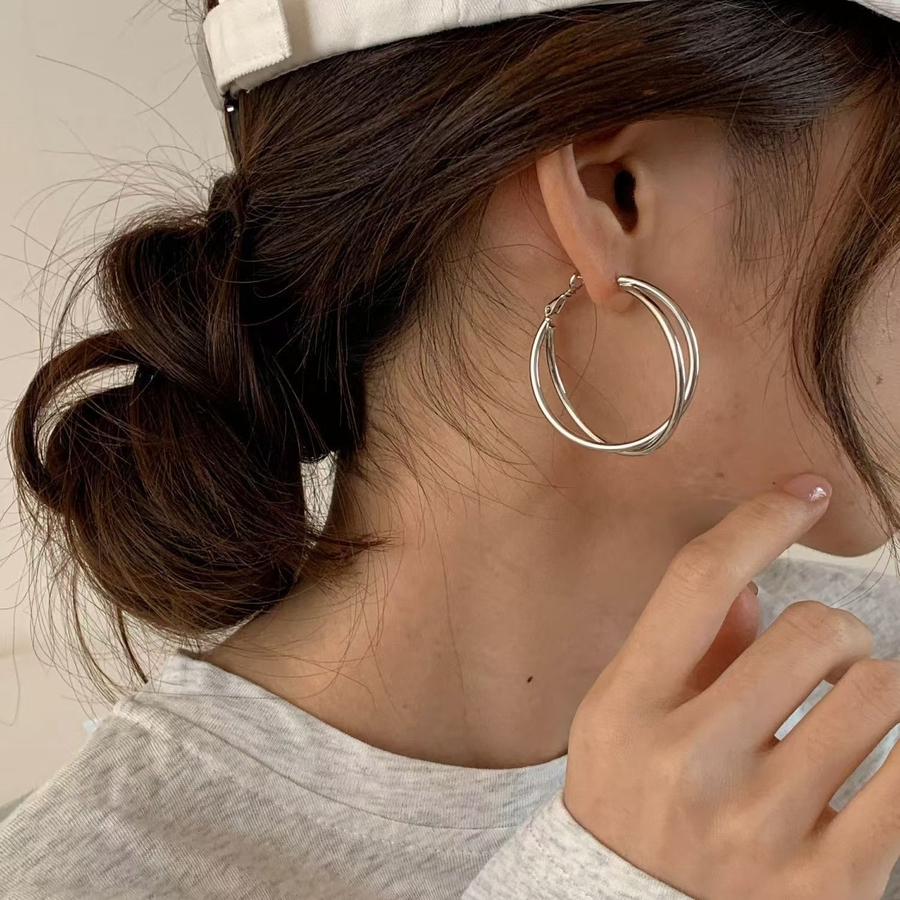 ダブルレイヤーフープ:2 重のラインが重なるデザインで、洗練された大人っぽい印象を演出し、モノトーンコーデにも馴染みやすい