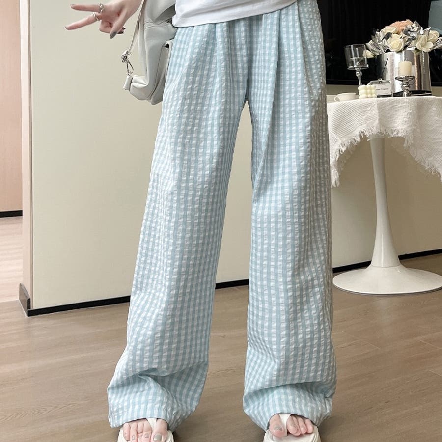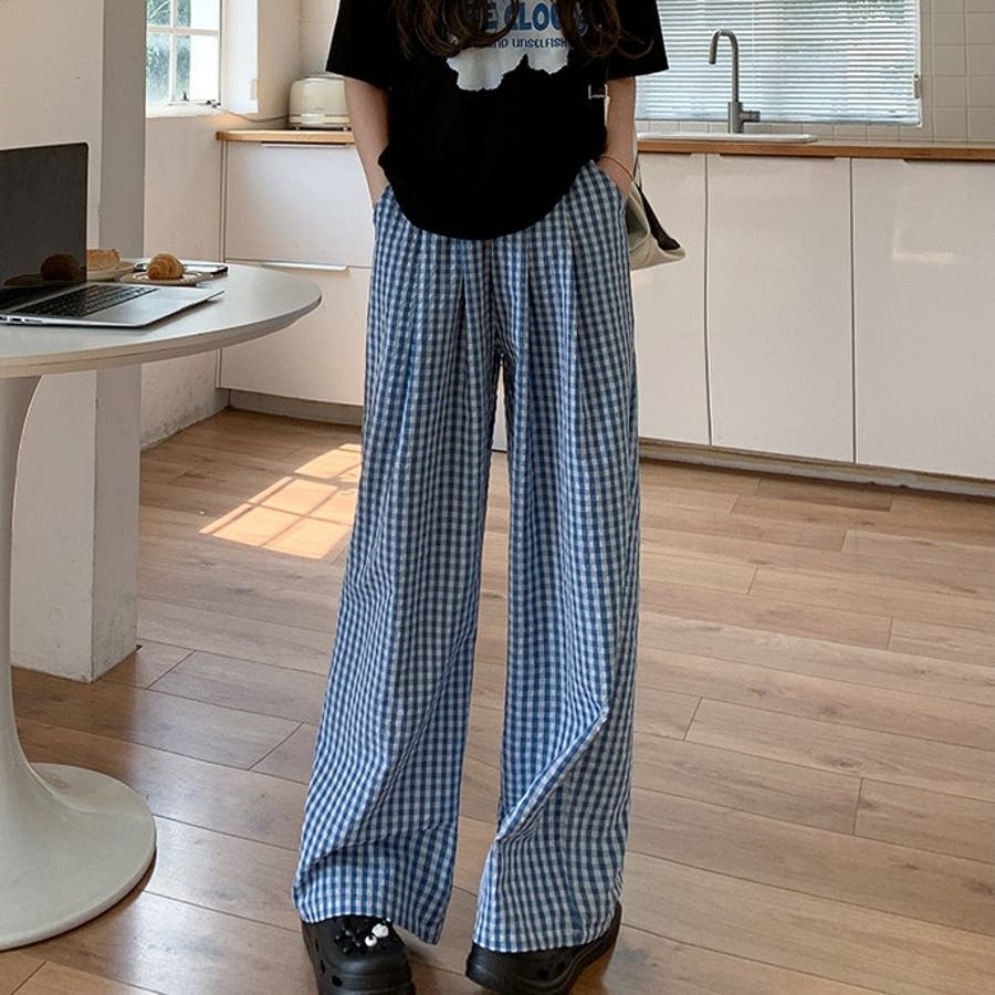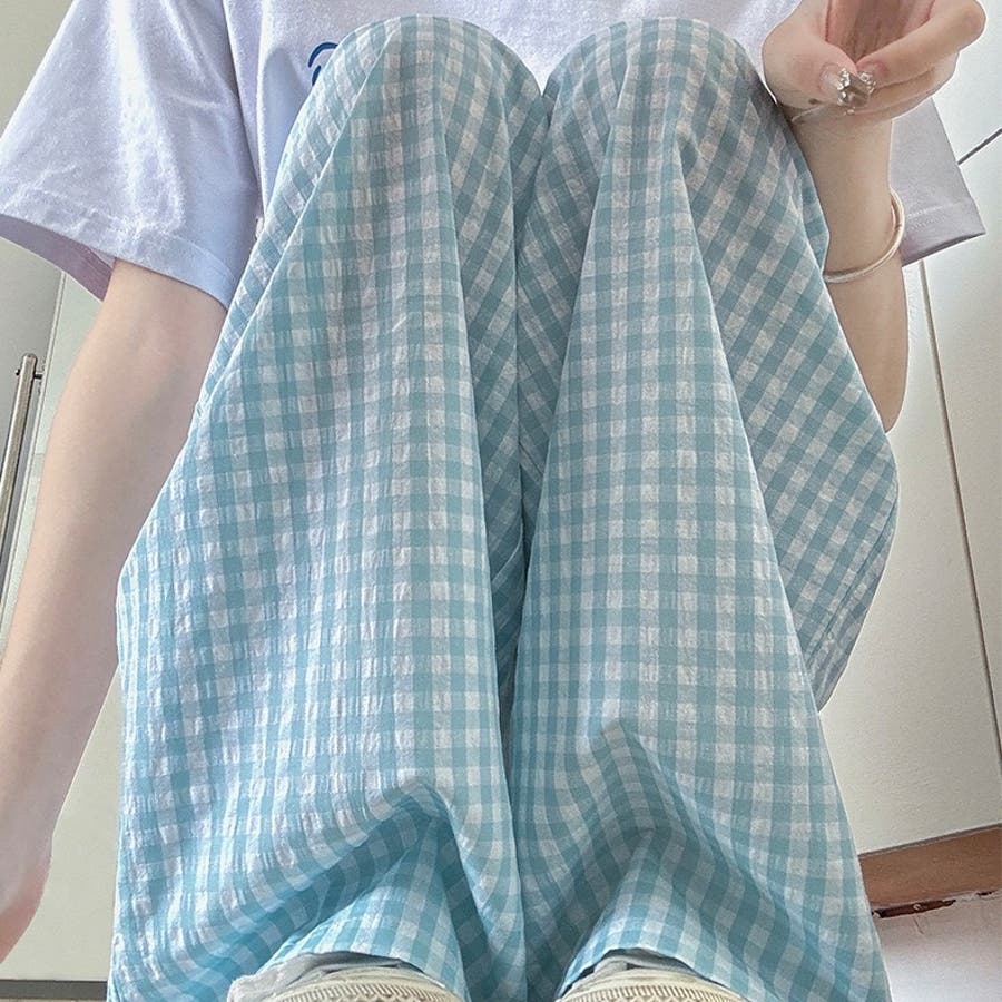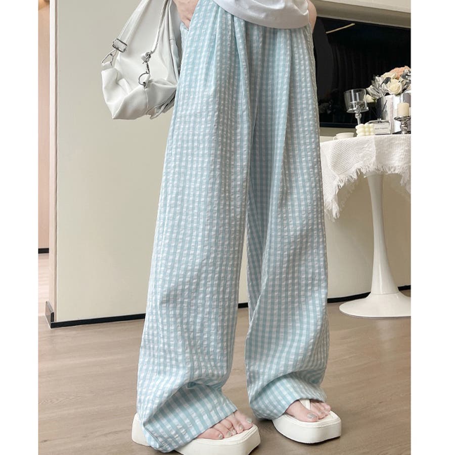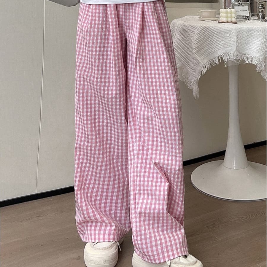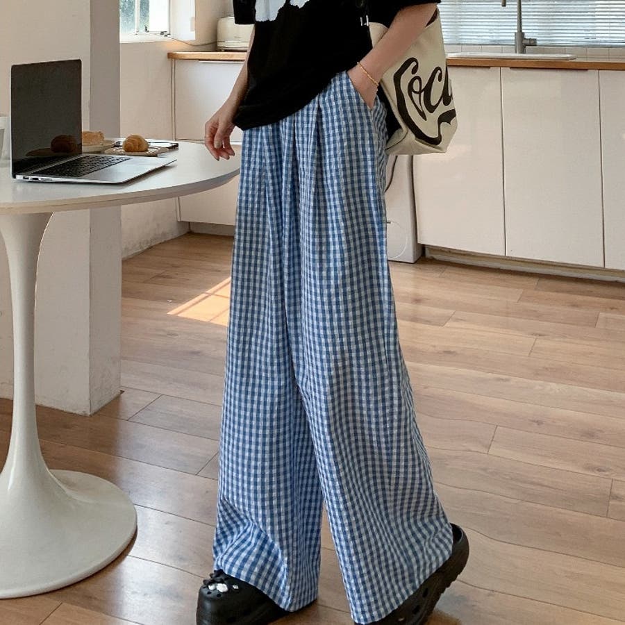 爽やかなギンガムチェック柄が目を引く、涼しげで可愛いワイドパンツ。