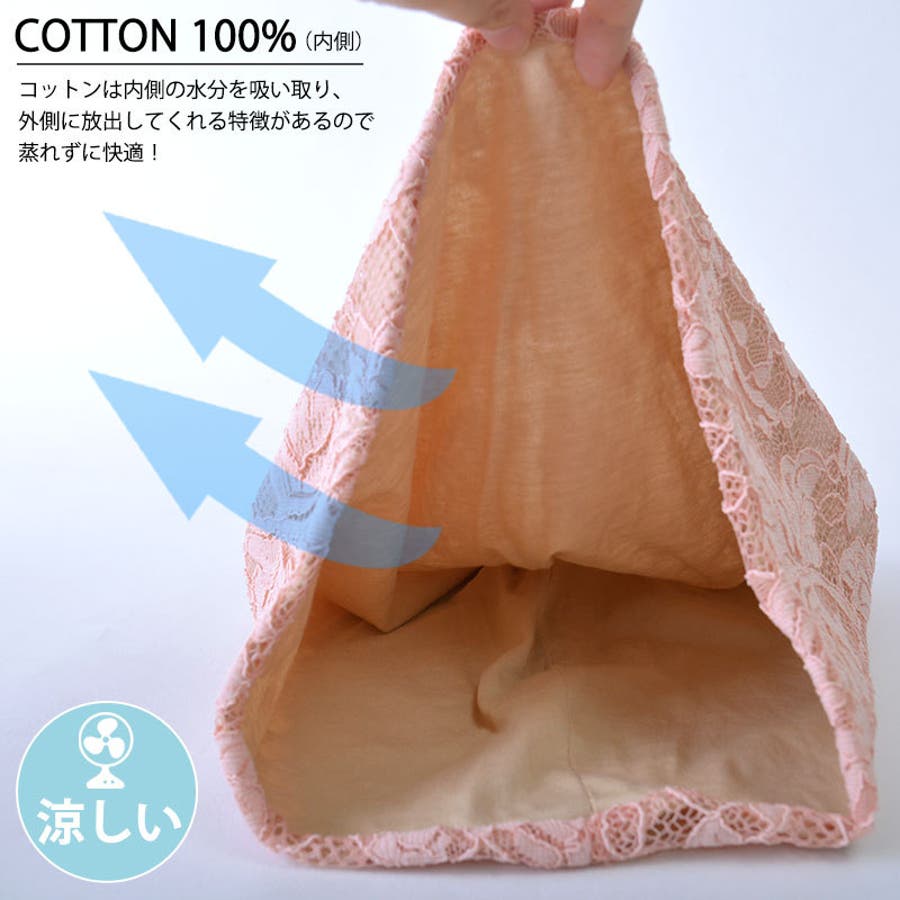 手洗いで洗濯可能な華やかなレース生地で、裏生地は通気性・吸水性抜群のコットン100%を使用し、透けないデザイン。