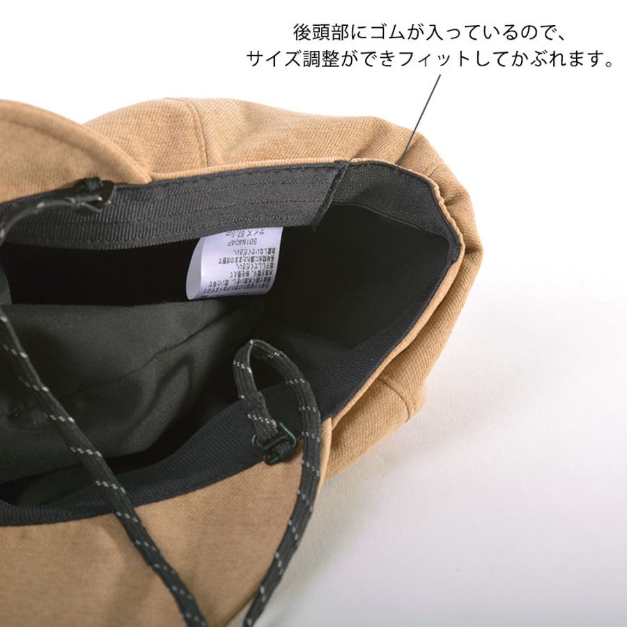 後頭部にはゴム入りでフィットしあご紐付きで風で飛ばされる心配もありません。