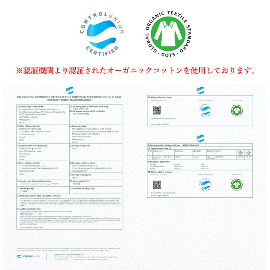 ※認証機関より認証されたオーガニックコットンを使用しております。