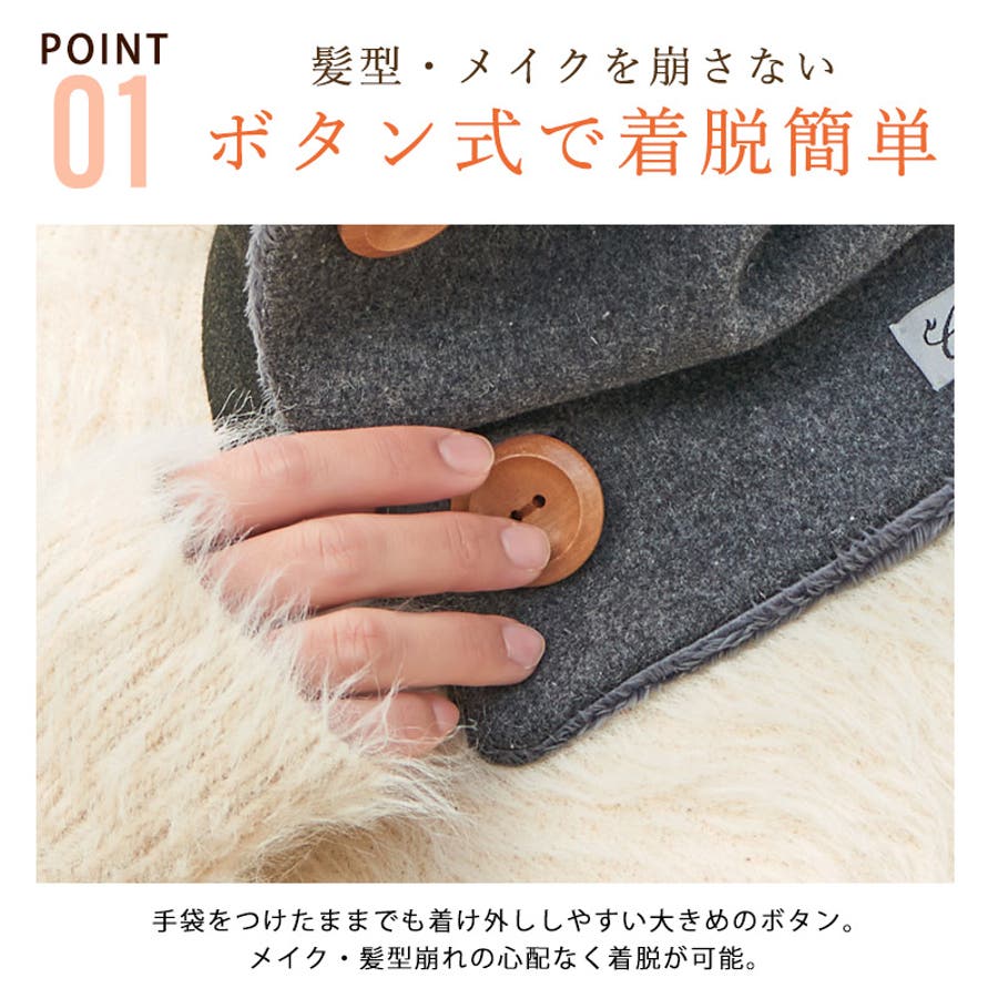 ボタン付きなので頭からかぶらず装着できるので髪型やメイクが崩れることなくつけることが出来るのも最大のポイント。