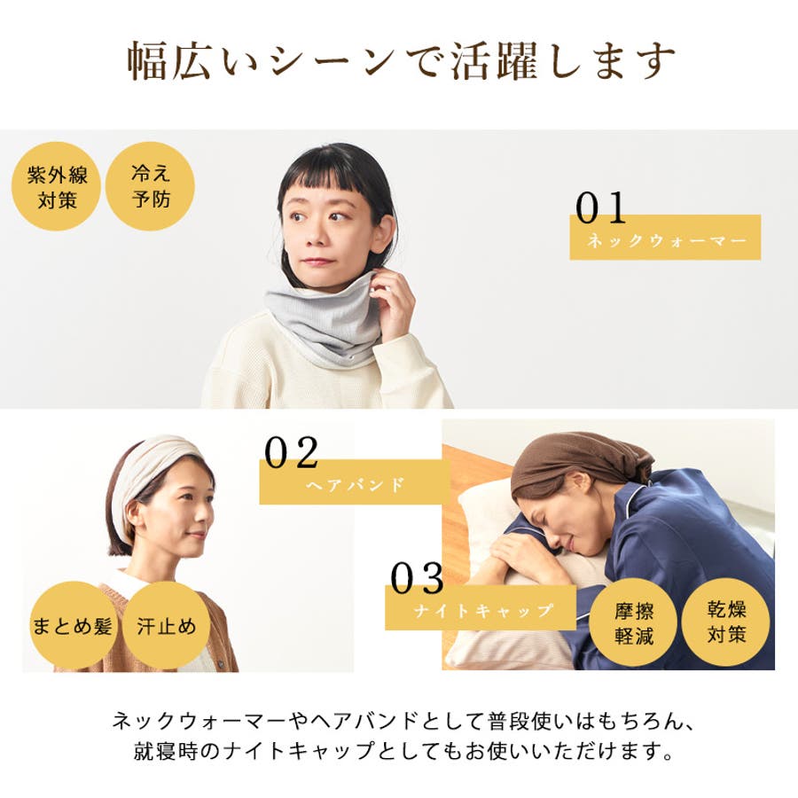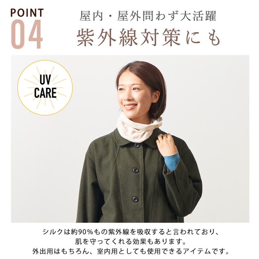 ネックウォーマーとして、紫外線対策・そして冷房よけとして、外出用としてはもちろん、室内でリラックスタイムや就寝時などでも長時間着用時でも安心です。