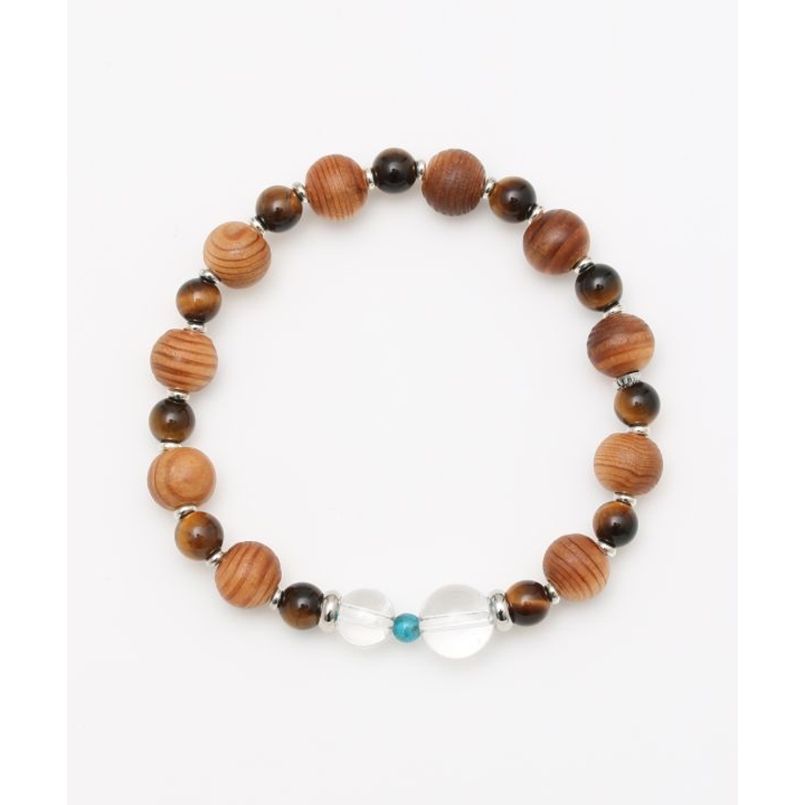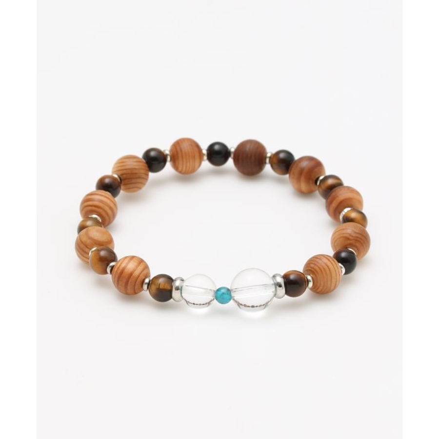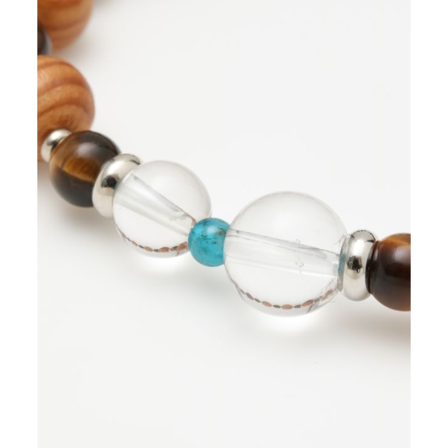 屋久杉やタイガーアイなどを規則的に組み、ポイントで非対称に配置した水晶が特徴の一品。他にはないブレスレットをお探しの方にお勧めです。