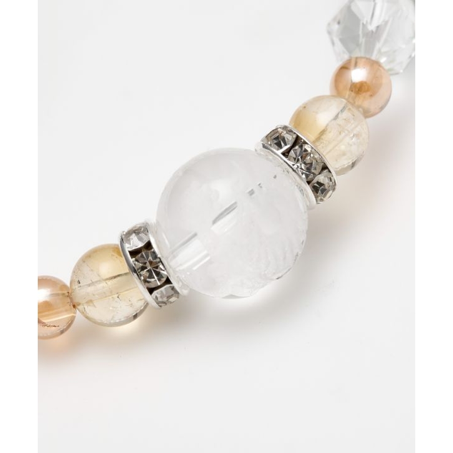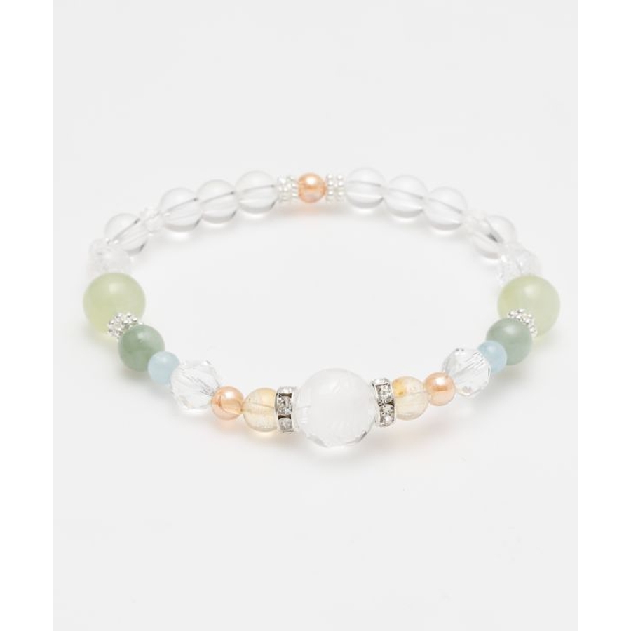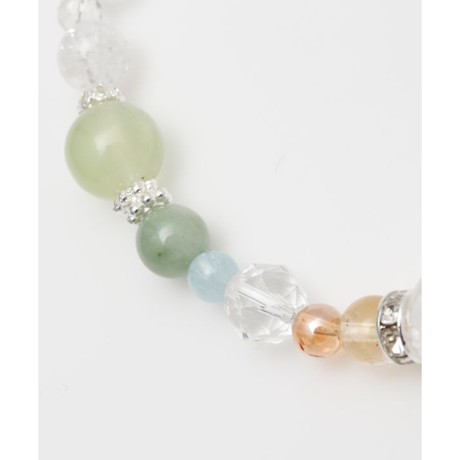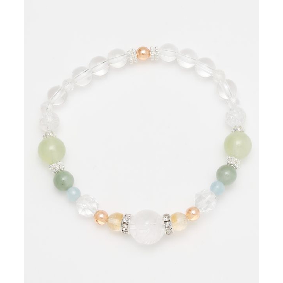 親玉に龍の彫刻が施された水晶をあしらい、華やかな天然石と組み合わせました。煌びやかなロンデルが女性らしく、上品な印象をもたらします。※こちらの商品は、種類によって着色加工を施した天然石を使用しております。プレナイト(葡萄石)【思考力・直感力を高める】氾濫する情報の中から自分に必要な物だけを選び、正しく判断できるように導いてくれると云われています。周囲に流されやすい、優柔不断だという方には特におすすめです。