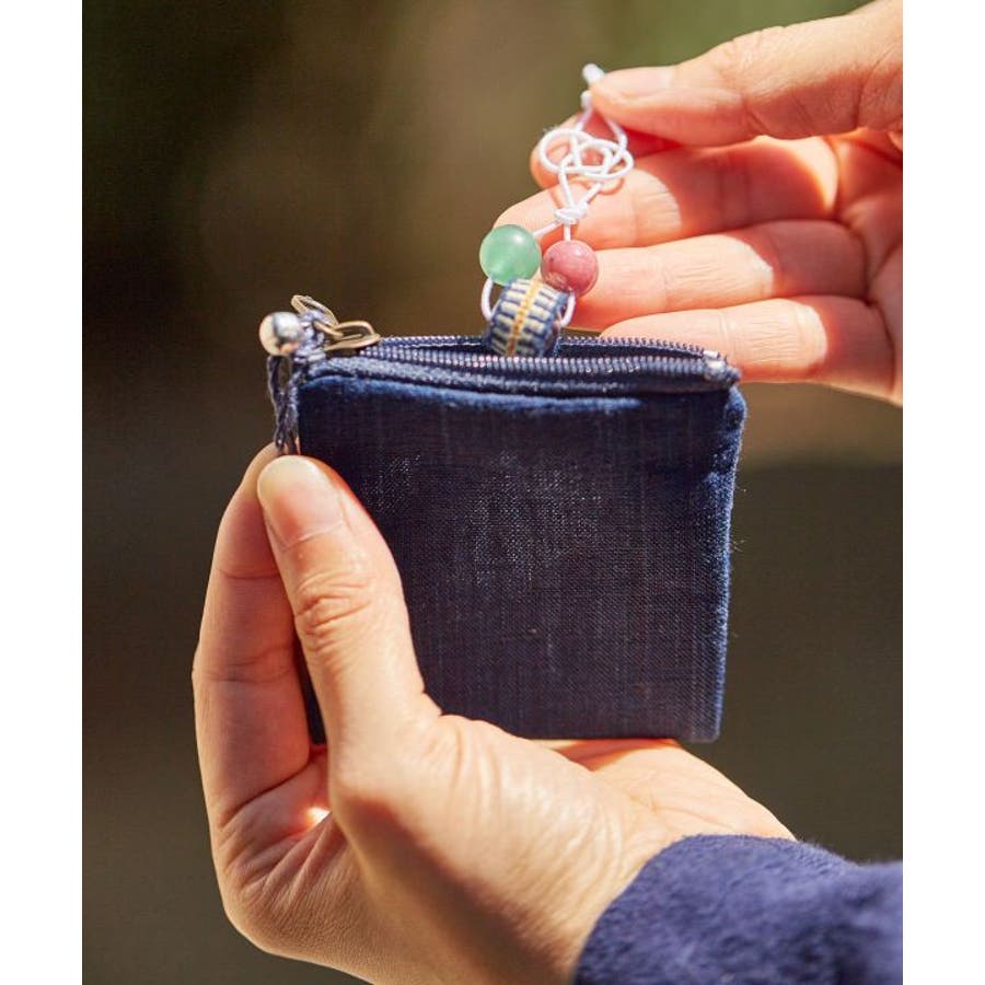 三重県の名産品「御絲(みいと)織り」生地を使用したシリーズ。藍染めで染め、独特な風合いで織られ、天照大御神の御衣として奉納された松阪地方の織物が、今の御絲の始まりと云われている。小さいポーチ型で、ブレスレットなどのアクセサリーを収納出来ます
