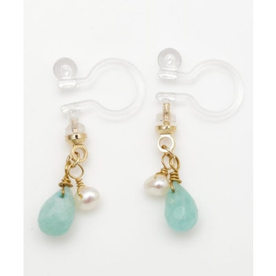 ピアスを着けている様に見える、ノンホールピアスタイプのイヤリング。雫型の天然石と真珠を組み合わせ、可憐で女性らしいデザインに仕上げました。