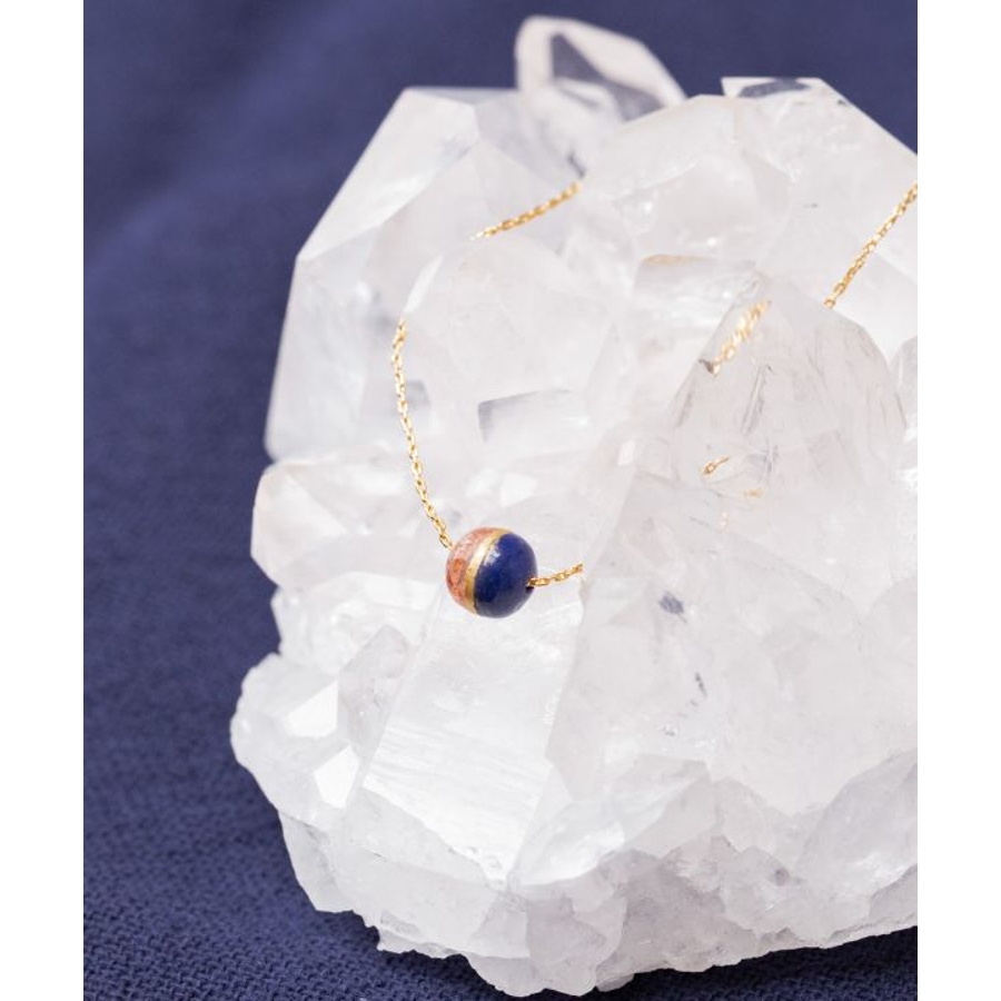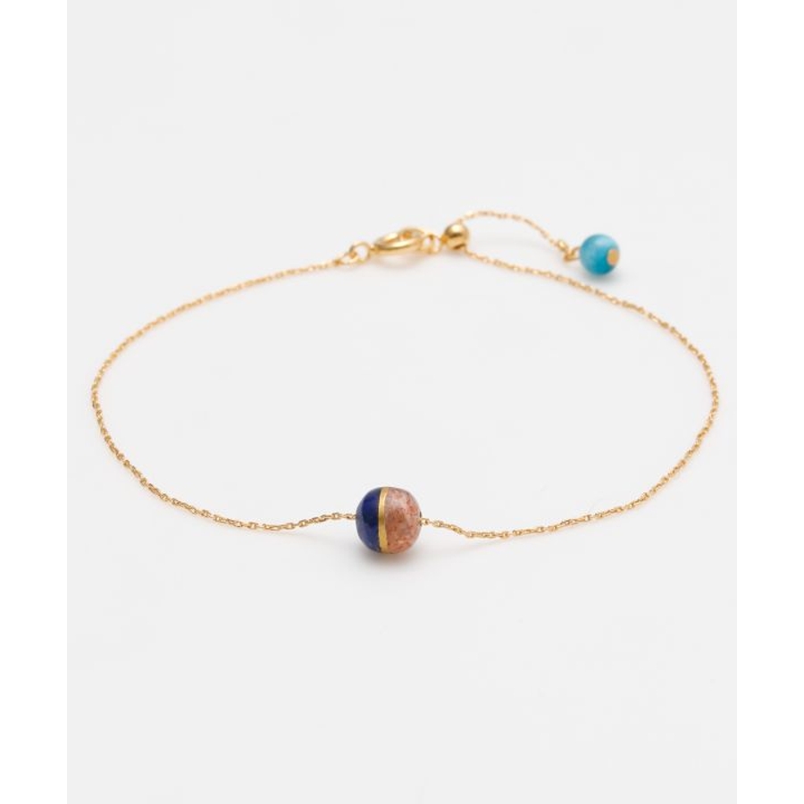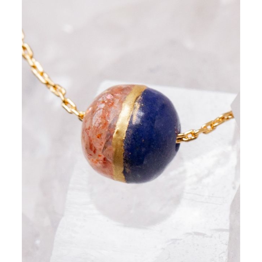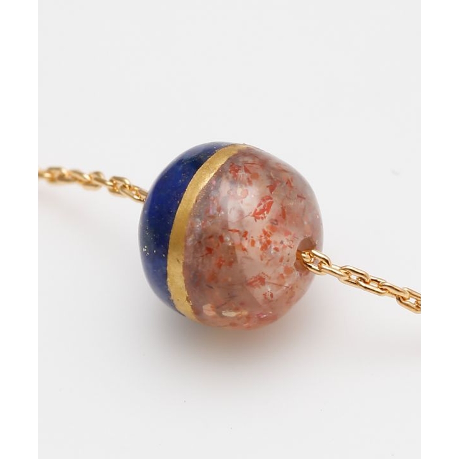 太陽の女神・天照大神(あまてらすおおみかみ)と、海と嵐の神・須佐之男命(すさのおのみこと)をイメージしたブレスレットです。輝くサンストーンは光と希望を司るアマテラスを、深い青のラピスラズリは勇気と行動力を象徴するスサノオを表現。姉弟の神の絆を思わせる配色に、金継ぎをイメージしたデザインを加え、調和と再生の美しさを表しました。スライドチェーンでサイズ調整が可能です。