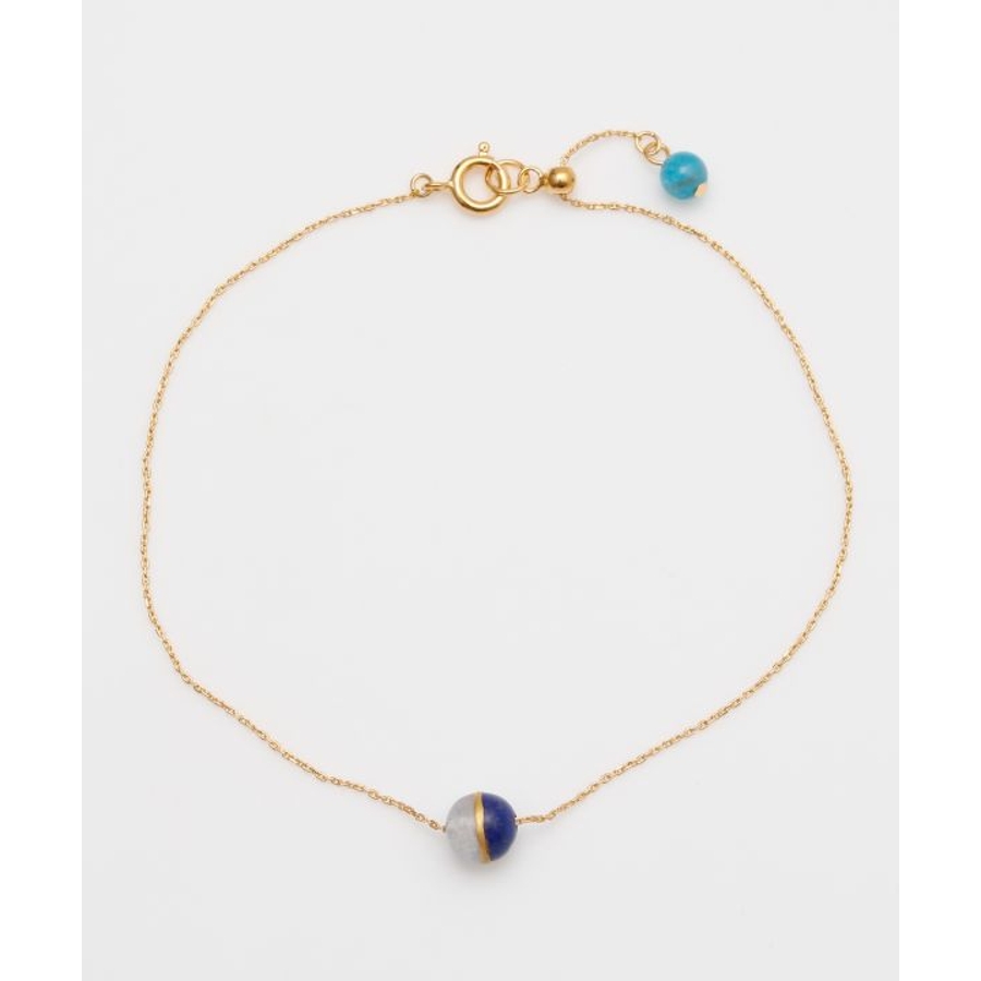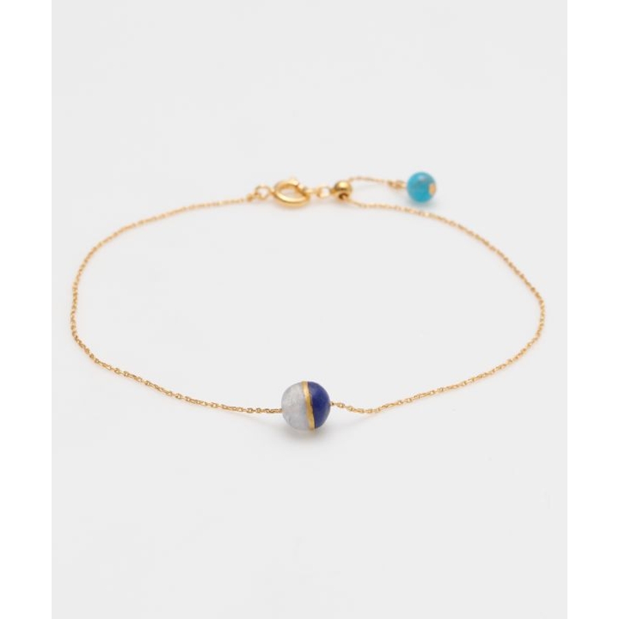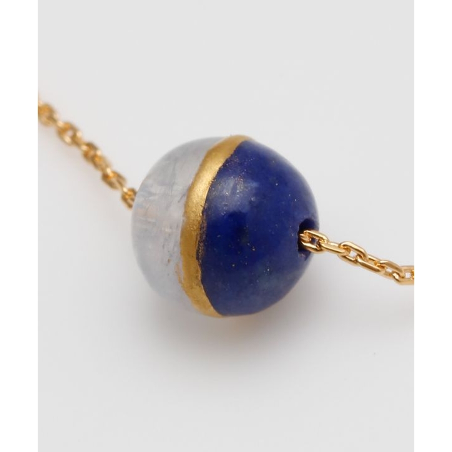 月の神・月読命(つくよみのみこと)と、海と嵐の神・須佐之男命(すさのおのみこと)をイメージしたブレスレットです。穏やかな輝きを放つレインボームーンストーンは静けさと調和を司るツクヨミを、深い青のラピスラズリは力強さと勇気を象徴するスサノオを表現。兄弟神の結びつきを、金継ぎを思わせるデザインで品よく仕上げました。スライドチェーンでサイズ調整が可能です。