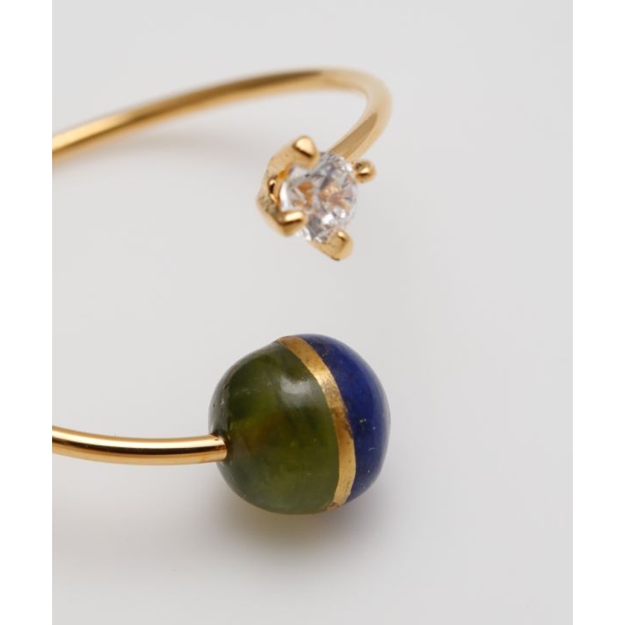 日本神話に登場する夫婦の神、須佐之男命(すさのおのみこと)と櫛名田比売命(くしなだひめ)をイメージしたリングです。深い青のラピスラズリは力強く勇敢なスサノオを、淡い緑のペリドットは優しく包み込むクシナダを表現。金継ぎを思わせるデザインが、絆や再生の象徴として輝きます。互いを支え合う力を感じられるリングです。