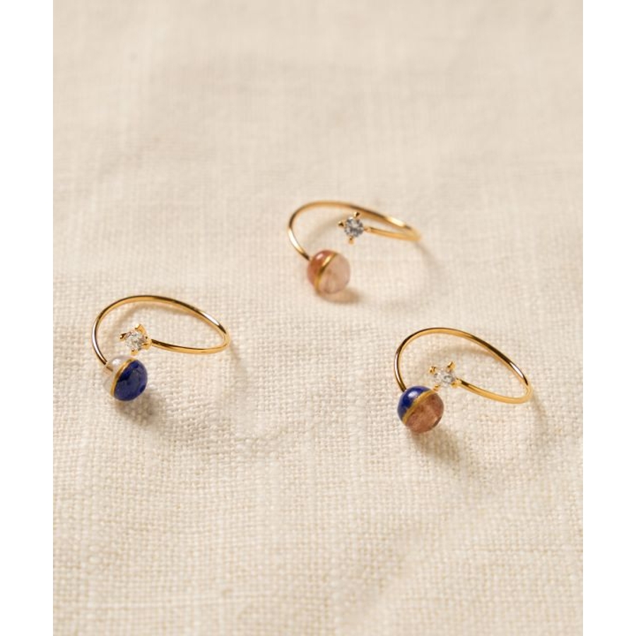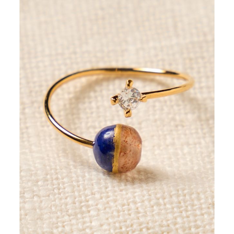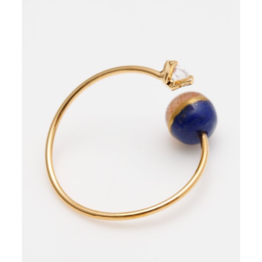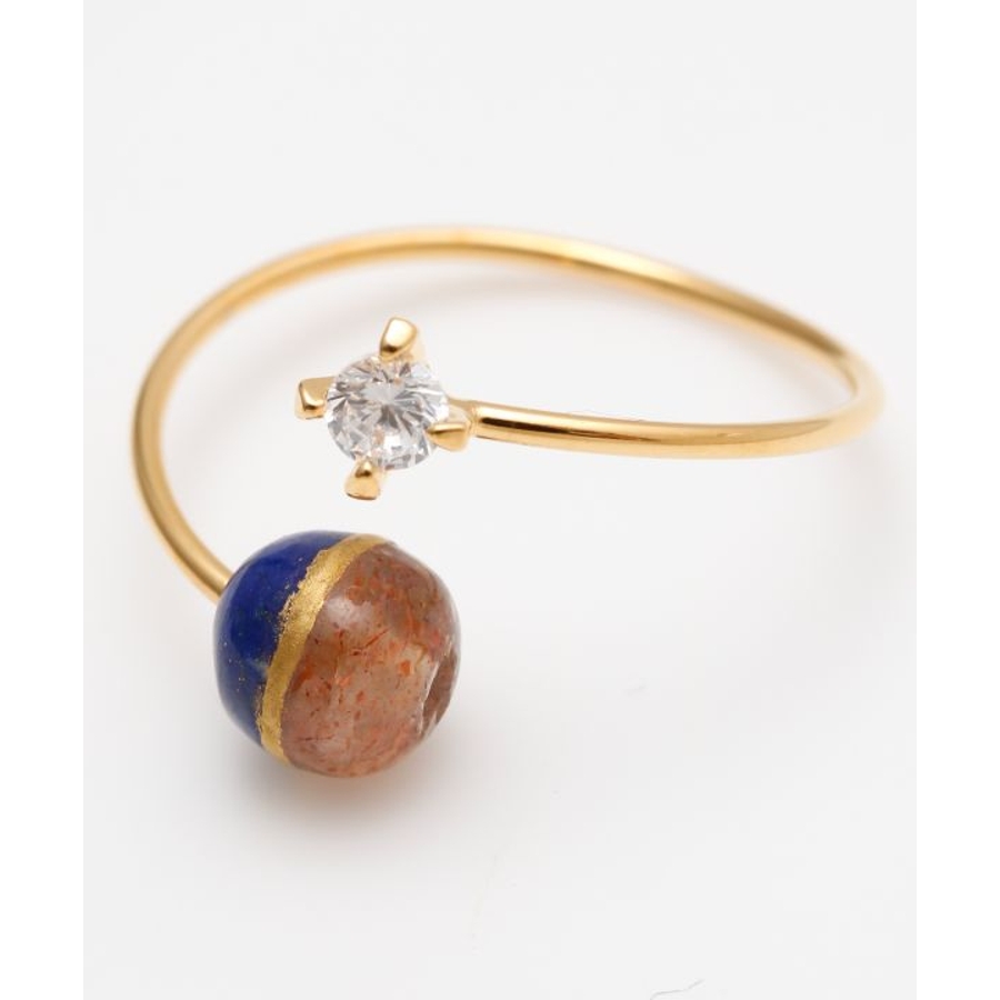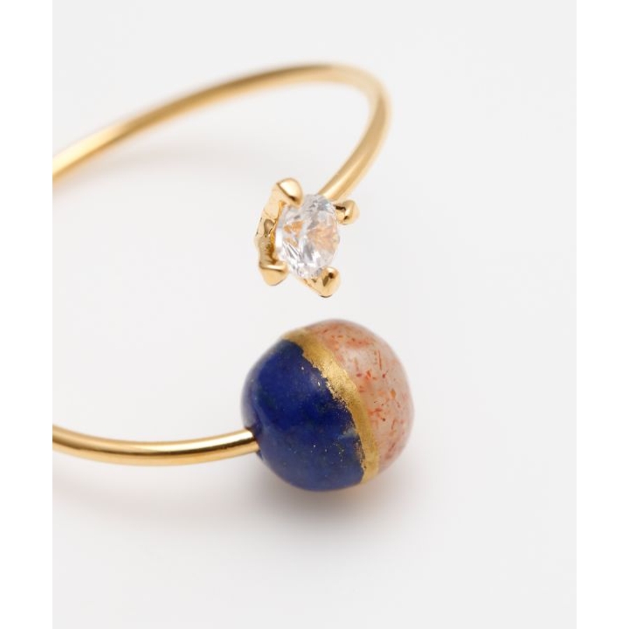 太陽の女神・天照大神(あまてらすおおみかみ)と、海と嵐の神・須佐之男命(すさのおのみこと)をイメージしたリングです。輝くサンストーンは光と希望を司るアマテラスを、深い青のラピスラズリは勇気と行動力を象徴するスサノオを表現。姉弟の神の絆を思わせる配色に、金継ぎをイメージしたデザインを加え、調和と再生の美しさを表しました。