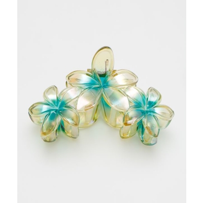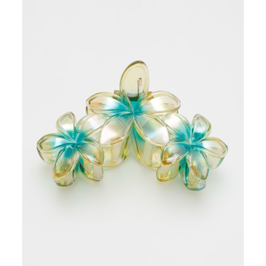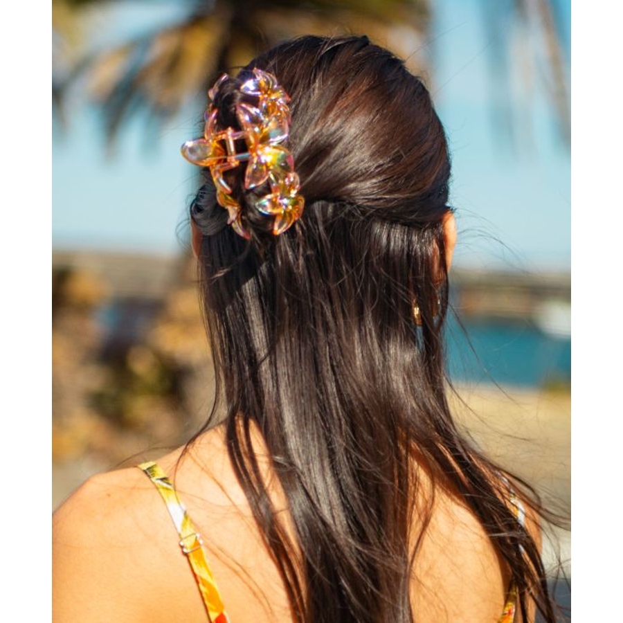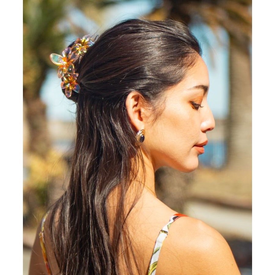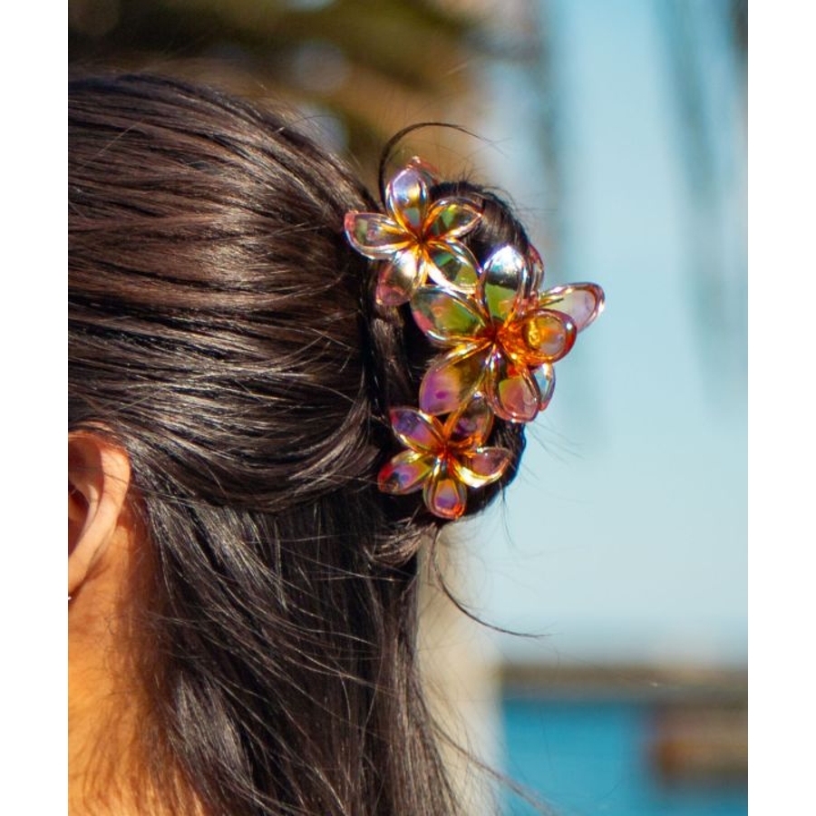 オーロラにきらめくプルメリアの素敵なヘアクリップ。大きめなのでまとめ髪もきまります。