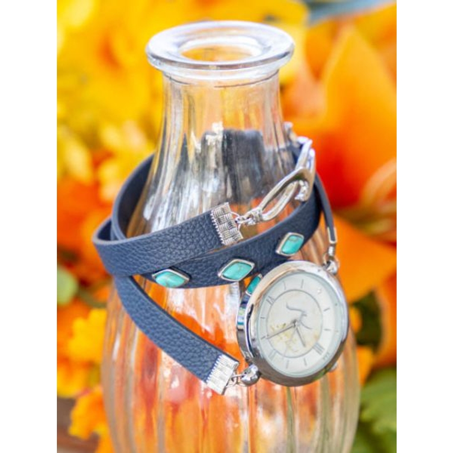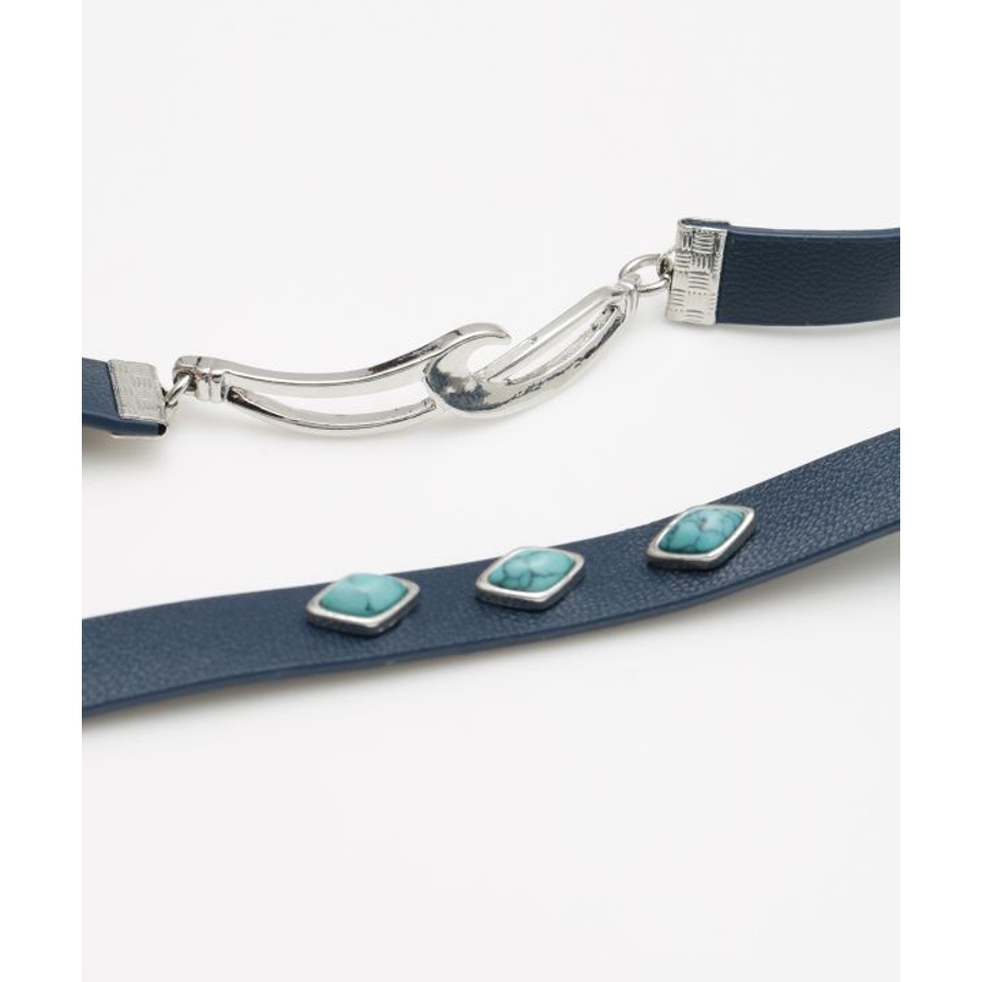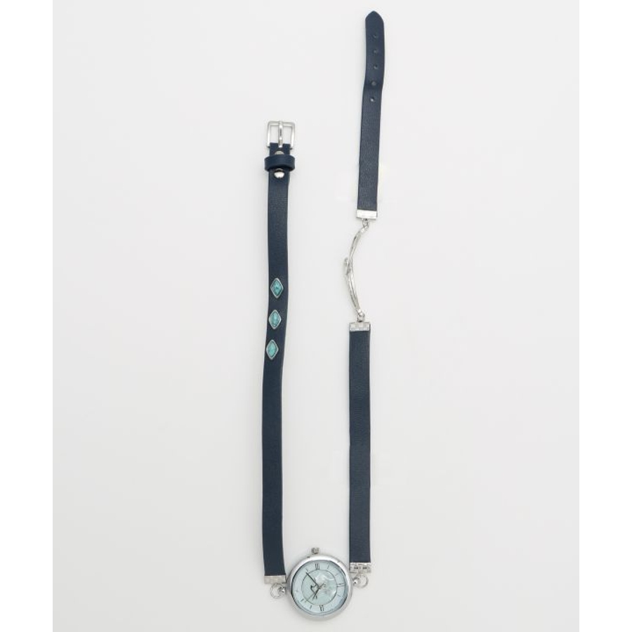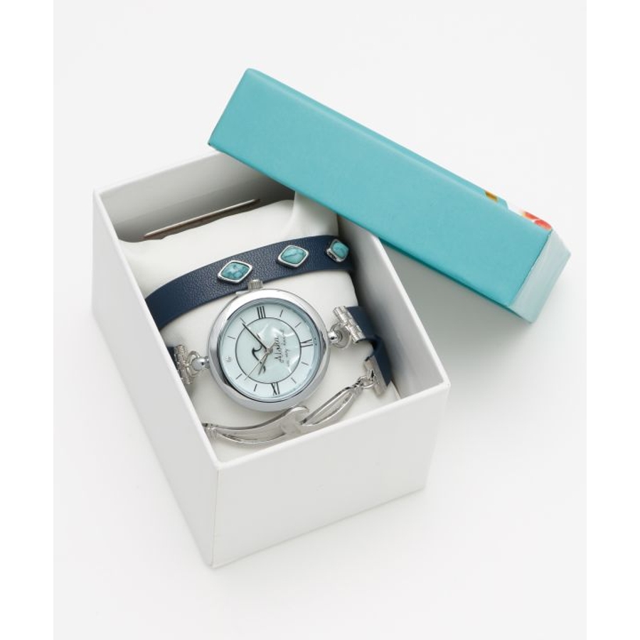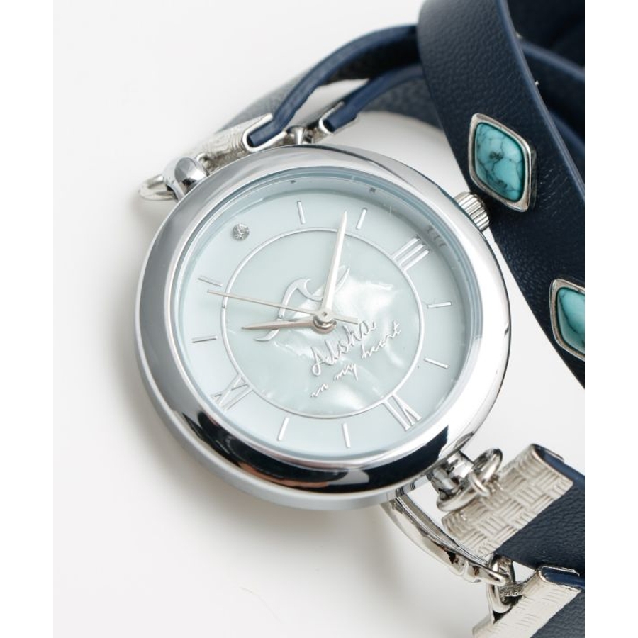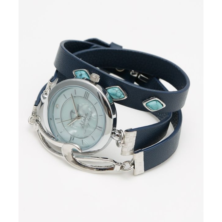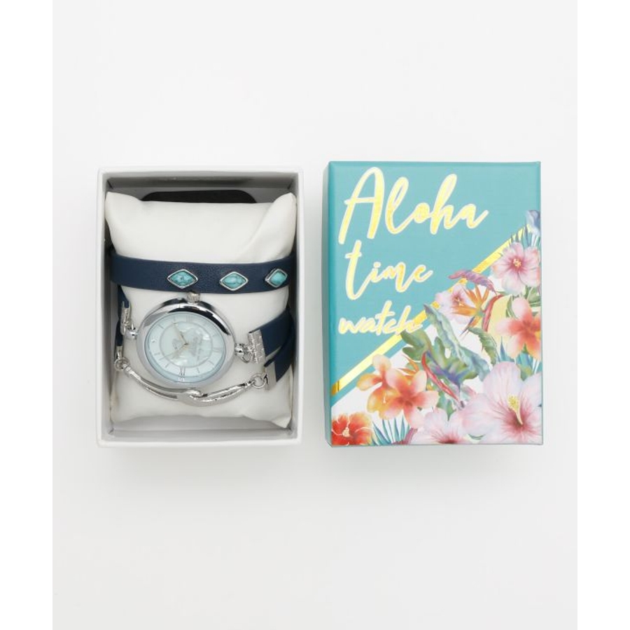 つけると連のブレスレットのようになるレザーの腕時計。ターコイズのブルーとナル(波)のモチーフが時と共にハワイの波のリズムを感じさせます。パッケージつきなのでギフトにもおすすめです。