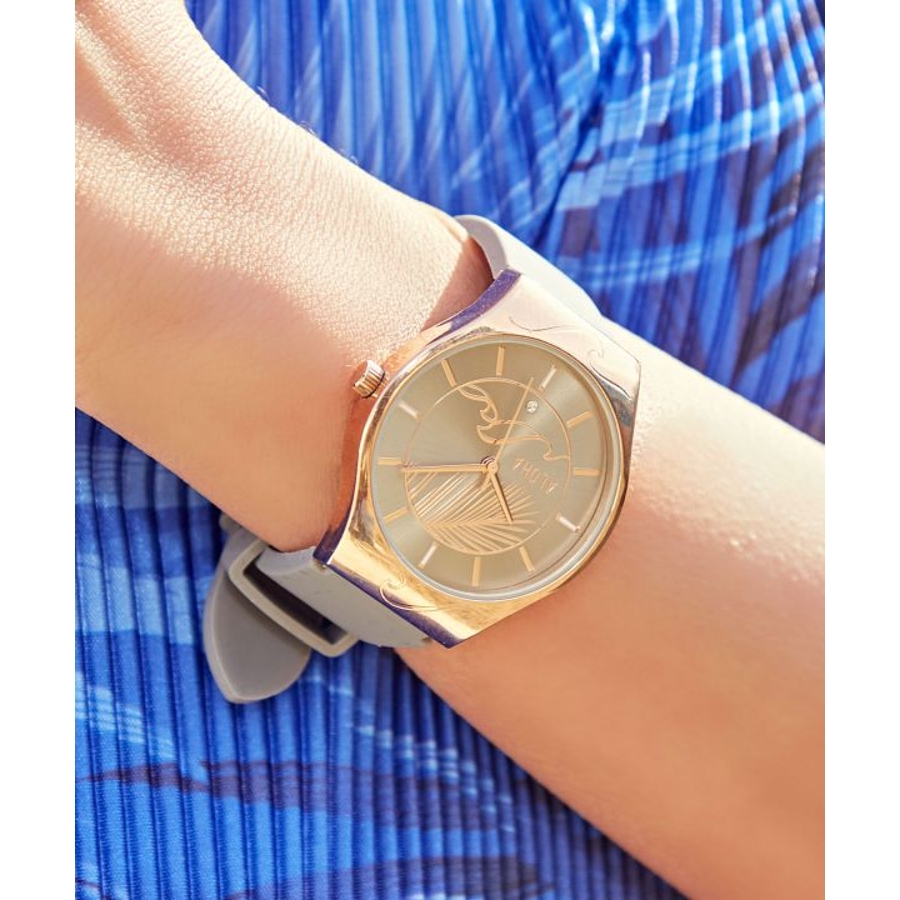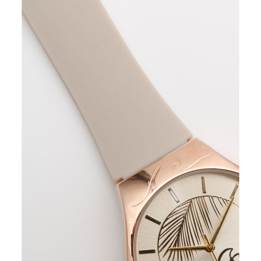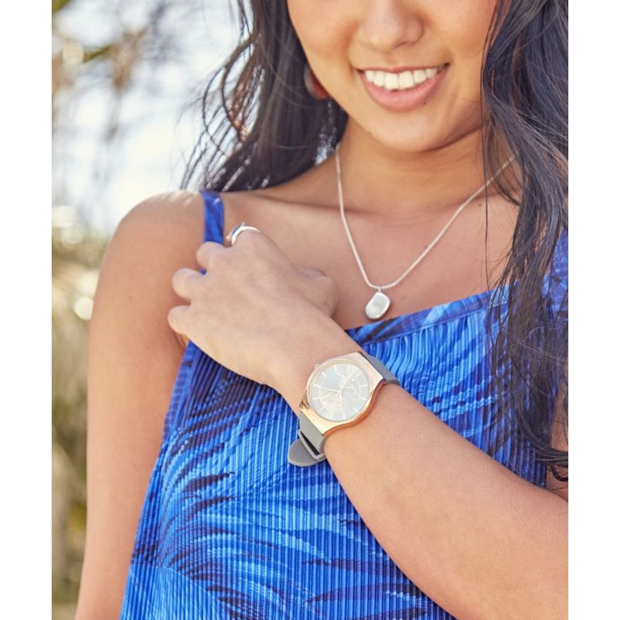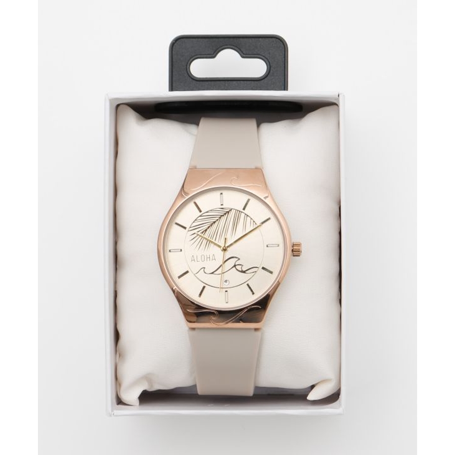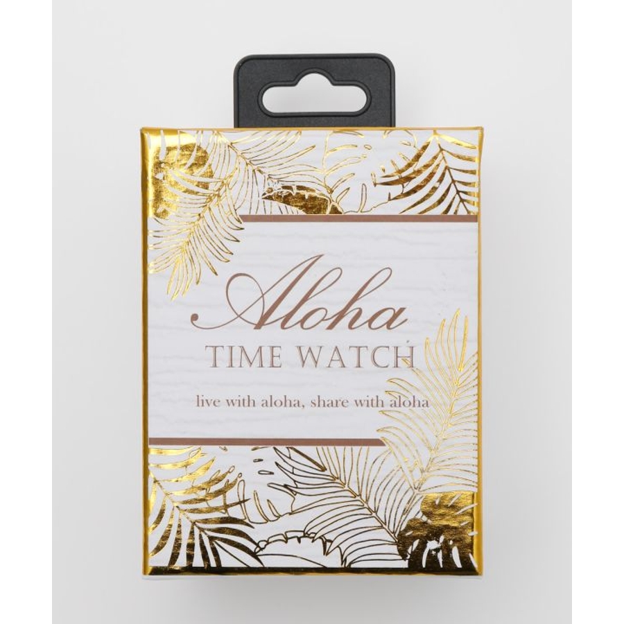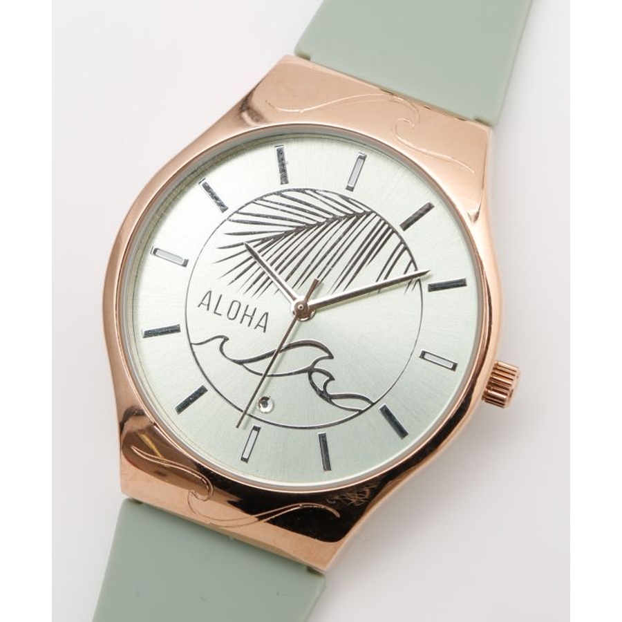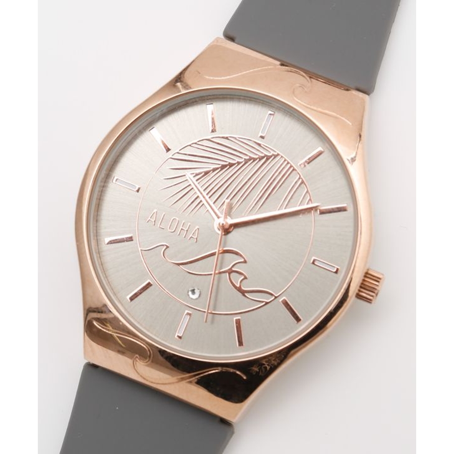 洗練されたカラーにメタリックな文字盤。HAWAIの風にそよぐヤシの葉と、美しい波のシルエットが素敵な腕時計。ALOHAの文字と共に時を刻んでくれます。箱付きなのでギフトにもオススメです。