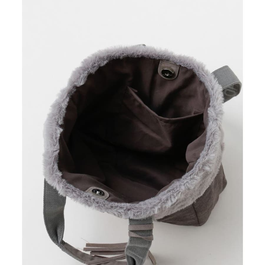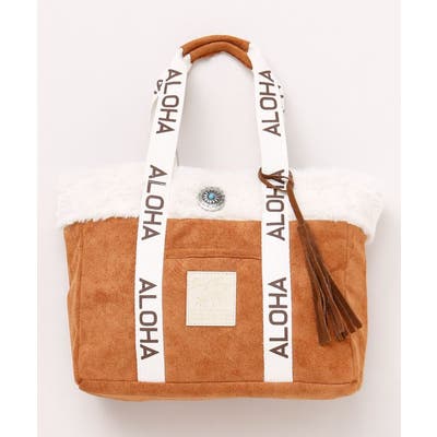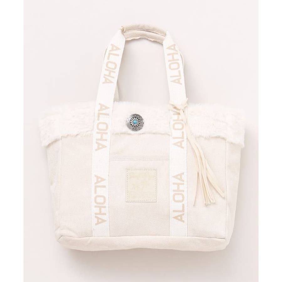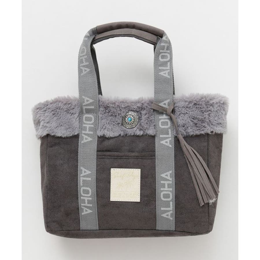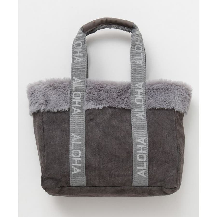 ムートン風生地とファーを組み合わせたサーフカジュアルなミニトート。ハンドルのALOHAの文字がポイント。デイリー使いにぴったりなサイズ感で内ポケットと安心のマグネット付き。ファーの上品さとムートン風素材のスタイリッシュさがミックスされた目を惹くアイテム。