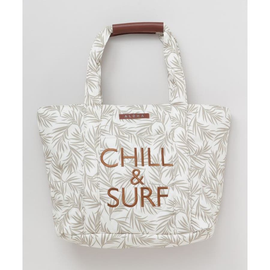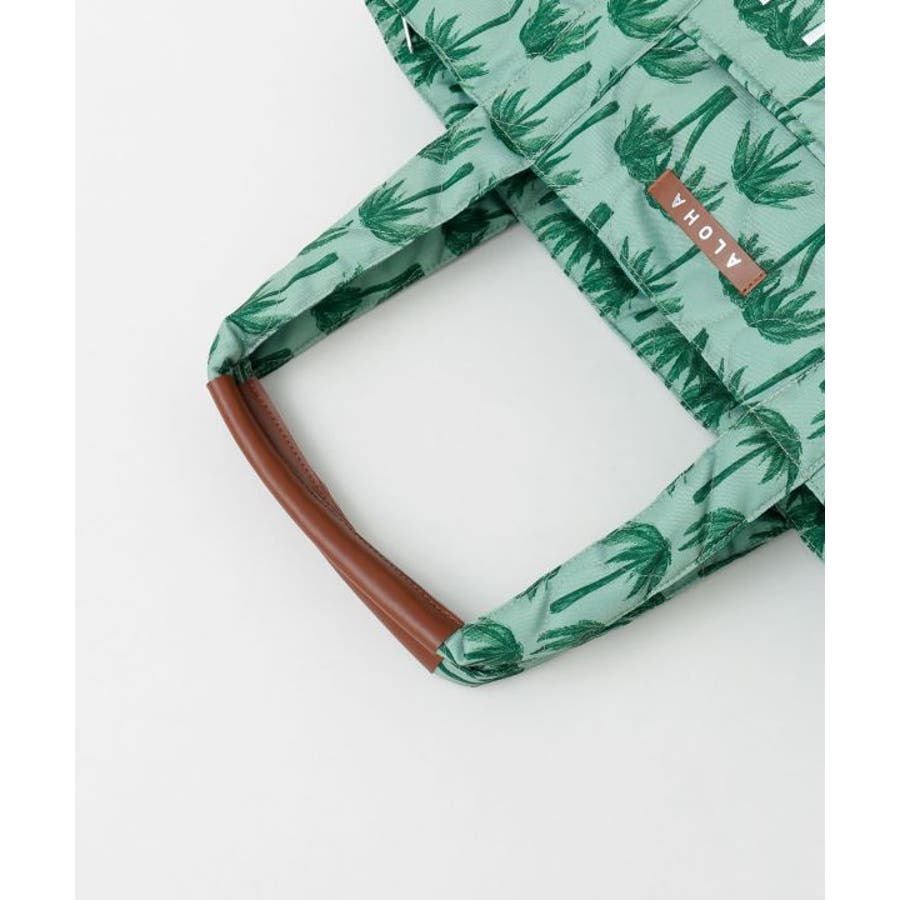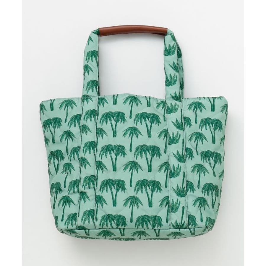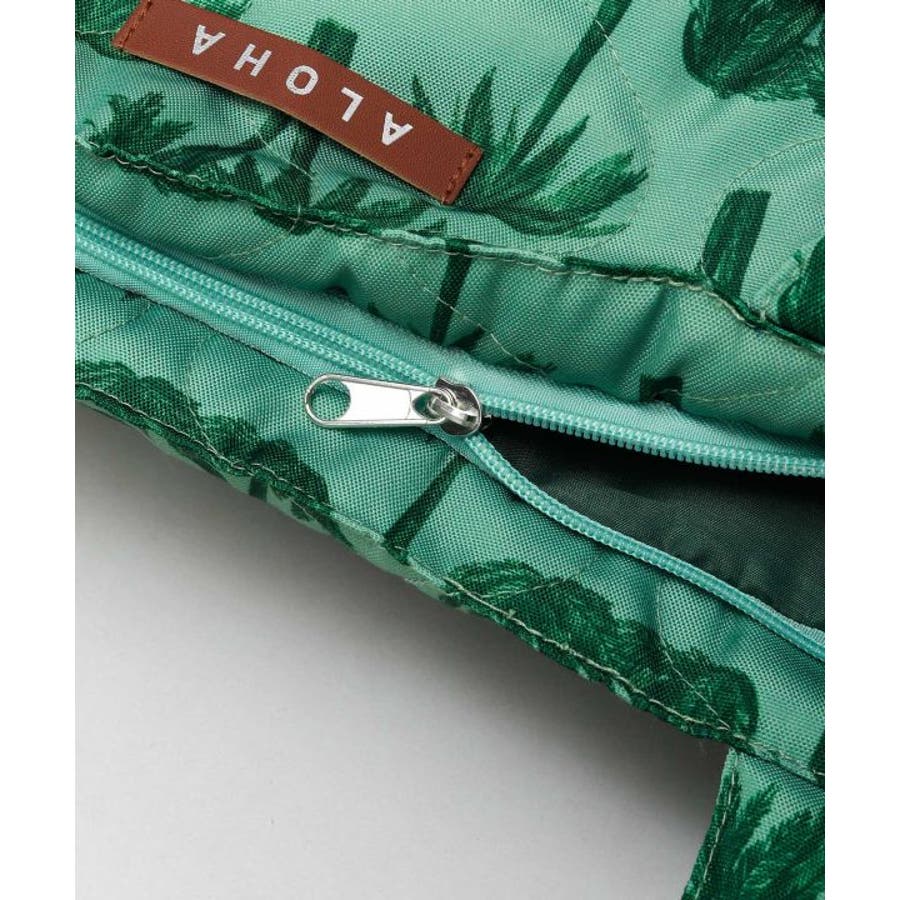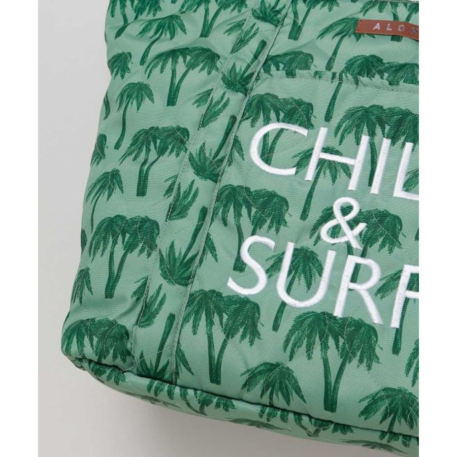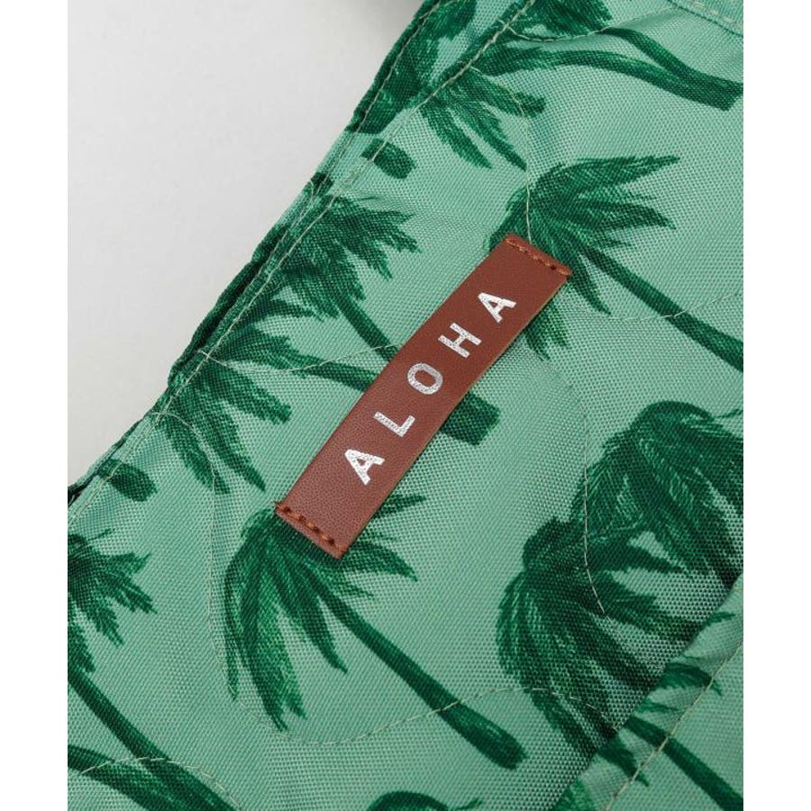 全面総柄のキルティングのバッグ。ファスナーが付いていて、外と内側にポケットがあり、とても使いやすいです。ALOHAのタグと刺しゅうがポイント。大きくて軽く、しっかりと起立するので、旅行にも便利です。持ち手がしっかりとしているので、重い荷物でも持ちやすいです。