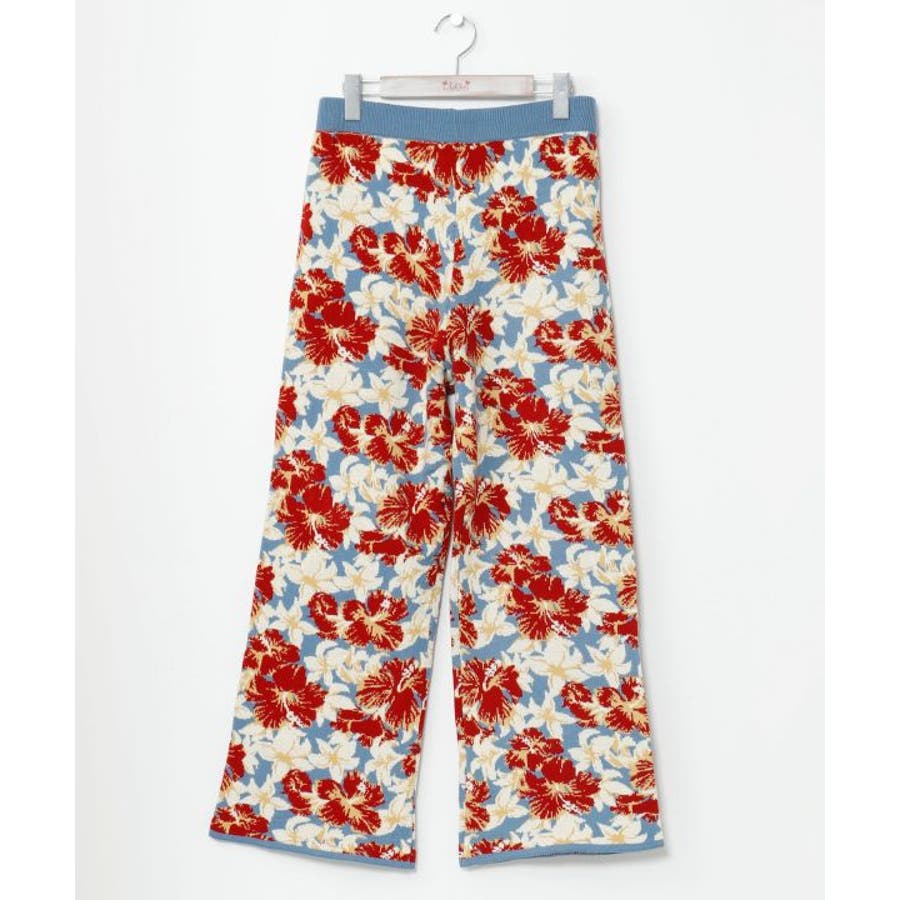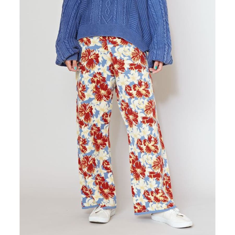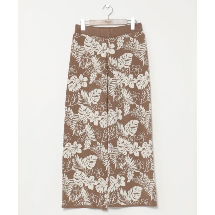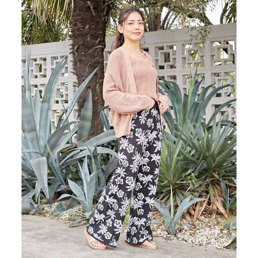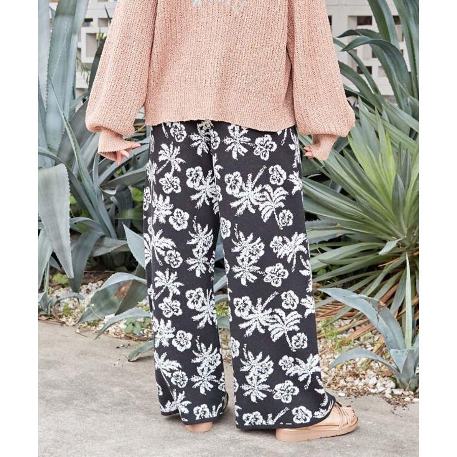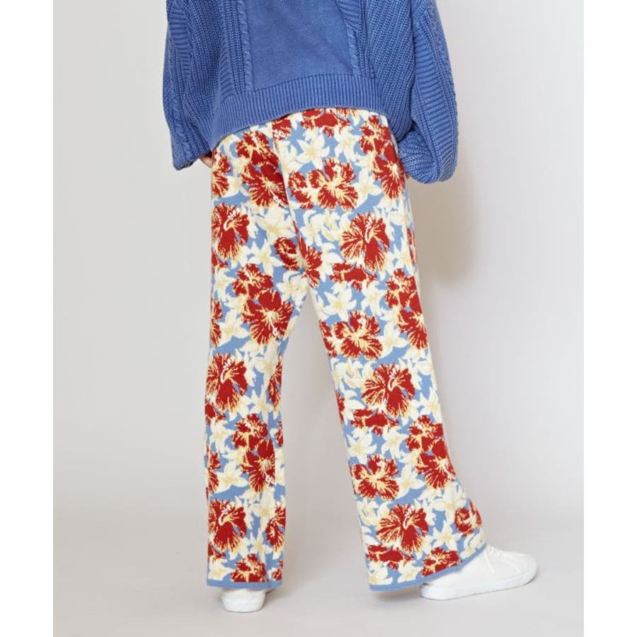 ゆったりと着られるニット素材のイージーパンツ。着心地の良さだけでなく、フレアなシルエットがスタイルアップにもつながります。それぞれの色味に合わせて描かれたハワイアン柄とともに、リラックスしたハワイアンタイムをお過ごしください。