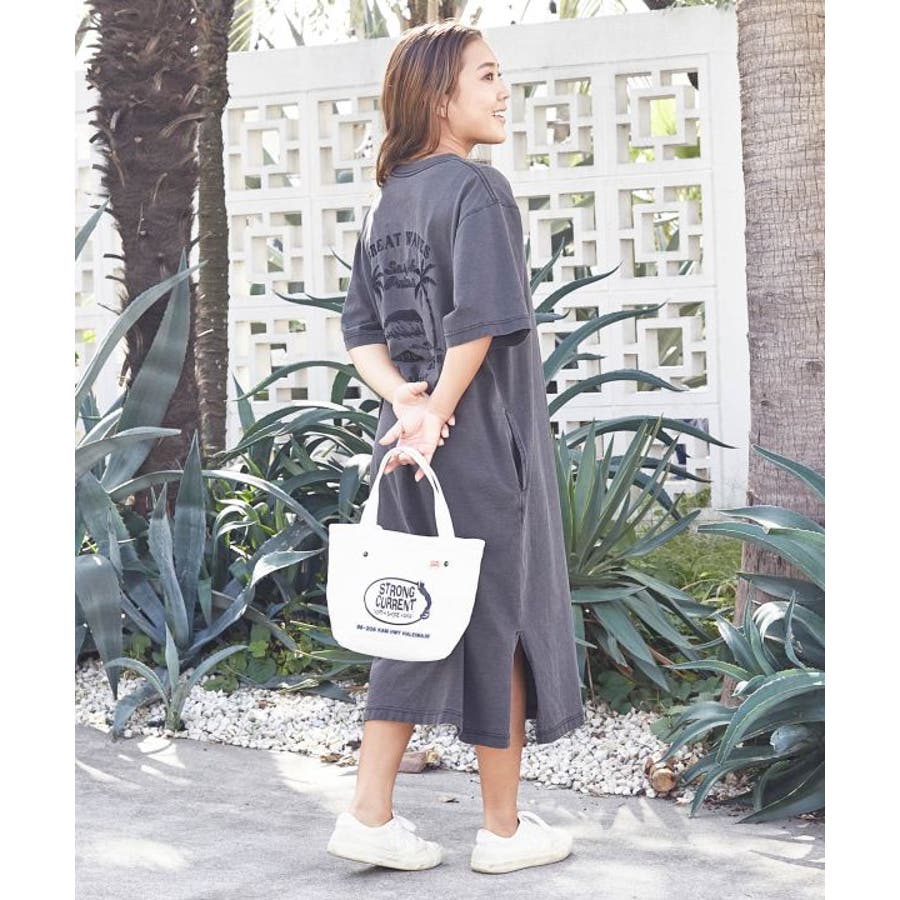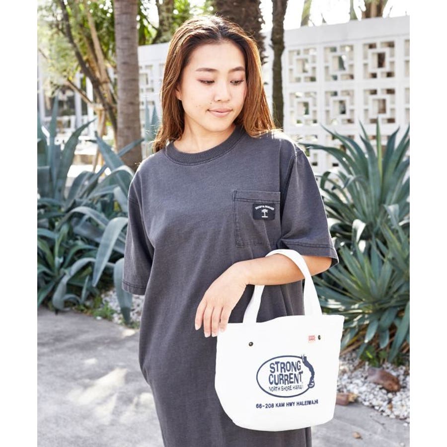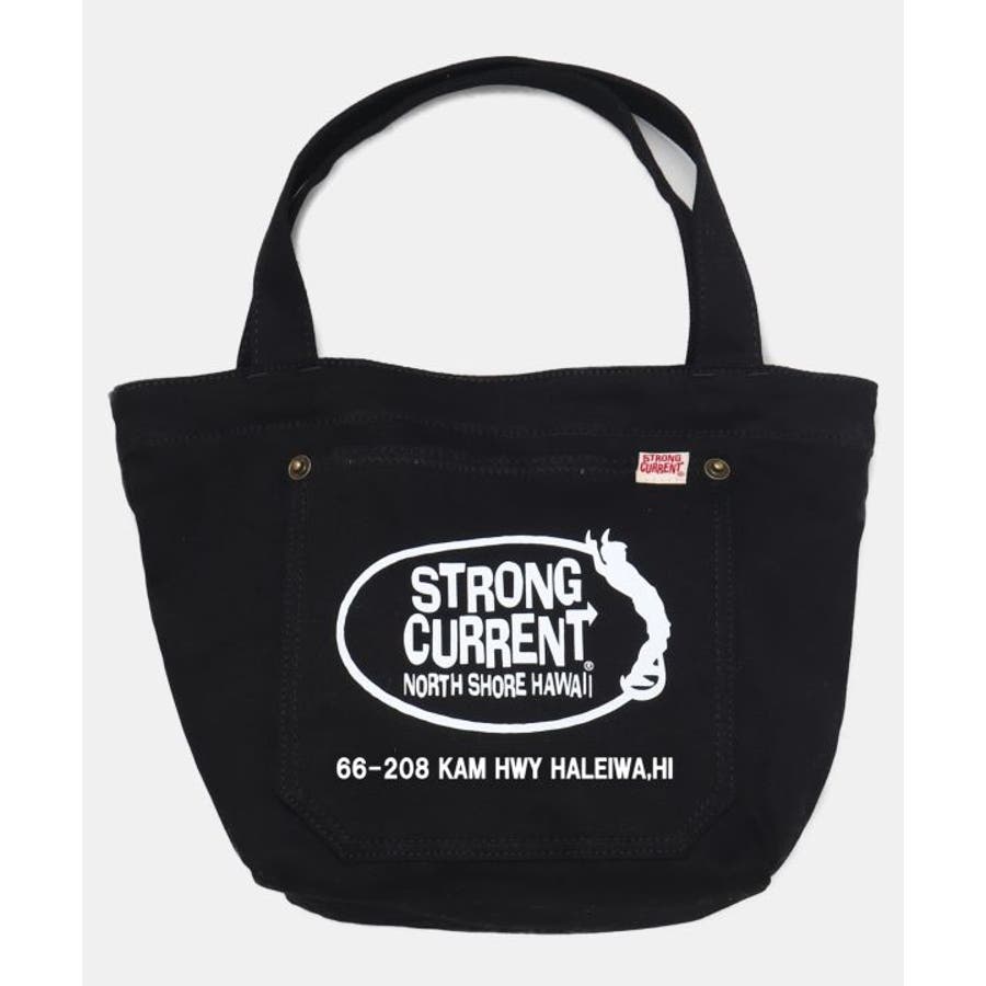 【Kahiko×STRONG CURRENT】大胆に入ったロゴが印象的なツイルミニトート。パンツポケットのようなデザインがポイント。日常使いに便利なサイズ感。