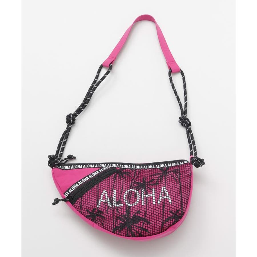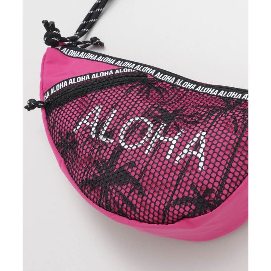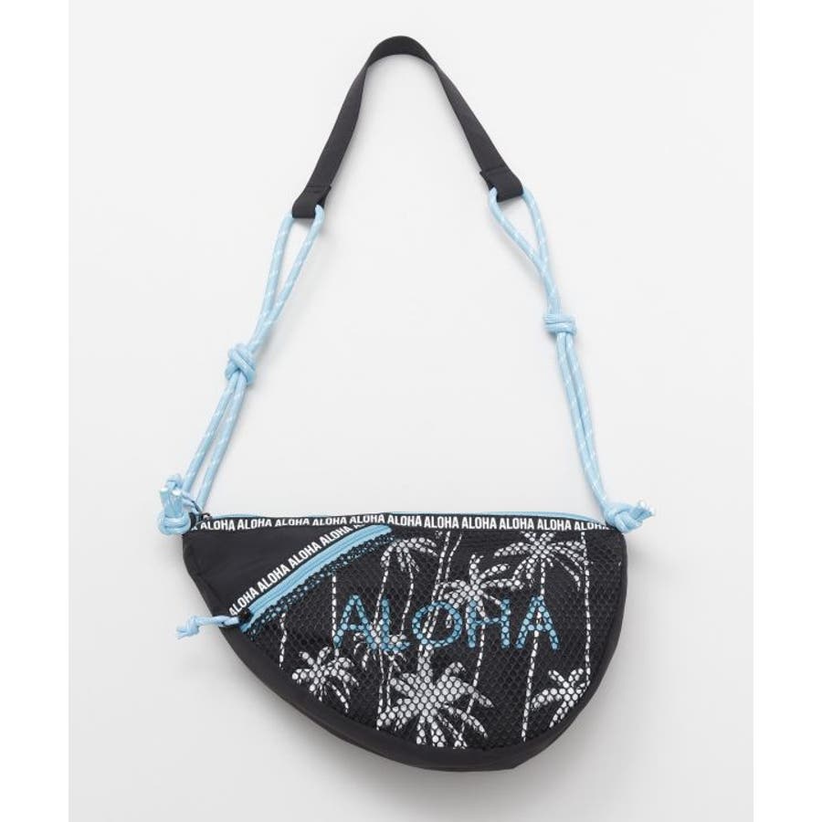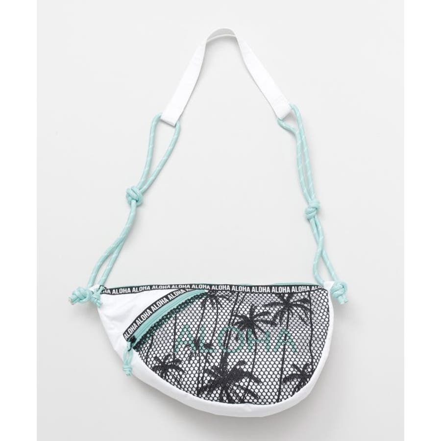スポーティなカラーリングのメッシュポケット付きショルダーバッグ。パームツリーのシルエットとメッシュの外ポケットがポイント。三日月型なので収納力もあり、アクティブシーンにおすすめです。