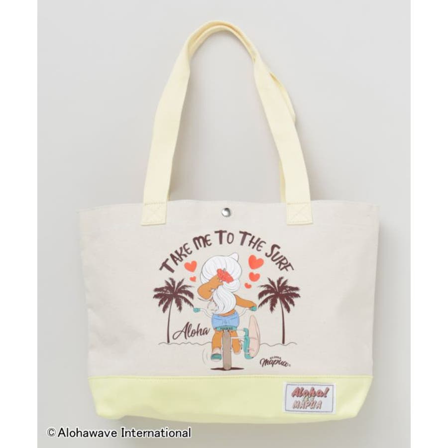 【Kahiko×Aloha Mapua】サーフィンとファッションをこよなく愛するキャラクター「Aloha Mapua(アロハマプア)」の世界観が詰まったトートバッグ。ハワイの海と太陽を感じる明るいプリントがポイント。マチ付きで収納力があり、デイリー使いからおでかけまで幅広く活躍。軽やかな綿素材で持ち心地も快適。